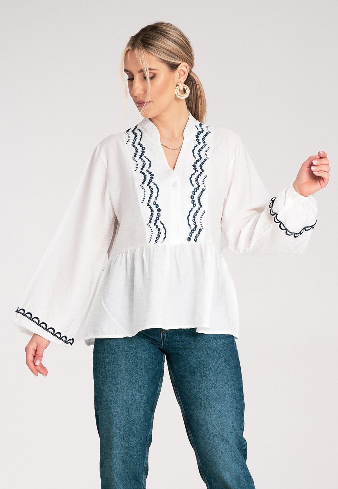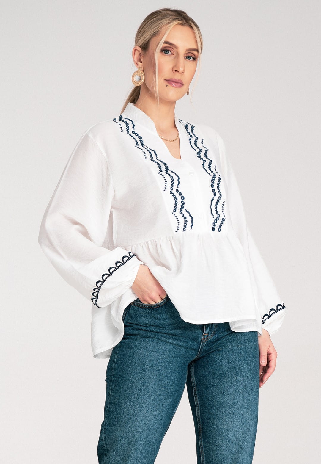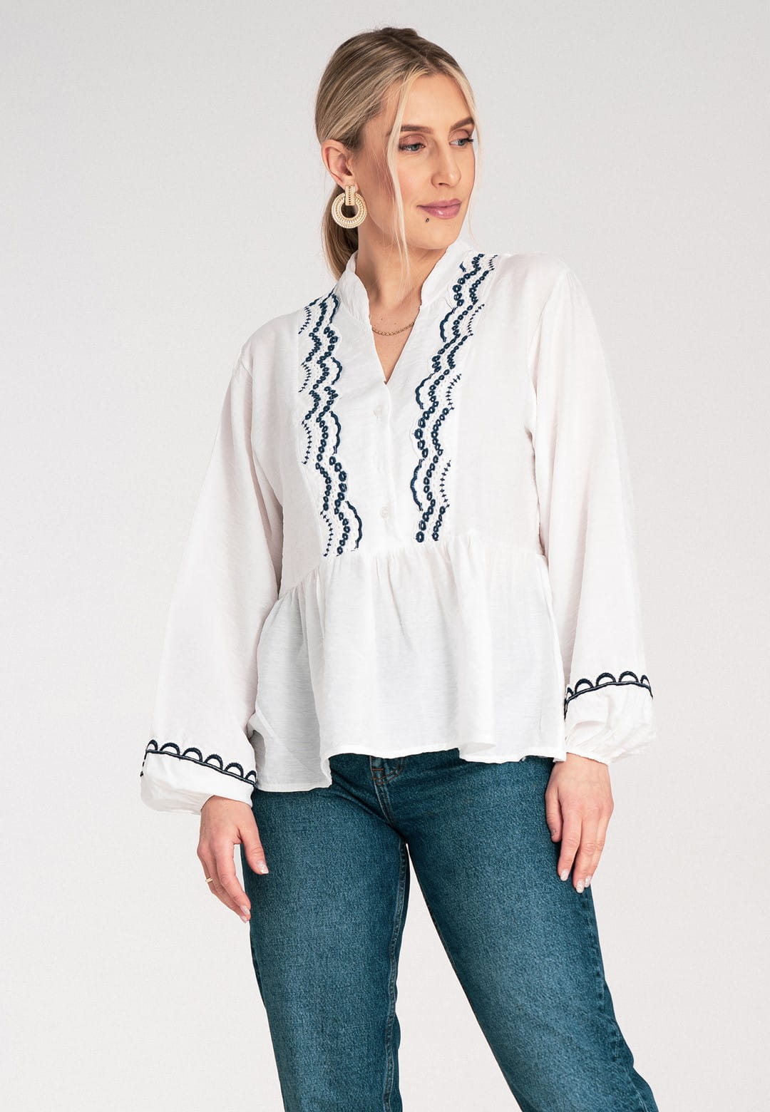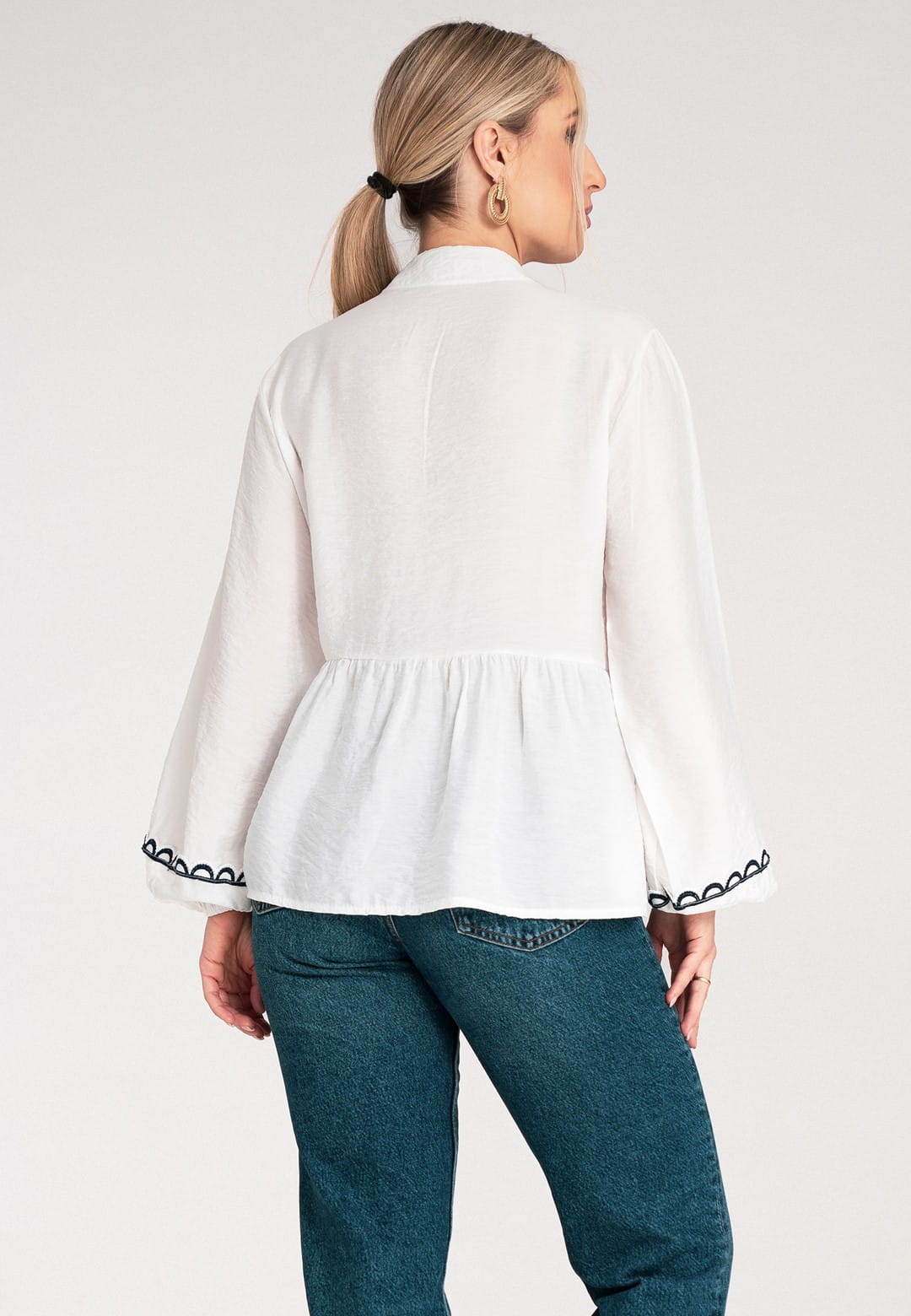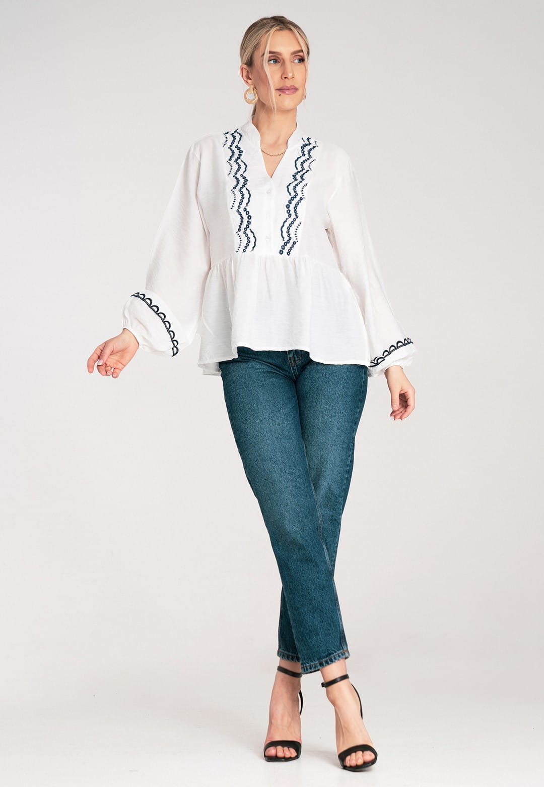 Biała bluzka z długim rękawem łączy w sobie klasykę z nutą romantyzmu. Wykonana z połączenia wiskozy i nylonu. Połączenie wiskozy zapewnia miękkość i przewiewność, a nylon zwiększa trwałość i odporność na zagniecenia. Delikatna faktura materiału nadaje bluzce unikalny charakter i sprawia, że jest przyjemna w dotyku. Dekolt w serek ze stójką to stylowe połączenie, które optycznie wysmukla szyję i dodaje szyku. Zapinana z przodu na trzy guziki ułatwia zakładanie, a guziki stanowią elegancki detal. Ozdobny haft na przodzie dodaje bluzce uroku i podkreśla jej wyjątkowość. Odcięcie pod biustem podkreśla talię, a jednocześnie zapewnia swobodę ruchów. Szerokie rękawy zakończone elastyczną gumką i ozdobną lamówką są komfortowe i modne, można je regulować, dopasowując do własnych preferencji. Luźny krój rozkloszowany na dole w formie falbany daje lekkość i zwiewność, idealny na każdą figurę. Bluzka biała z długim rękawem to idealny wybór dla kobiet ceniących elegancję, wygodę i niepowtarzalny styl. Idealna zarówno do eleganckich spodni i spódnic, jak i do jeansów, tworząc casualowy, a jednocześnie szykowny look.