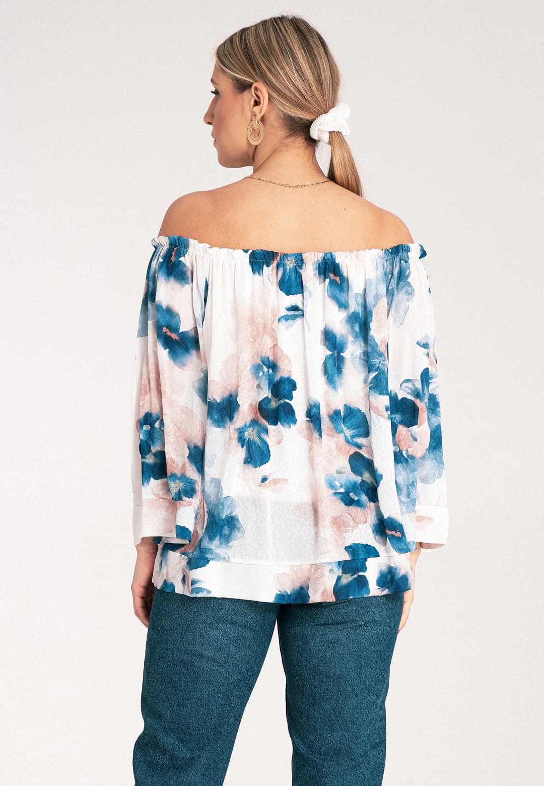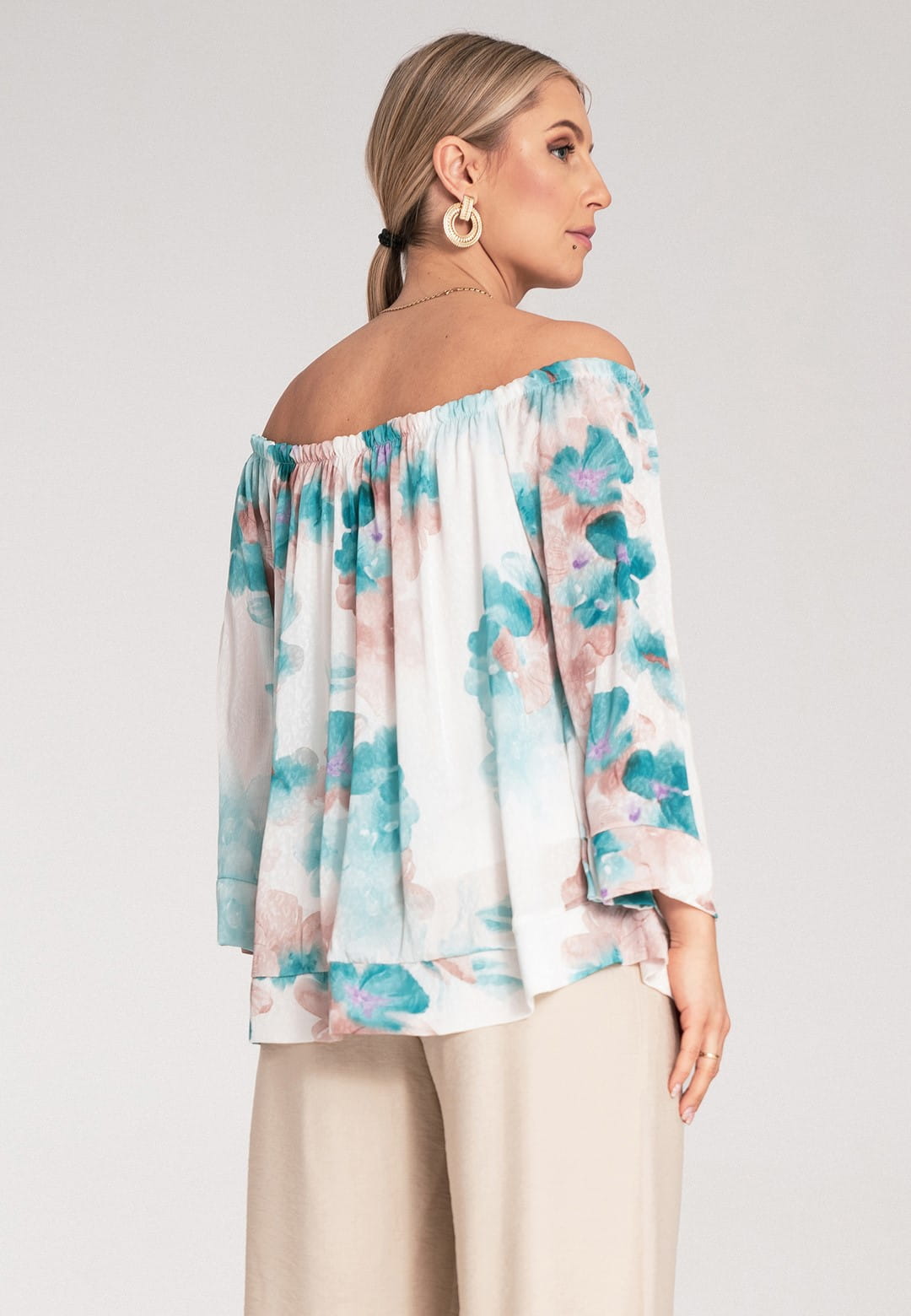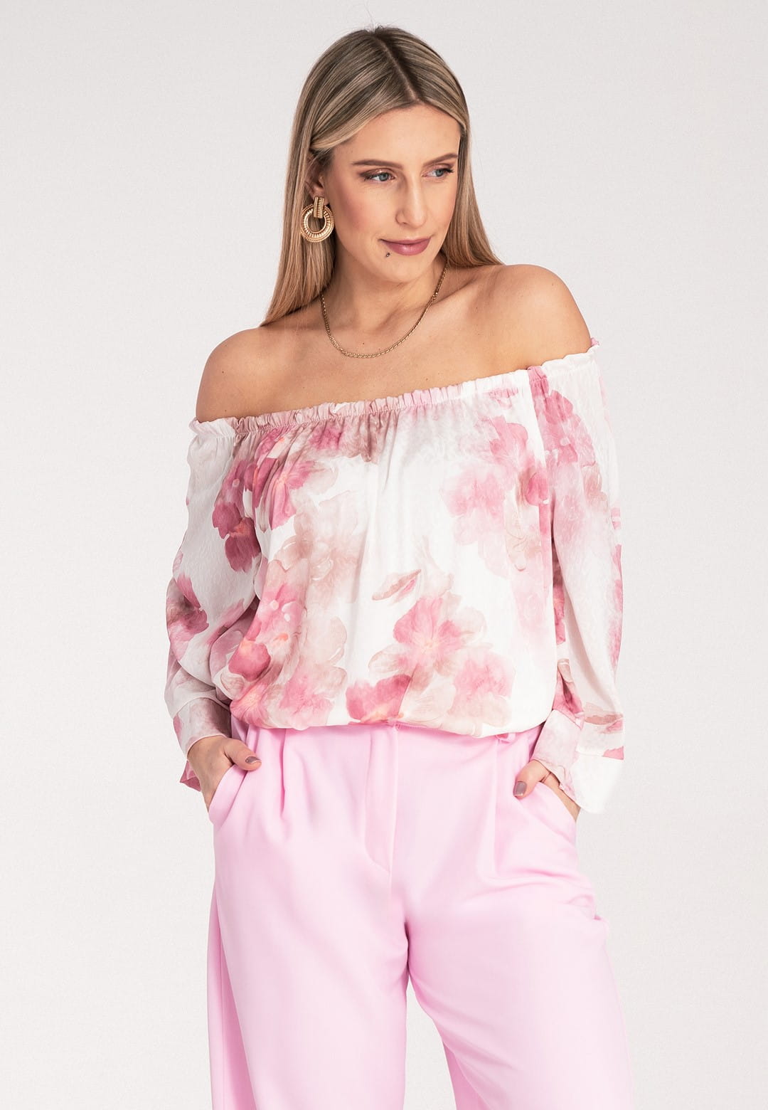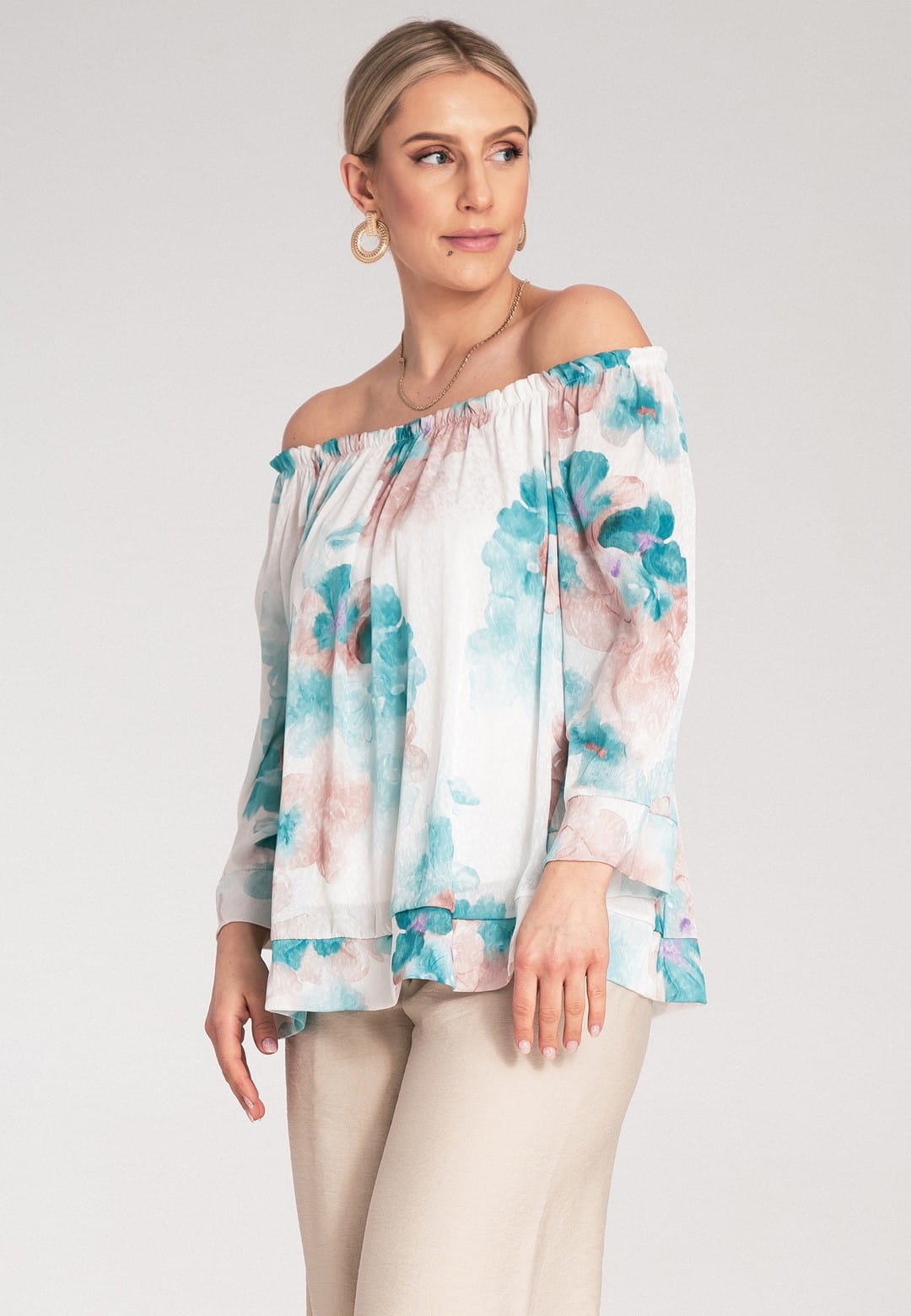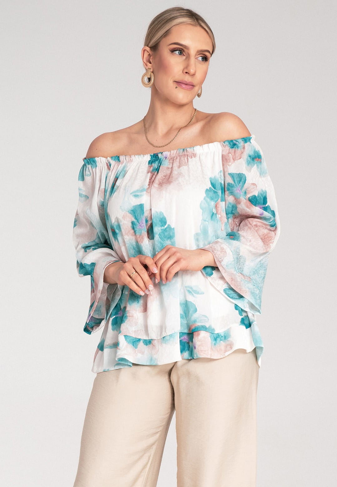 Bluzka hiszpanka zachwyca kobiecością i lekkością. Kwiatowy wzór w delikatne i barwne kwiaty nadaje bluzce romantycznego i modnego charakteru. Szeroki, elastyczny dekolt typu hiszpanka podkreśla ramiona i dekolt, dodając stylizacji zmysłowości. Dzięki gumce dopasuje się idealnie do Twojej sylwetki. Szerokie rękawy długości 3/4 zakończone mankietem zapewniają swobodę ruchu i dodają bluzce elegancji. Falbana u dołu dodaje bluzce lekkości i wdzięku, idealnie maskując ewentualne niedoskonałości. Luźny krój zapewnia maksymalny komfort noszenia, bez ucisku. Mimo, że materiał zewnętrzny to poliester, podszewka z wiskozy sprawia, że bluzka jest przyjemna dla skóry i zapewnia odpowiednią cyrkulację powietrza. Hiszpanka bluzka to idealny wybór na letnie dni, festiwale i romantyczne wieczory. Połącz ją z sandałkami lub espadrylami, a dodając lekką biżuterię stworzysz wyjątkową, letnią stylizację.