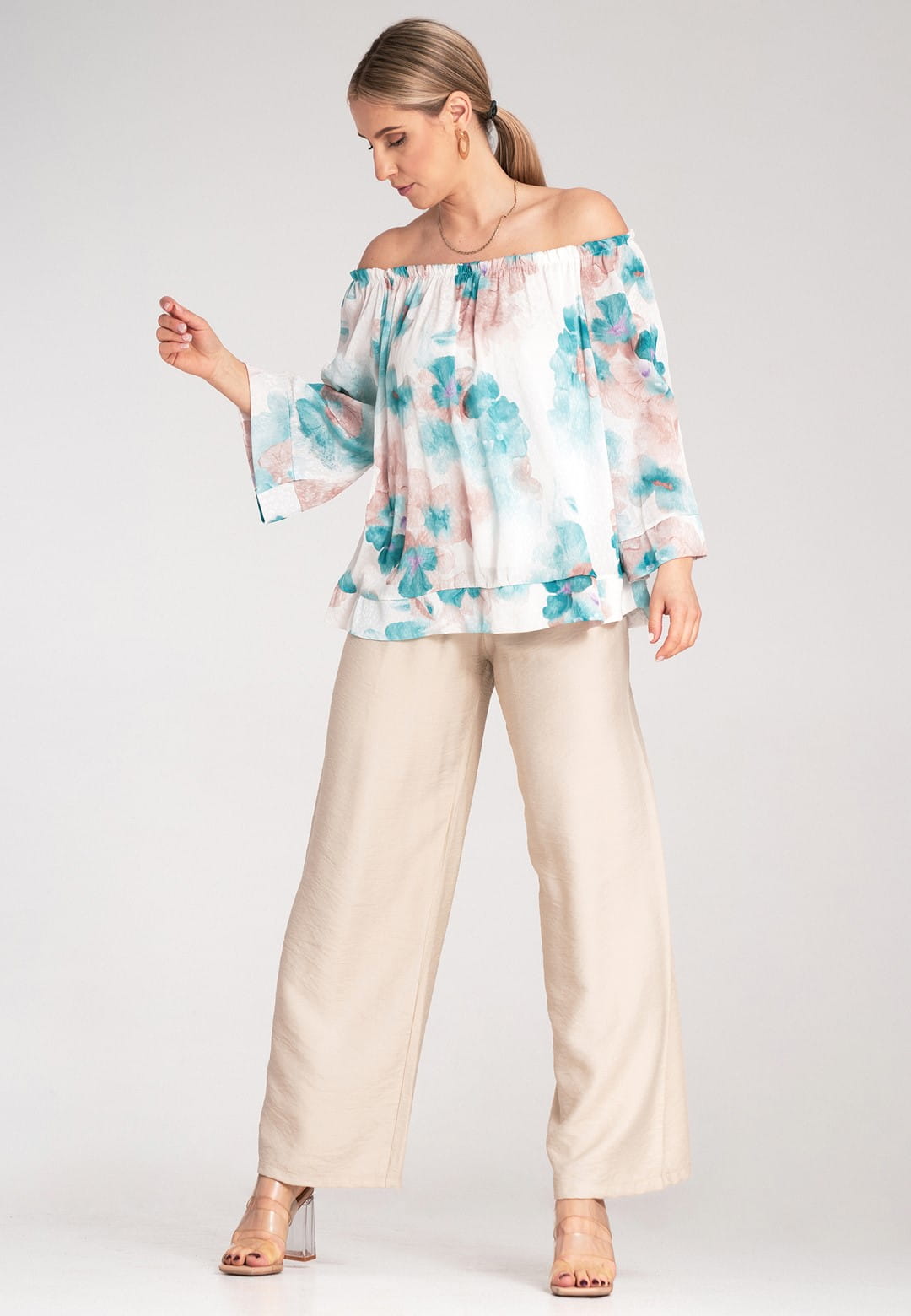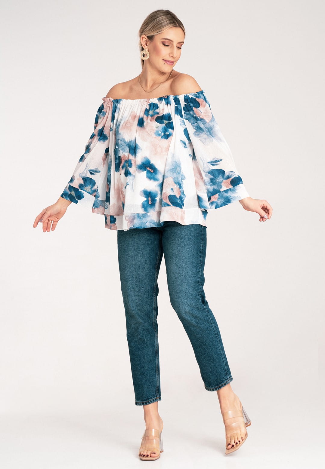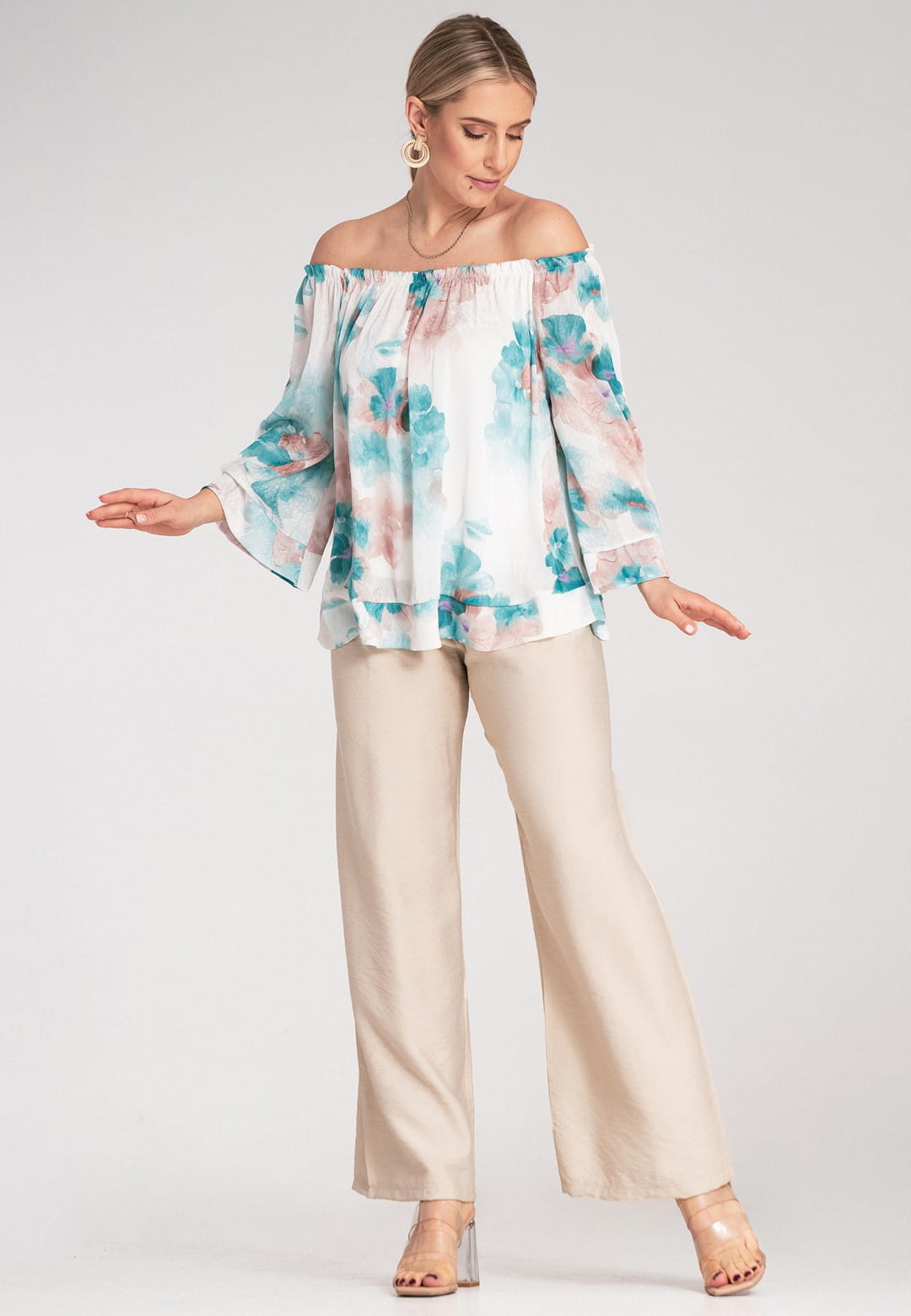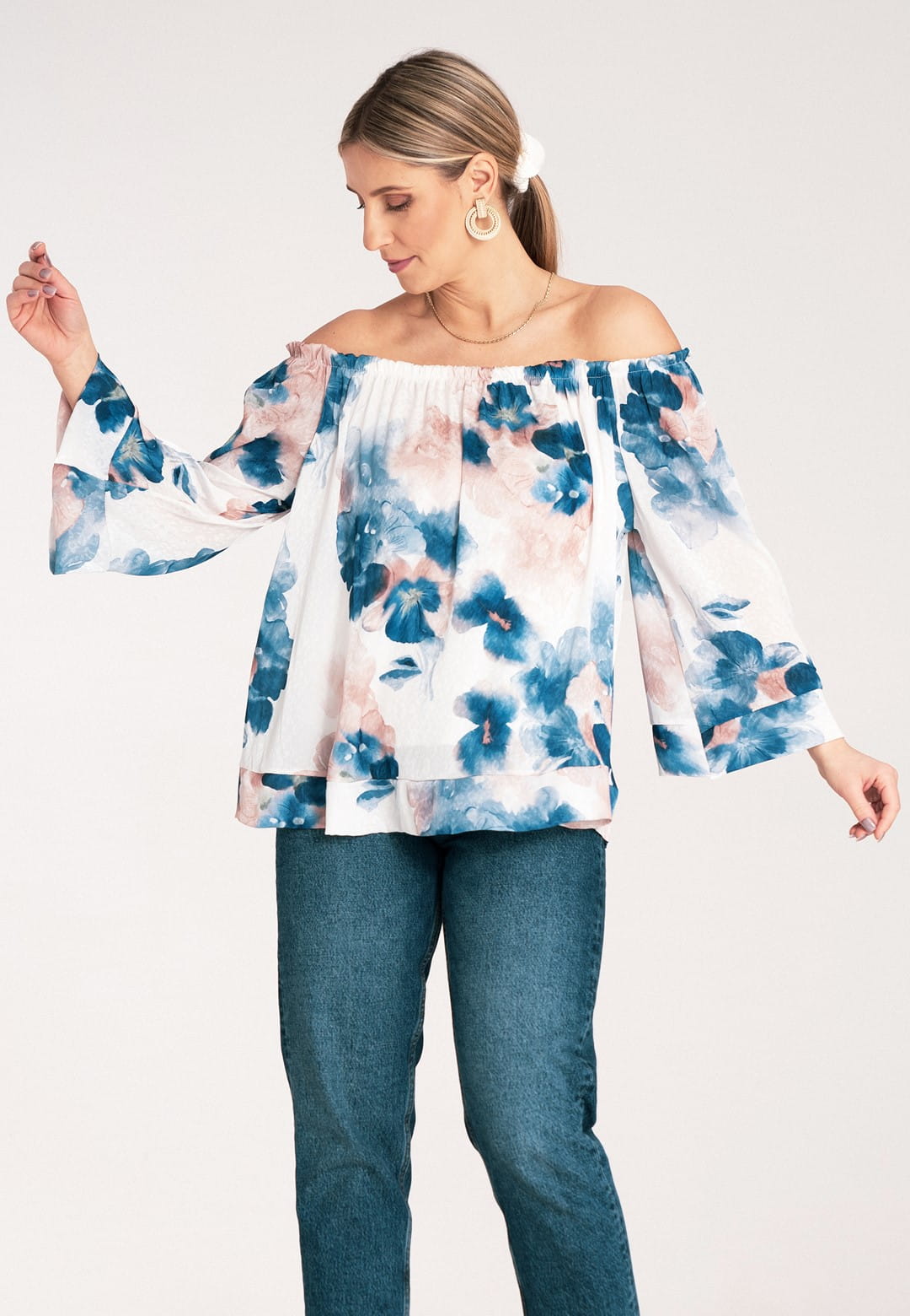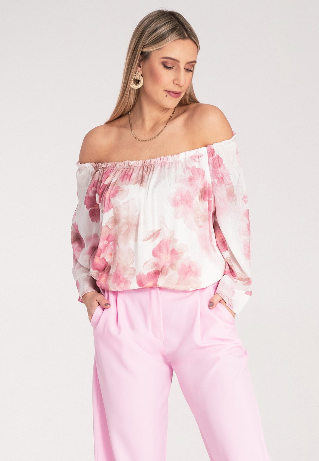 Bluzka hiszpanka zachwyca kobiecością i lekkością. Kwiatowy wzór w delikatne i barwne kwiaty nadaje bluzce romantycznego i modnego charakteru. Szeroki, elastyczny dekolt typu hiszpanka podkreśla ramiona i dekolt, dodając stylizacji zmysłowości. Dzięki gumce dopasuje się idealnie do Twojej sylwetki. Szerokie rękawy długości 3/4 zakończone mankietem zapewniają swobodę ruchu i dodają bluzce elegancji. Falbana u dołu dodaje bluzce lekkości i wdzięku, idealnie maskując ewentualne niedoskonałości. Luźny krój zapewnia maksymalny komfort noszenia, bez ucisku. Mimo, że materiał zewnętrzny to poliester, podszewka z wiskozy sprawia, że bluzka jest przyjemna dla skóry i zapewnia odpowiednią cyrkulację powietrza. Hiszpanka bluzka to idealny wybór na letnie dni, festiwale i romantyczne wieczory. Połącz ją z sandałkami lub espadrylami, a dodając lekką biżuterię stworzysz wyjątkową, letnią stylizację.