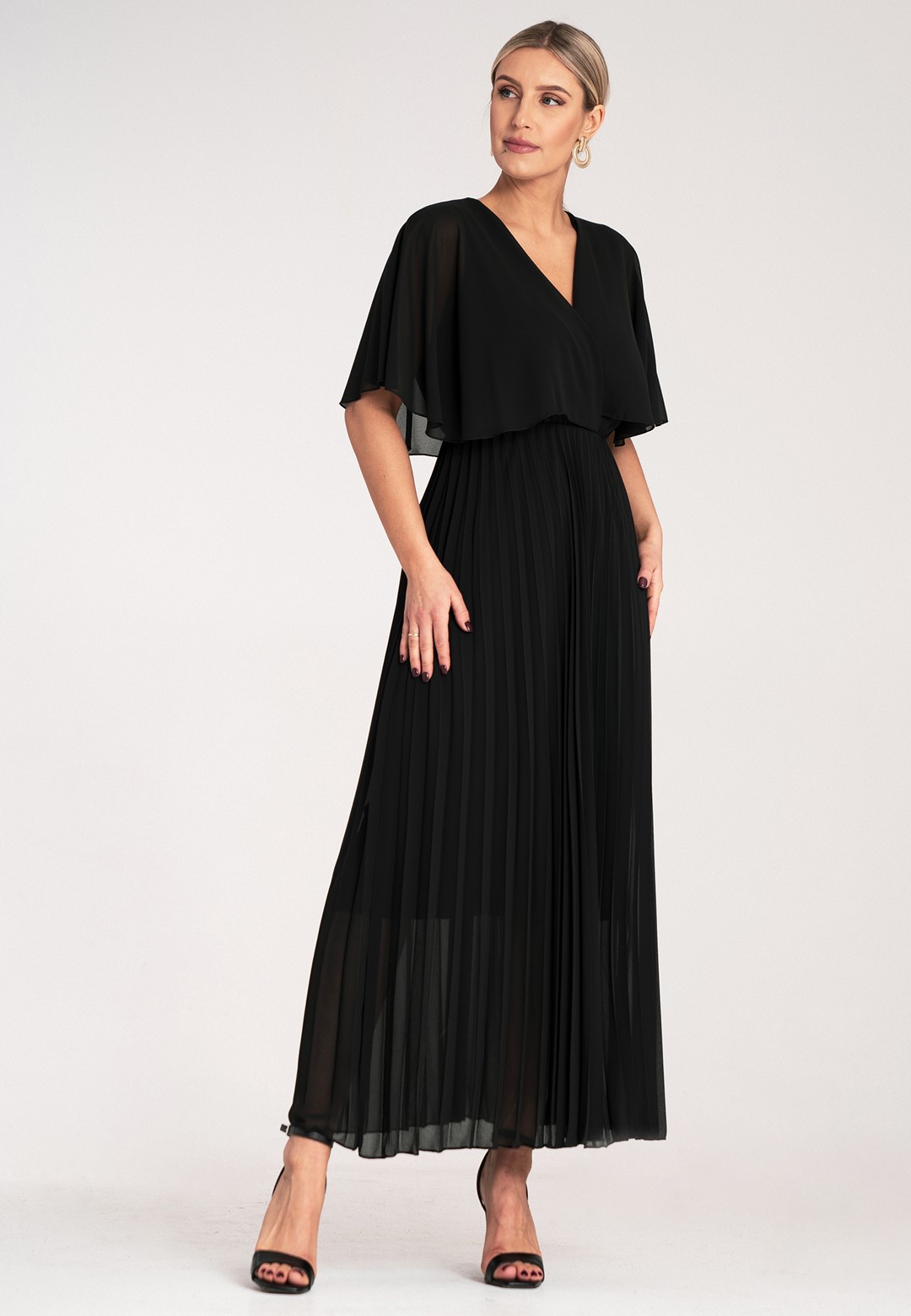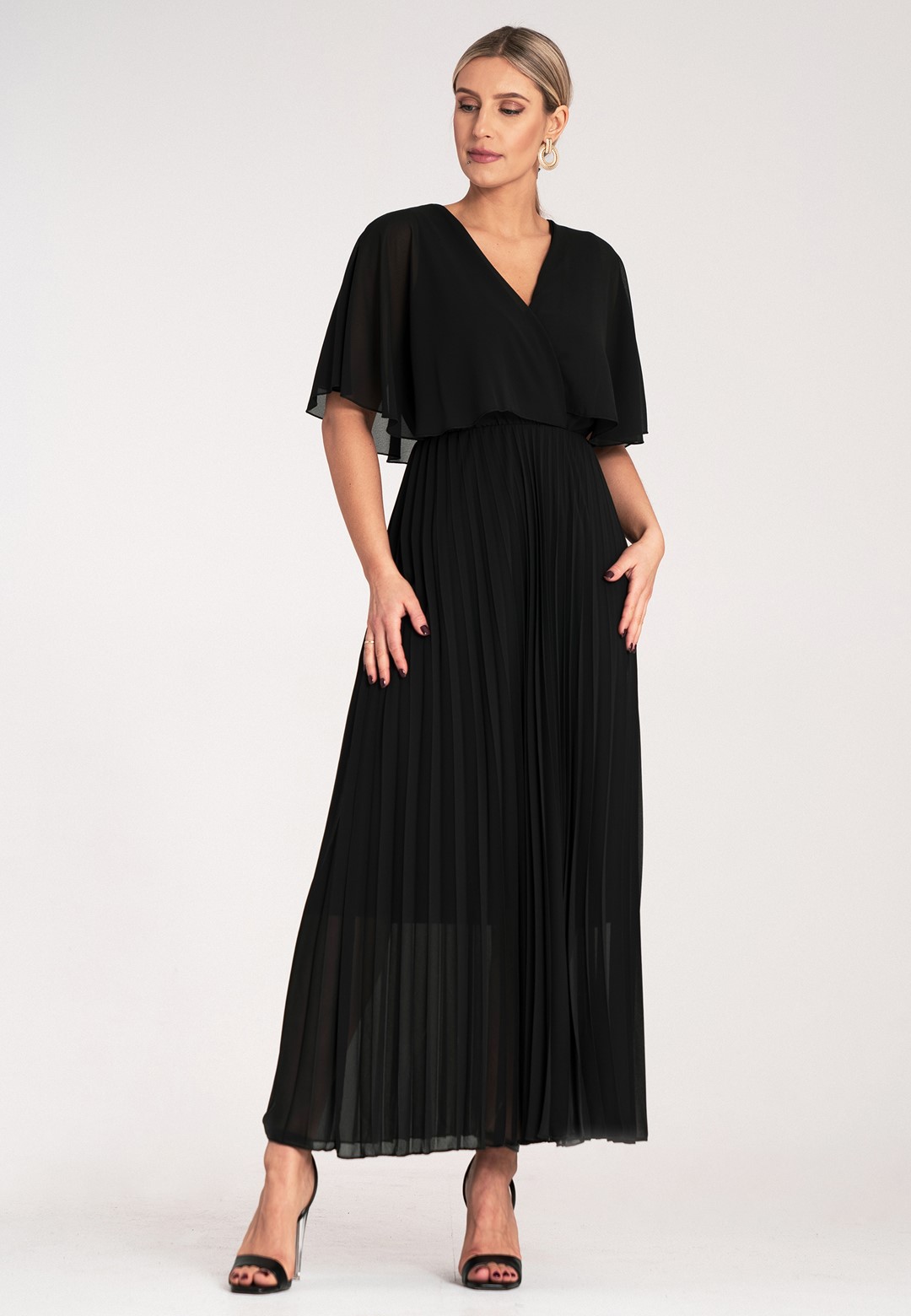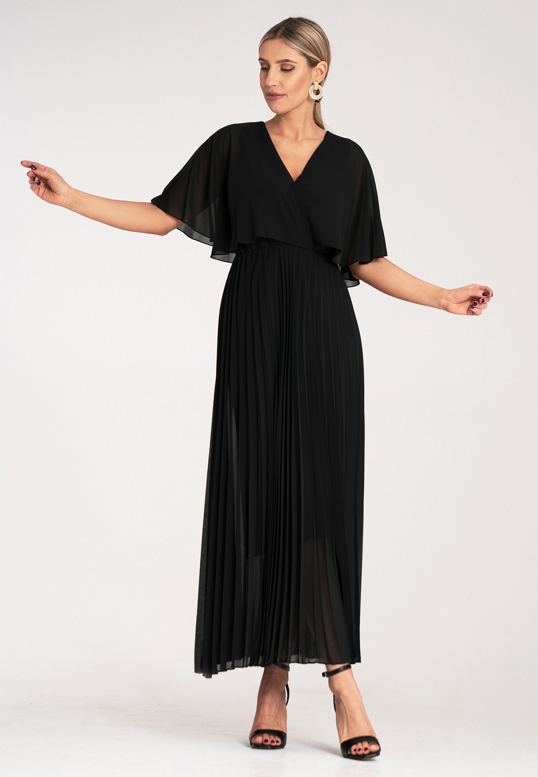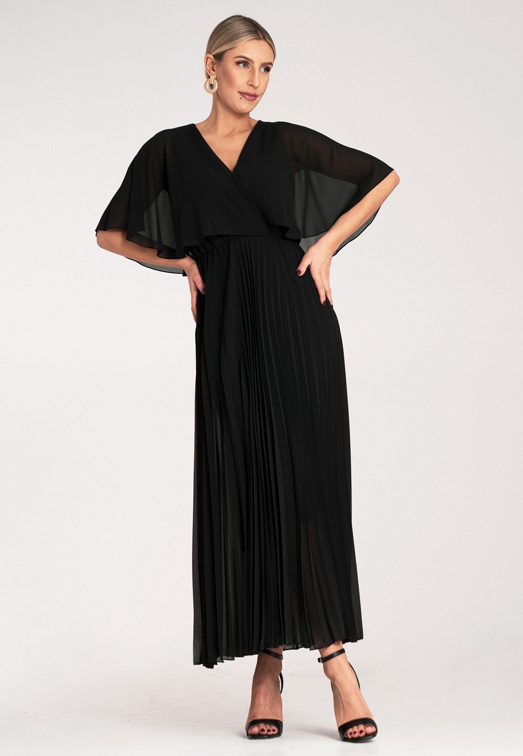 Długa sukienka wieczorowa to połączenie hollywoodzkiego szyku z niesamowitą wygodą. Ten model został zaprojektowany z myślą o kobietach, które chcą czuć się lekko, pewnie i niezwykle kobieco podczas najważniejszych uroczystości. Sukienka długa wieczorowa o kroju maxi to ponadczasowy wybór, który nigdy nie wychodzi z mody, co sprawia, że jest ona taka wyjątkowa. Dekolt w kształcie litery V optycznie wysmukla szyję i pięknie eksponuje dekolt, dodając sylwetce lekkości. Półprzezroczyste rękawy a'la peleryna to prawdziwy „efekt wow”. Luźne rękawy przypominające pelerynę nie tylko maskują ramiona, ale dodają całej stylizacji eterycznego, niemal posągowego charakteru. Elastyczna gumka w pasie podkreśla talię i sprawia, że sukienka idealnie dopasowuje się do sylwetki, zapewniając komfort przez całą noc – nawet na parkiecie. Plisowany dół to synonim elegancji. W ruchu dół sukienki pracuje niesamowicie, tworząc dynamiczny i luksusowy look. Wnętrze sukienki kryje podszewkę z wiskozy. Wiskoza jest naturalnym materiałem, który „oddycha” i jest niezwykle przyjemny dla skóry. Zewnętrzna warstwa z wysokiej jakości poliestru gwarantuje natomiast trwałość koloru oraz to, że nie będzie się gniotła podczas siedzenia przy stole czy podróży na uroczystość. Efektowna długość maxi daje pewność siebie i optycznie dodaje wzrostu. Sukienka wieczorowa długa idealna na wesela, gale, bale karnawałowe czy eleganckie kolacje. Wystarczą delikatne sandałki na szpilce i minimalistyczna biżuteria, by wyglądać jak z czerwonego dywanu.