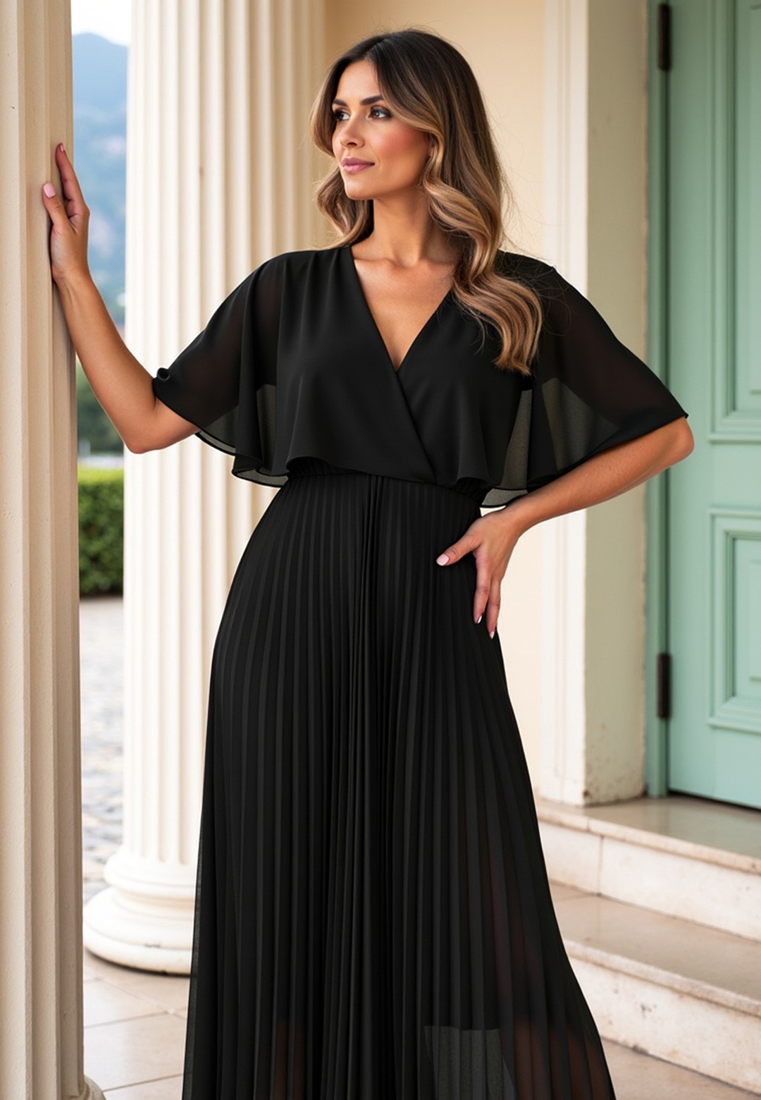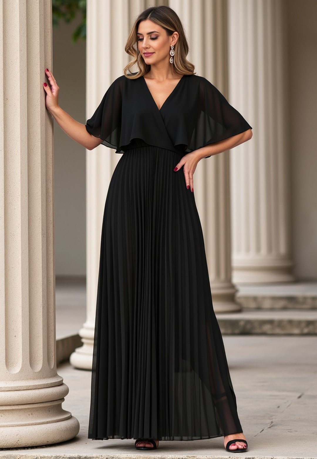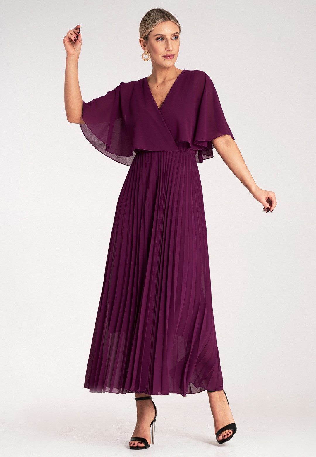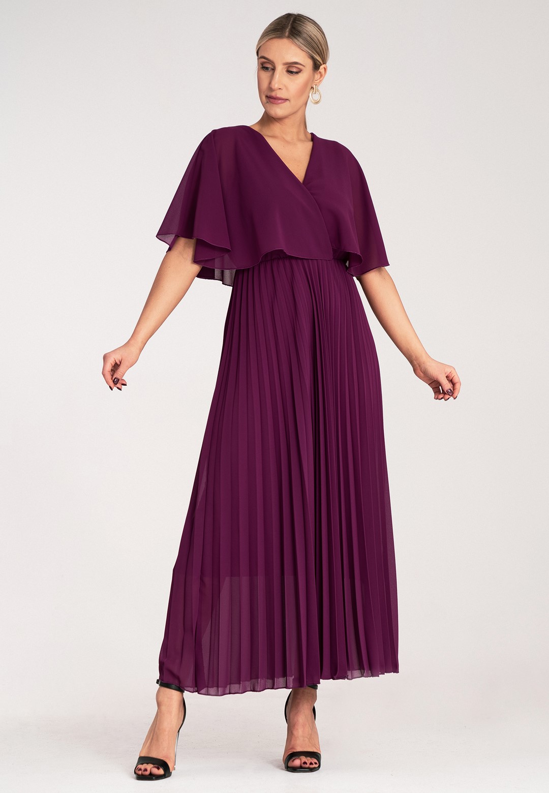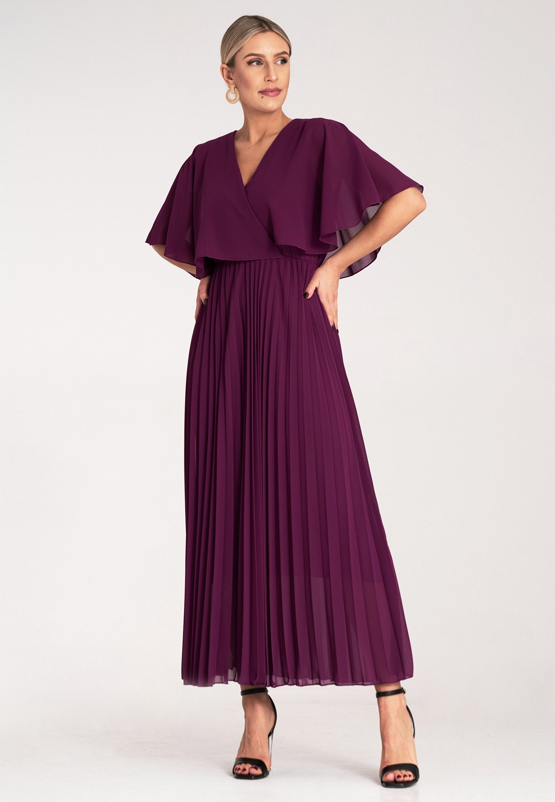 Długa sukienka wieczorowa to połączenie hollywoodzkiego szyku z niesamowitą wygodą. Ten model został zaprojektowany z myślą o kobietach, które chcą czuć się lekko, pewnie i niezwykle kobieco podczas najważniejszych uroczystości. Sukienka długa wieczorowa o kroju maxi to ponadczasowy wybór, który nigdy nie wychodzi z mody, co sprawia, że jest ona taka wyjątkowa. Dekolt w kształcie litery V optycznie wysmukla szyję i pięknie eksponuje dekolt, dodając sylwetce lekkości. Półprzezroczyste rękawy a'la peleryna to prawdziwy „efekt wow”. Luźne rękawy przypominające pelerynę nie tylko maskują ramiona, ale dodają całej stylizacji eterycznego, niemal posągowego charakteru. Elastyczna gumka w pasie podkreśla talię i sprawia, że sukienka idealnie dopasowuje się do sylwetki, zapewniając komfort przez całą noc – nawet na parkiecie. Plisowany dół to synonim elegancji. W ruchu dół sukienki pracuje niesamowicie, tworząc dynamiczny i luksusowy look. Wnętrze sukienki kryje podszewkę z wiskozy. Wiskoza jest naturalnym materiałem, który „oddycha” i jest niezwykle przyjemny dla skóry. Zewnętrzna warstwa z wysokiej jakości poliestru gwarantuje natomiast trwałość koloru oraz to, że nie będzie się gniotła podczas siedzenia przy stole czy podróży na uroczystość. Efektowna długość maxi daje pewność siebie i optycznie dodaje wzrostu. Sukienka wieczorowa długa idealna na wesela, gale, bale karnawałowe czy eleganckie kolacje. Wystarczą delikatne sandałki na szpilce i minimalistyczna biżuteria, by wyglądać jak z czerwonego dywanu.