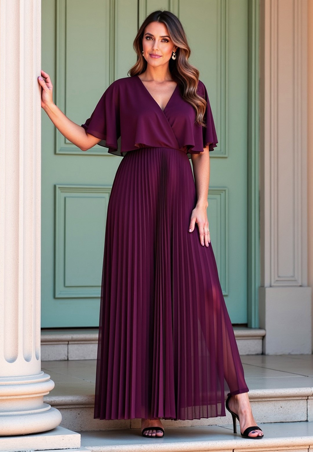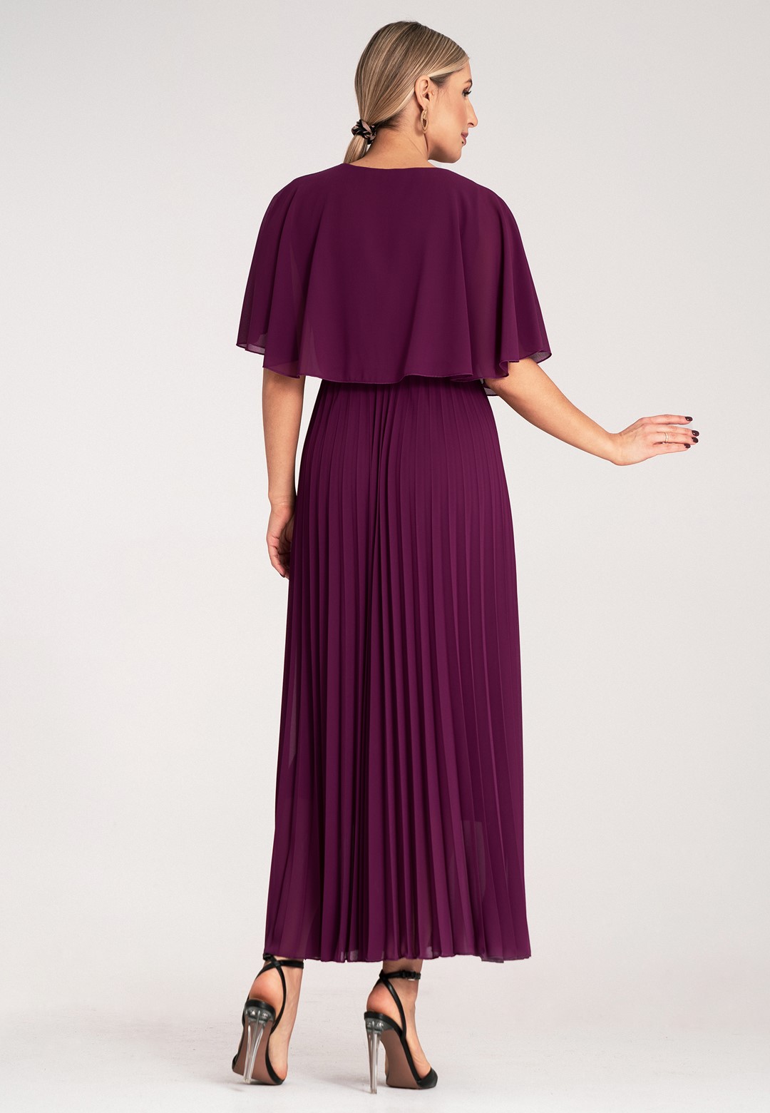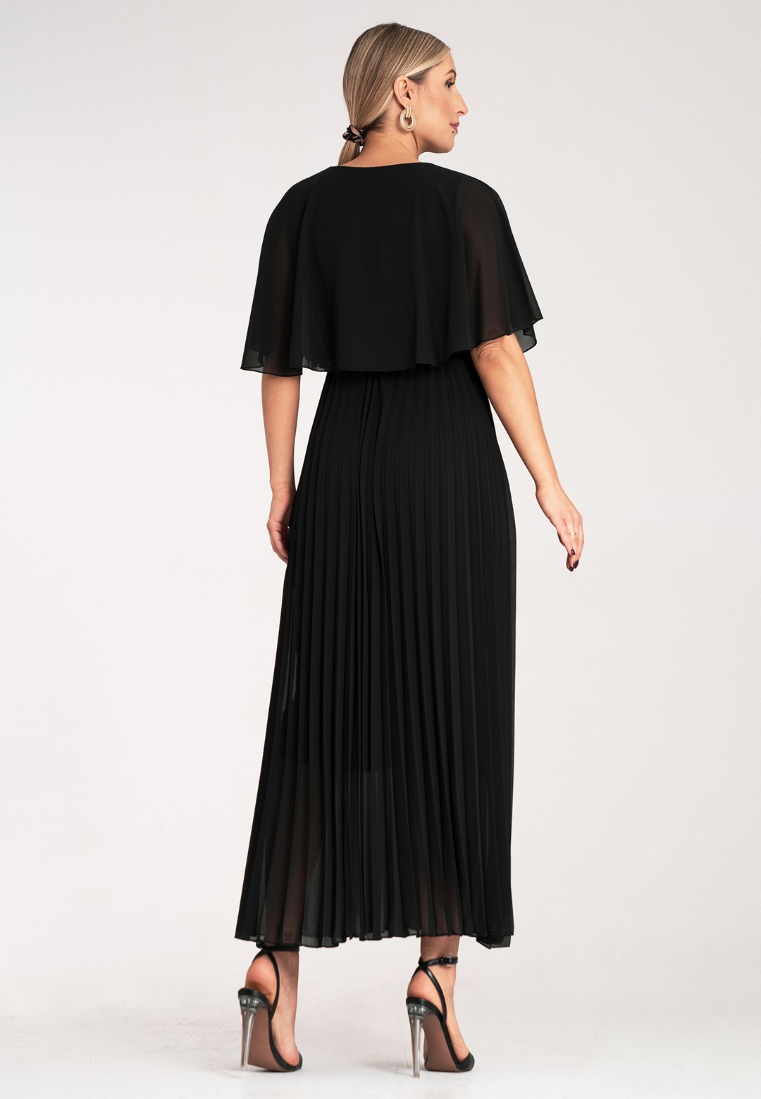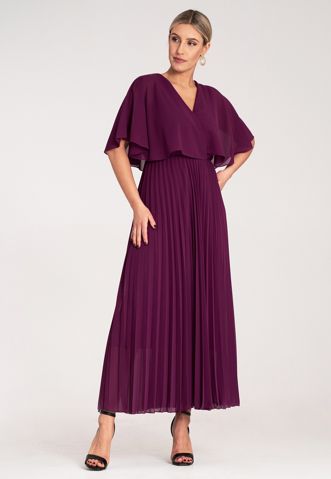 Długa sukienka wieczorowa to połączenie hollywoodzkiego szyku z niesamowitą wygodą. Ten model został zaprojektowany z myślą o kobietach, które chcą czuć się lekko, pewnie i niezwykle kobieco podczas najważniejszych uroczystości. Sukienka długa wieczorowa o kroju maxi to ponadczasowy wybór, który nigdy nie wychodzi z mody, co sprawia, że jest ona taka wyjątkowa. Dekolt w kształcie litery V optycznie wysmukla szyję i pięknie eksponuje dekolt, dodając sylwetce lekkości. Półprzezroczyste rękawy a'la peleryna to prawdziwy „efekt wow”. Luźne rękawy przypominające pelerynę nie tylko maskują ramiona, ale dodają całej stylizacji eterycznego, niemal posągowego charakteru. Elastyczna gumka w pasie podkreśla talię i sprawia, że sukienka idealnie dopasowuje się do sylwetki, zapewniając komfort przez całą noc – nawet na parkiecie. Plisowany dół to synonim elegancji. W ruchu dół sukienki pracuje niesamowicie, tworząc dynamiczny i luksusowy look. Wnętrze sukienki kryje podszewkę z wiskozy. Wiskoza jest naturalnym materiałem, który „oddycha” i jest niezwykle przyjemny dla skóry. Zewnętrzna warstwa z wysokiej jakości poliestru gwarantuje natomiast trwałość koloru oraz to, że nie będzie się gniotła podczas siedzenia przy stole czy podróży na uroczystość. Efektowna długość maxi daje pewność siebie i optycznie dodaje wzrostu. Sukienka wieczorowa długa idealna na wesela, gale, bale karnawałowe czy eleganckie kolacje. Wystarczą delikatne sandałki na szpilce i minimalistyczna biżuteria, by wyglądać jak z czerwonego dywanu.