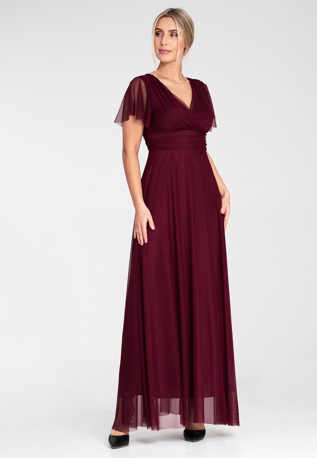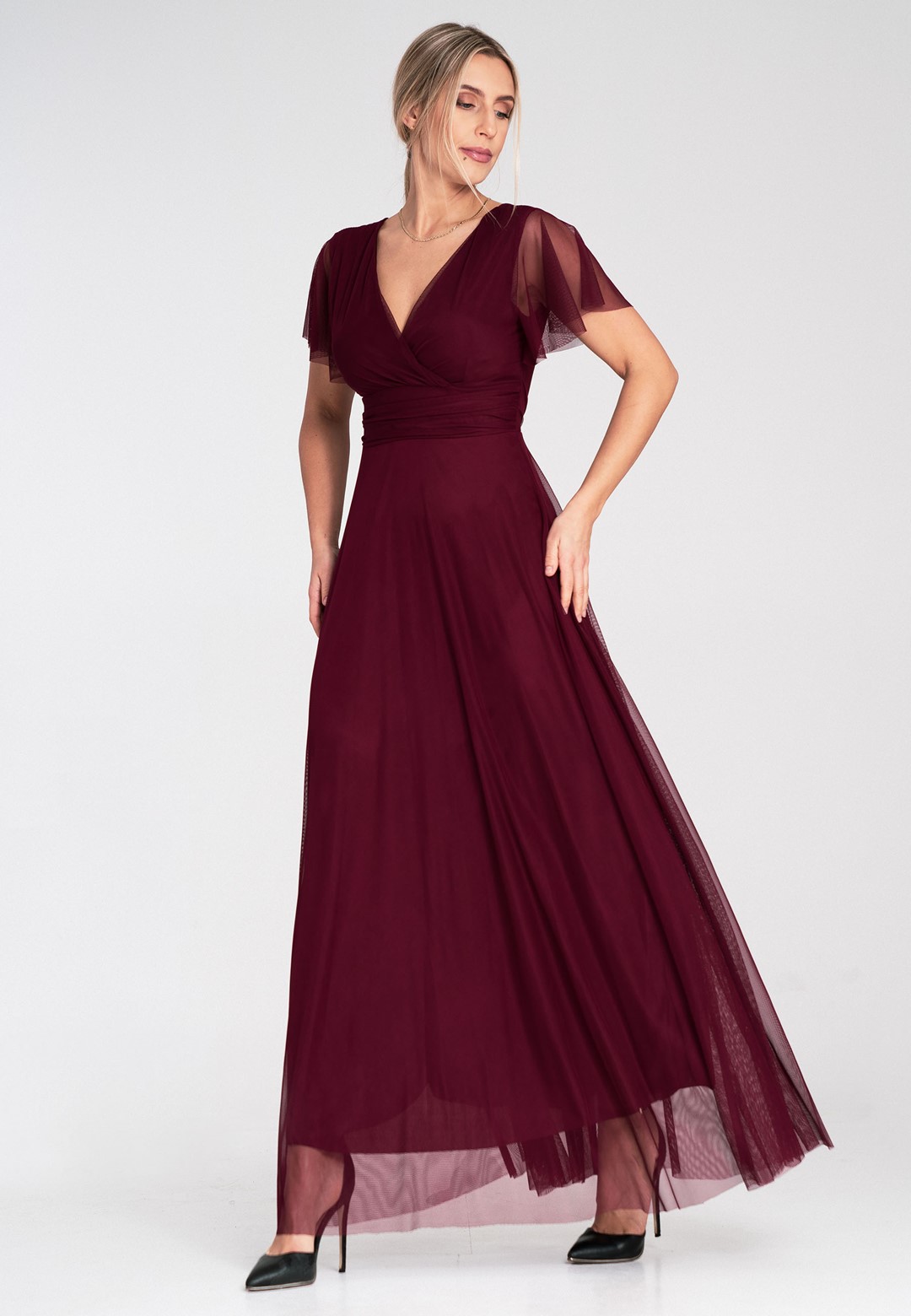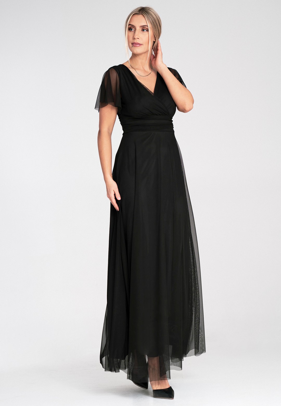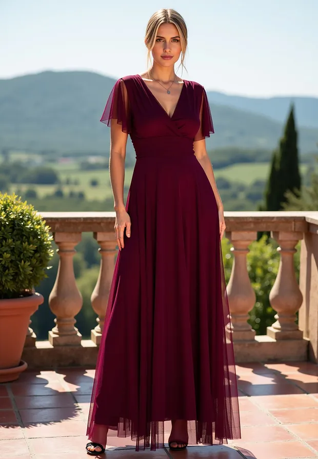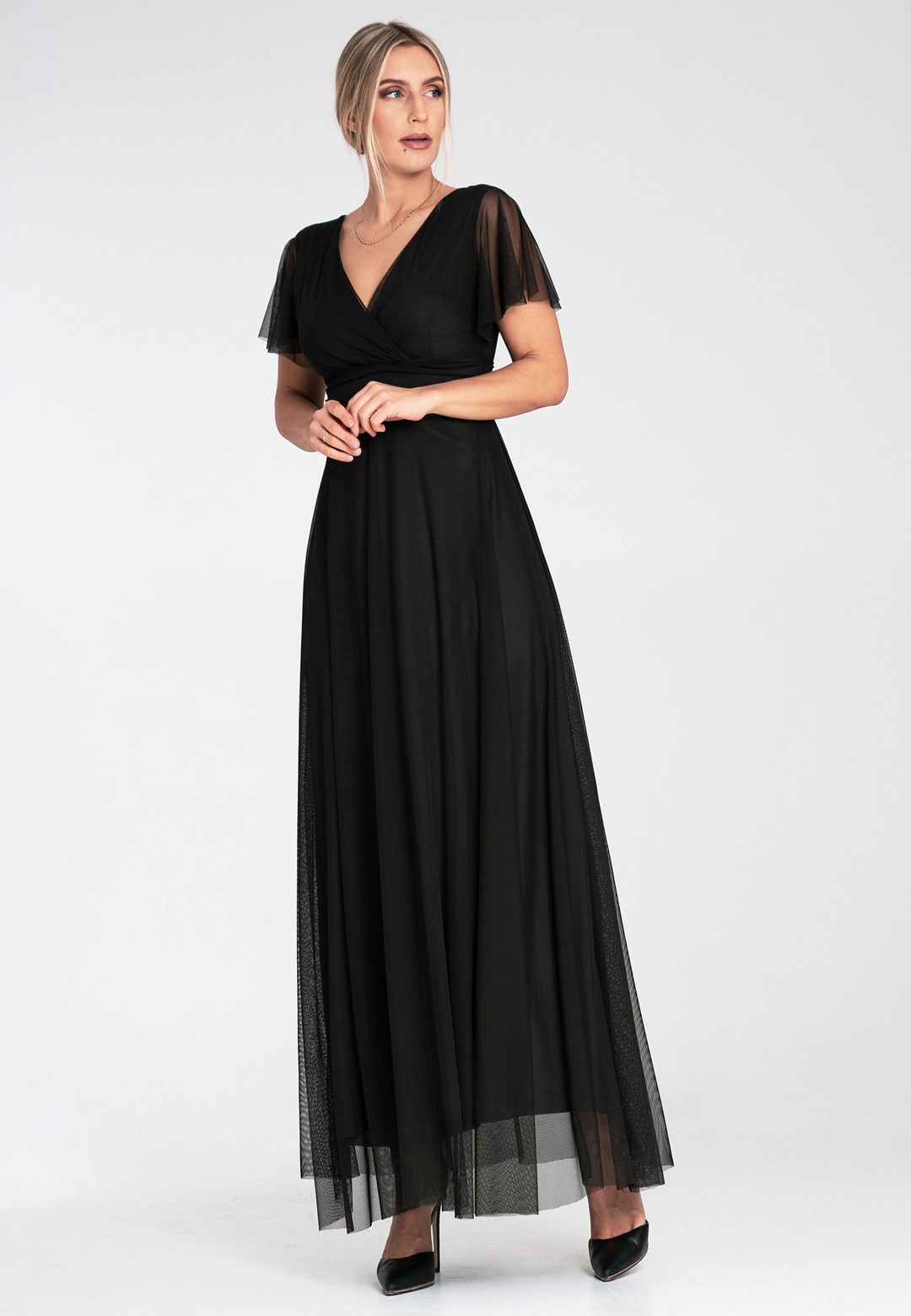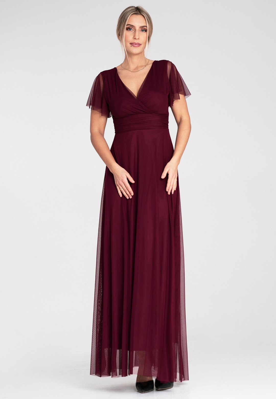 Elegancka sukienka na wesele została zaprojektowana tak, by podkreślać atuty sylwetki, jednocześnie oferując najwyższy komfort noszenia. Uszyta z niezwykle miękkiej siateczki, która pięknie pracuje w ruchu i nadaje stylizacji eterycznego charakteru. Zastosowanie mieszanki poliestru i elastanu sprawia, że sukienka jest nie tylko wytrzymała, ale i lekko elastyczna. Materiał nie gniecie się nadmiernie, co jest kluczowe podczas wielogodzinnych uroczystości. Przód z klasycznym kopertowym dekoltem subtelnie modeluje biust, natomiast tył zaskakuje głębokim wycięciem w serek, eksponując plecy. Krótkie, zwiewne rękawki typu "motylek" dodają lekkości i maskują ramiona w bardzo subtelny sposób. Model posiada wszyte miseczki, co pozwala na rezygnację z biustonosza. Szerokie odcięcie pod biustem optycznie zwęża talię i wydłuża nogi. Wygodne zapięcie na zamek z tyłu gwarantuje łatwe zakładanie i idealne dopasowanie. Miękka podszewka sprawia, że siateczka nie drapie i jest przyjemna dla skóry. Długość maxi w połączeniu z szerokim rozkloszowanym dołem sprawia, że sukienka fenomenalnie prezentuje się w tańcu. Sukienka elegancka na wesele to propozycja dla kobiet, które chcą czuć się wyjątkowo i swobodnie przez całą noc. Idealnie pasuje zarówno do klasycznych szpilek, jak i delikatnych sandałków.