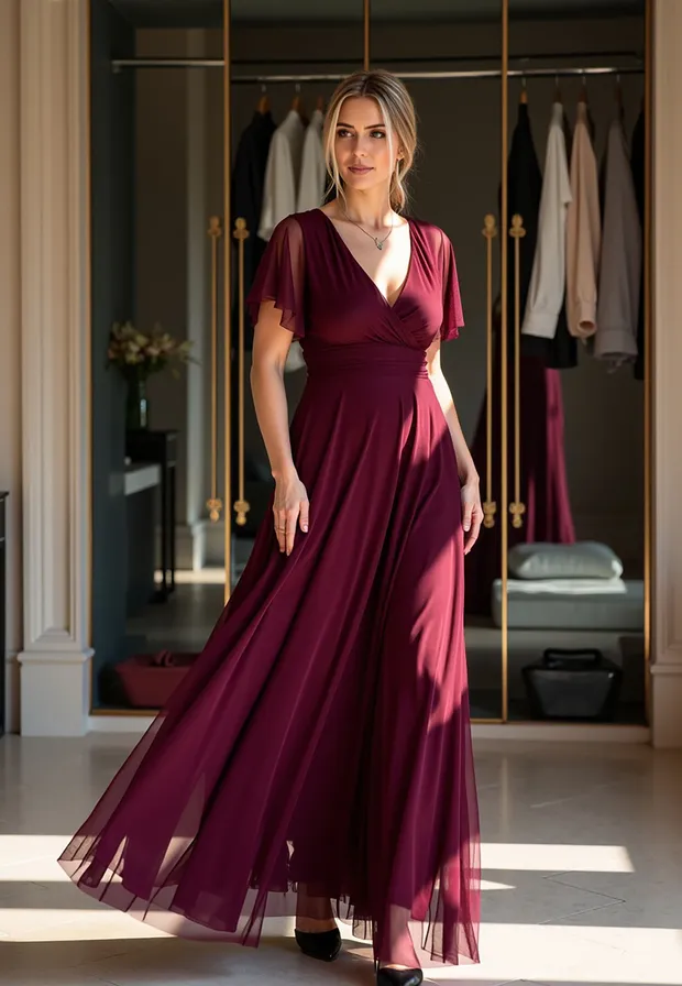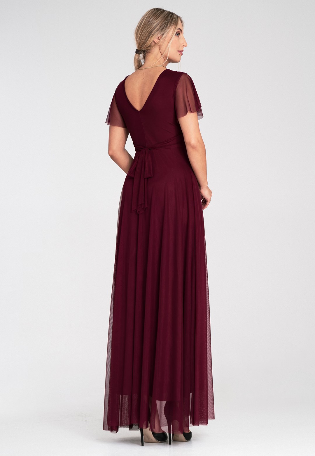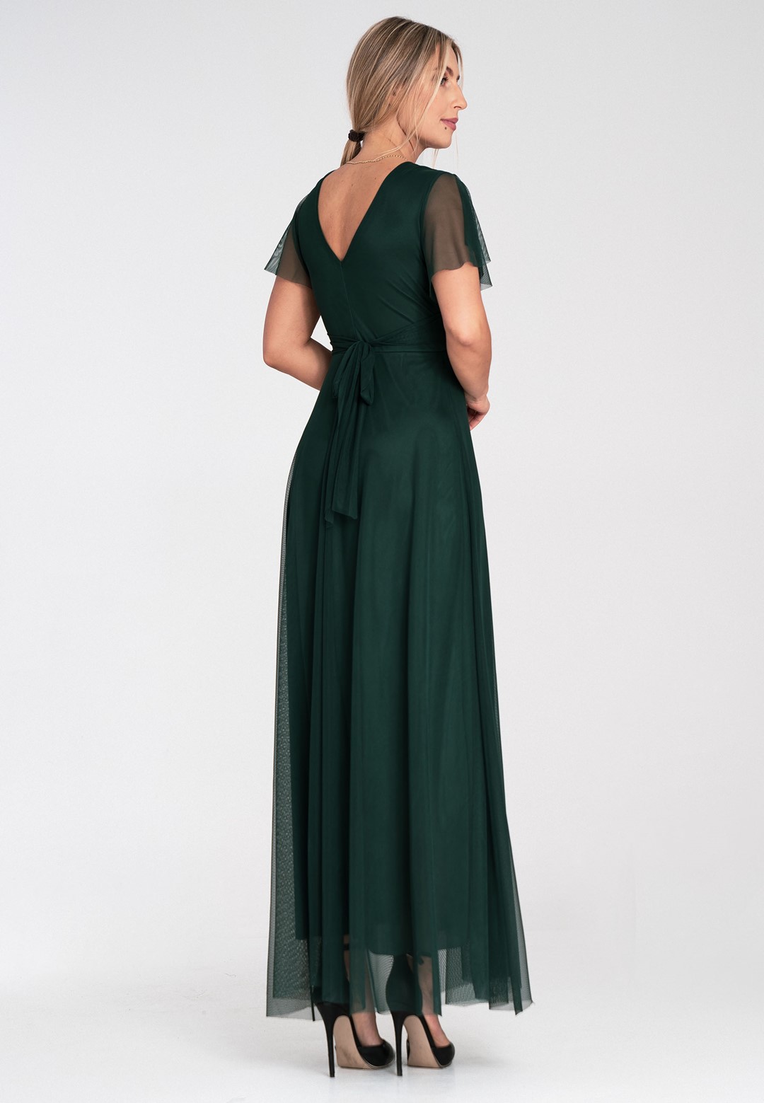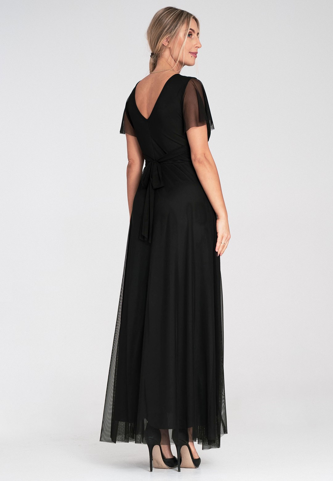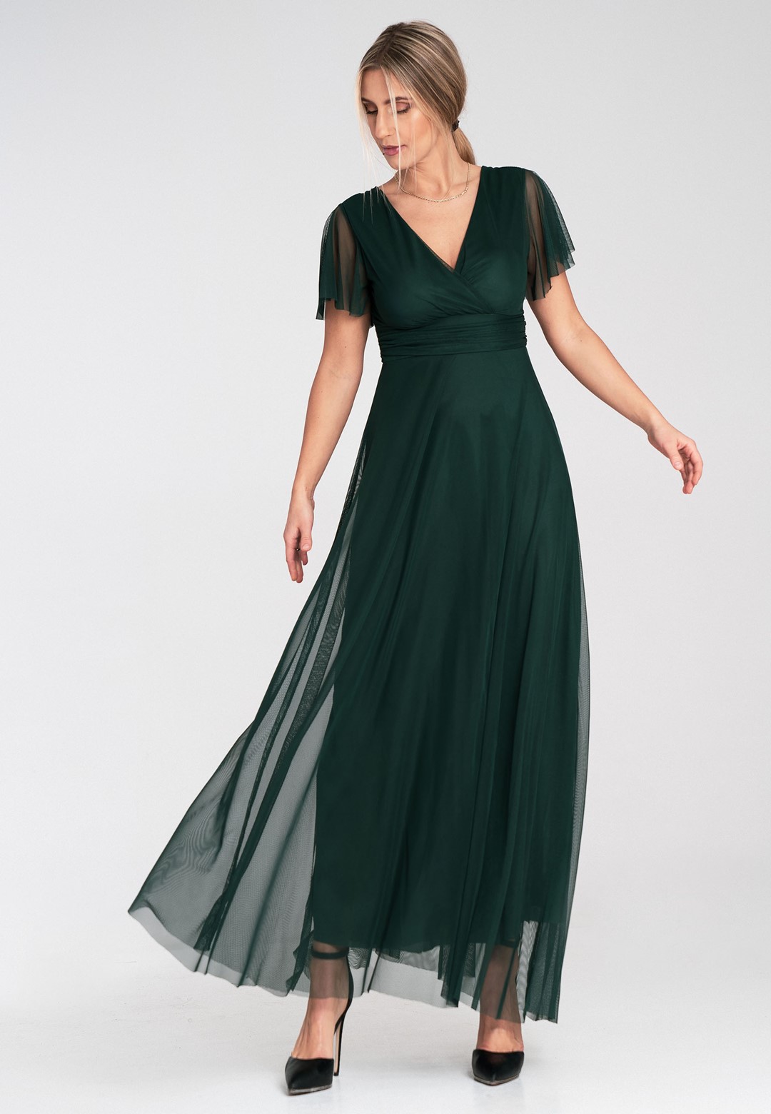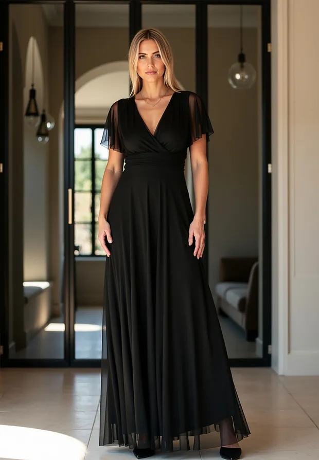 Elegancka sukienka na wesele została zaprojektowana tak, by podkreślać atuty sylwetki, jednocześnie oferując najwyższy komfort noszenia. Uszyta z niezwykle miękkiej siateczki, która pięknie pracuje w ruchu i nadaje stylizacji eterycznego charakteru. Zastosowanie mieszanki poliestru i elastanu sprawia, że sukienka jest nie tylko wytrzymała, ale i lekko elastyczna. Materiał nie gniecie się nadmiernie, co jest kluczowe podczas wielogodzinnych uroczystości. Przód z klasycznym kopertowym dekoltem subtelnie modeluje biust, natomiast tył zaskakuje głębokim wycięciem w serek, eksponując plecy. Krótkie, zwiewne rękawki typu "motylek" dodają lekkości i maskują ramiona w bardzo subtelny sposób. Model posiada wszyte miseczki, co pozwala na rezygnację z biustonosza. Szerokie odcięcie pod biustem optycznie zwęża talię i wydłuża nogi. Wygodne zapięcie na zamek z tyłu gwarantuje łatwe zakładanie i idealne dopasowanie. Miękka podszewka sprawia, że siateczka nie drapie i jest przyjemna dla skóry. Długość maxi w połączeniu z szerokim rozkloszowanym dołem sprawia, że sukienka fenomenalnie prezentuje się w tańcu. Sukienka elegancka na wesele to propozycja dla kobiet, które chcą czuć się wyjątkowo i swobodnie przez całą noc. Idealnie pasuje zarówno do klasycznych szpilek, jak i delikatnych sandałków.