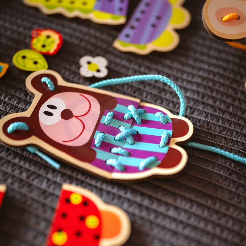 Gra zwierzęta to super zręcznościowa zabawa dla każdego małego dziecka. Zabawka wykonana z drewna w kształcie sympatycznego: misia, lwa, krokodyla, świnki i lisa. Pomalowana została kolorowymi farbami przyciągającymi wzrok malucha. Gra polega na nawlekaniu sznureczka przez otwory umieszczone na zwierzątkach. Dodatkowo dziecko nawlekając sznurek musi dopasować mały element do każdego zwierzątka i przyszyć w odpowiednie miejsce tworząc jego całość. Gra o zwierzętach rozwija w dziecku umiejętności rozpoznawania kolorów, rozróżniania kształtów zwierząt, zręczności i zdolności motorycznych. Kolory i zabawne kształty zwierzątek zapewnią dziecku wesoła zabawę na długi czas.