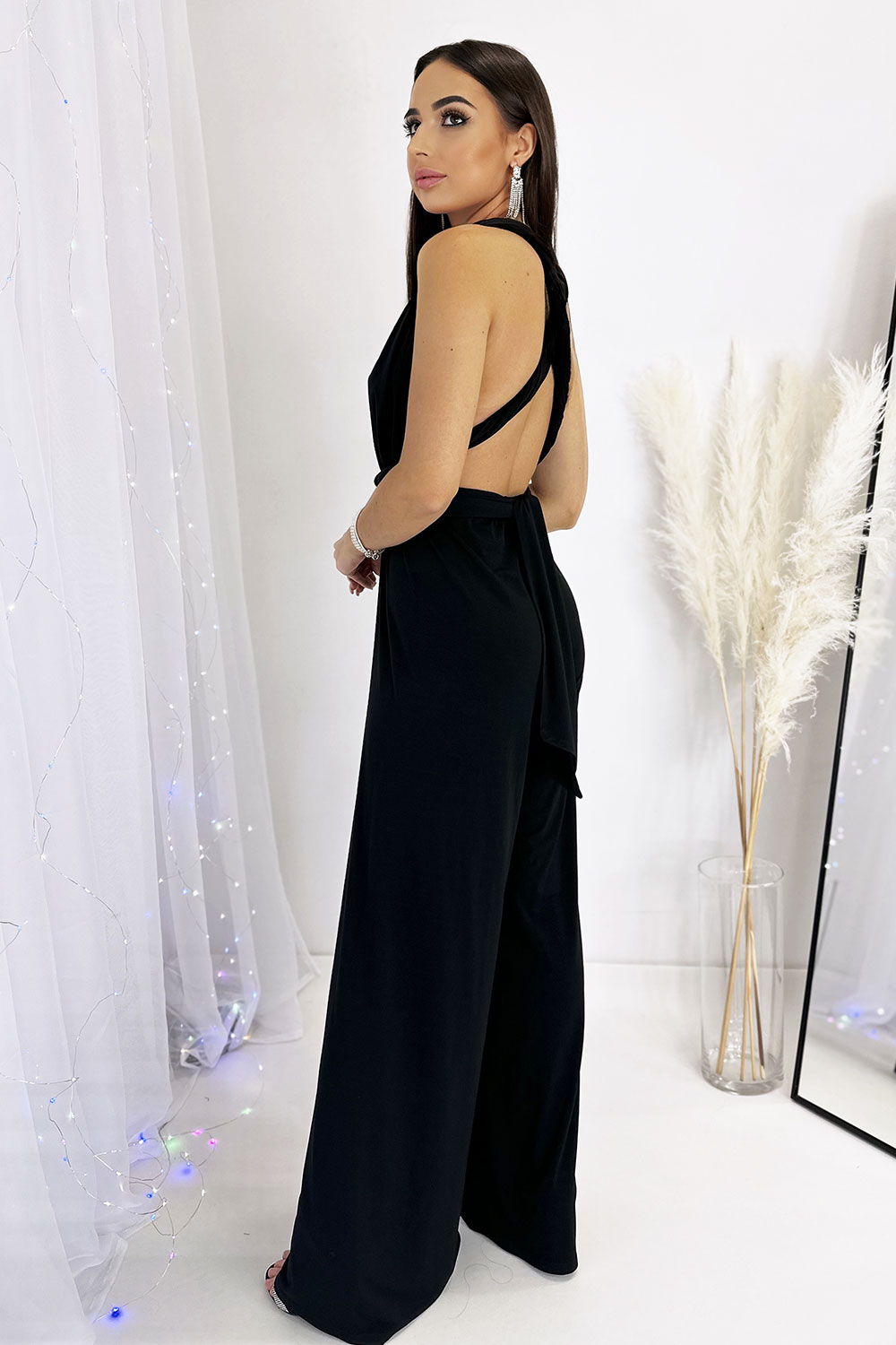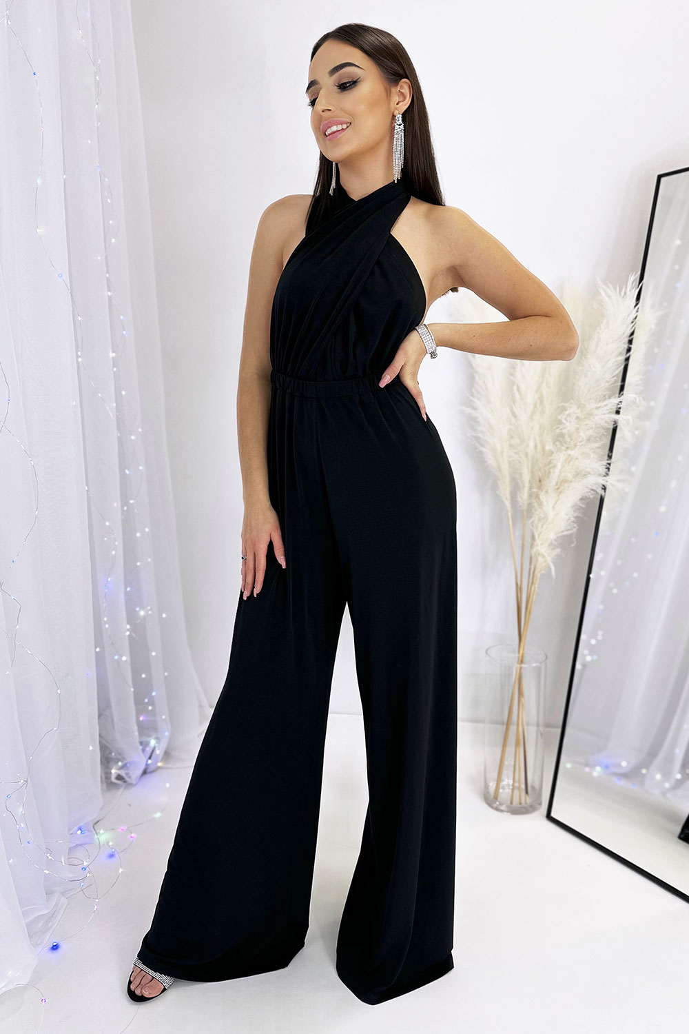 Kombinezon damski wizytowy uroczy i czarujący. Uszyty z przyjemnego i elastycznego materiału. Głęboki dekolt w literę V ponętnie odsłania szyję i podkreśla biust. Odkryte z tyłu plecy dodają mnóstwo zniewalającego wyglądu. Efektownym dodatkiem jest możliwość wiązania górnej części kombinezonu na wiele sposobów, wiążąc go na szyi i z przodu wyeksponować można bardziej linię biustu, a z tyłu wiążąc na kokardę, węzeł i na krzyż kusząco odkrywając ramiona i linię pleców. Długie i szerokie nogawki pozwalają na zamaskowanie mankamentów sylwetki wydobywając zarazem z niej urzekającą atrakcyjność. Gumka wszyta w pasie tworząc ładne marszczenia akcentuje talię i daje lepsze dopasowanie do figury. Kombinezon wizytowy jest niezwykle seksowny i przyciągnie nie jedno męskie spojrzenie.
