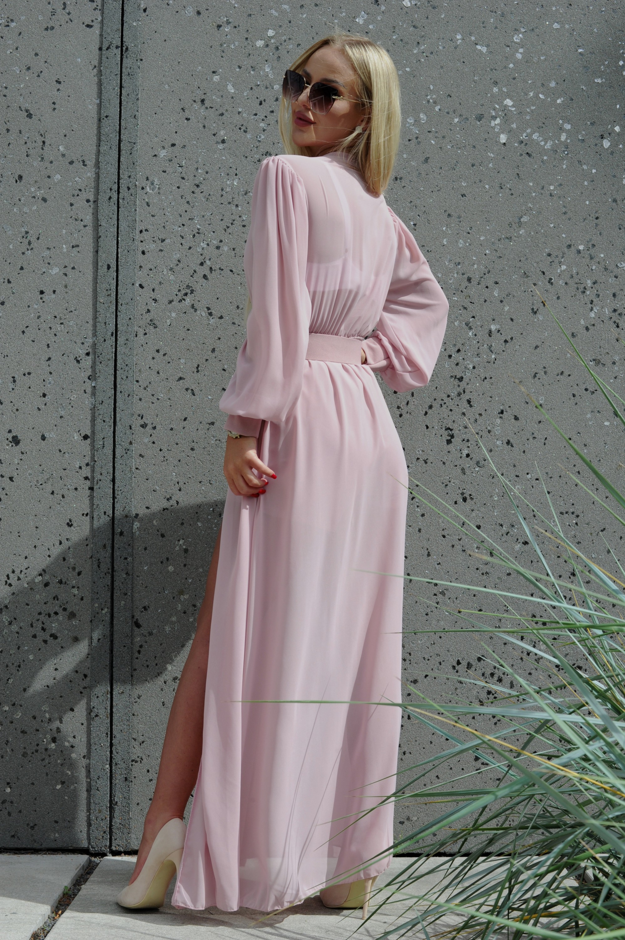 Kombinezon sukienka niezwykle elegancki i wyjątkowy. Głęboki dekolt na zakładkę, zwany kopertowym optycznie wysmukla szyję i idealnie eksponuje biust. Długie bufiaste rękawy lekko marszczone na ramionach i zakończone mankietem, nadają kreacji urokliwego szyku. W pasie ozdobny pasek z klamrą podkreślający talię. Dół kombinezonu w formie dopasowanych szortów ponętnie odsłaniających smukłość nóg, zmysłowo przykrywa zwiewny przezroczysty i długi tren. Kombinezon bez zapięcia i bez kieszeni. Sukienka kombinezon swoim fasonem będzie doskonały na wyjątkowe uroczyste okazje. Świetnie będzie wyglądał do obuwia na wysokim obcasie.