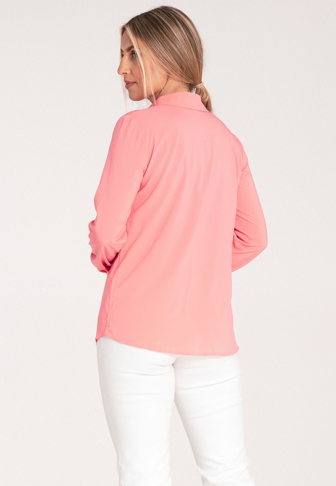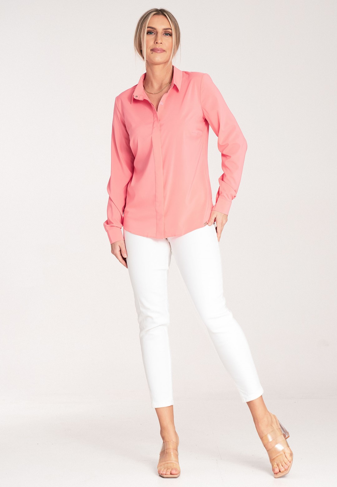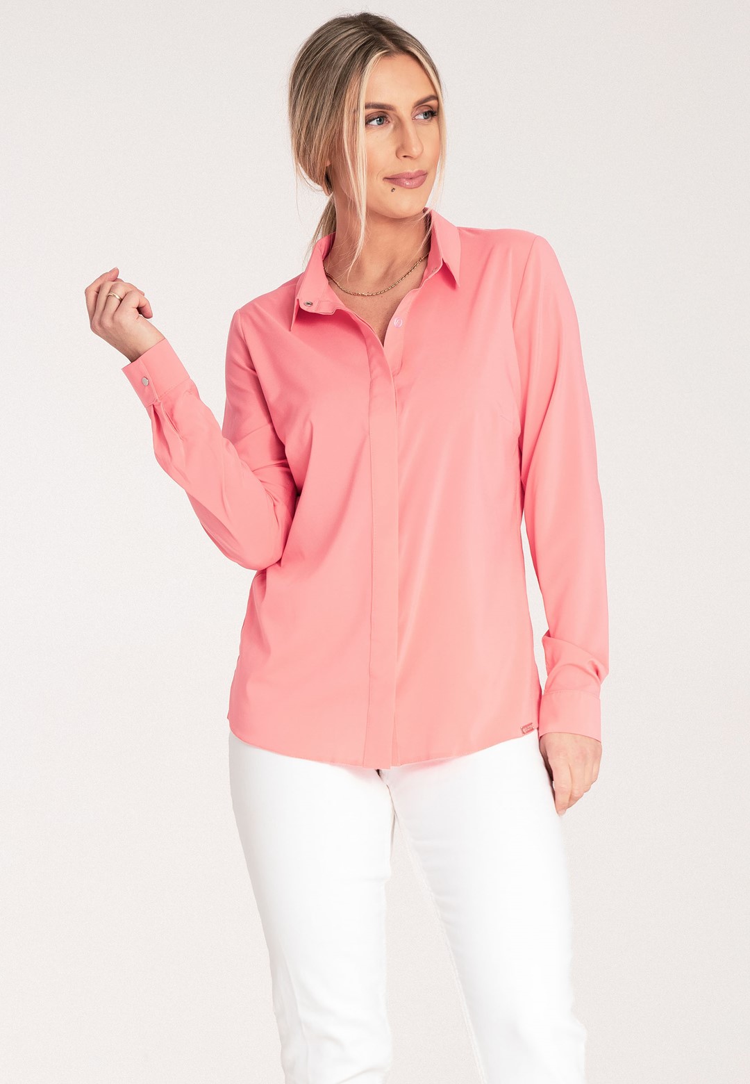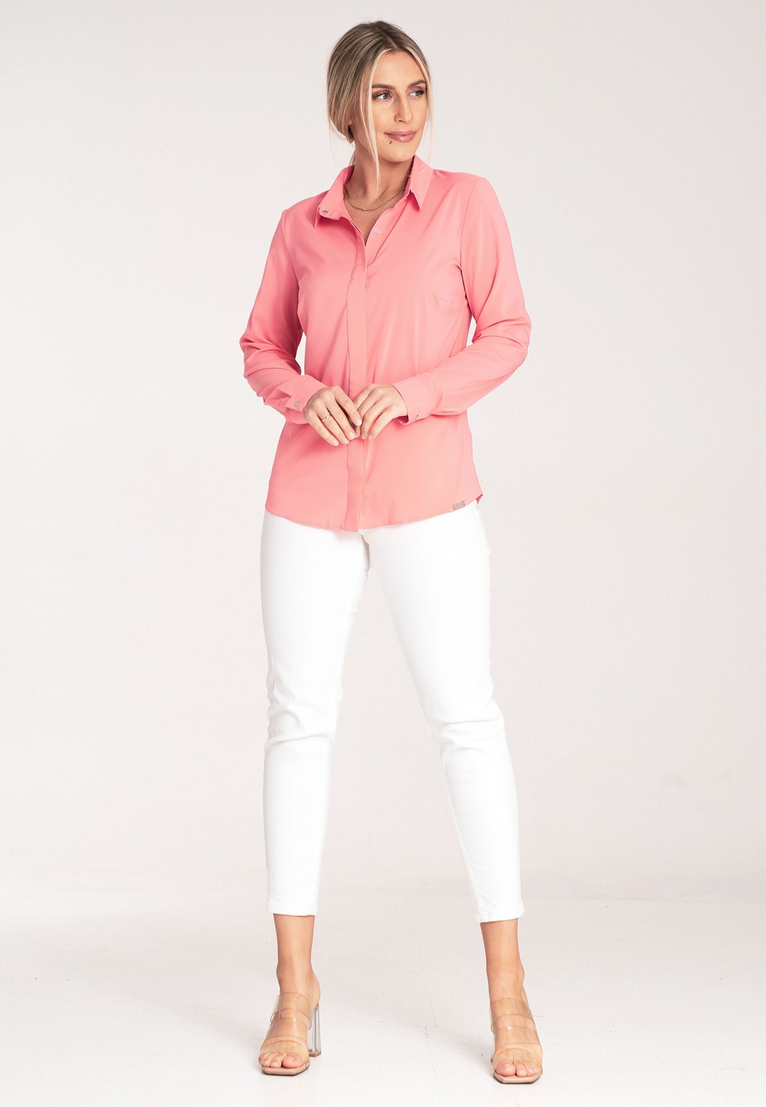 Koszula elegancka to klasyka w nowoczesnym wydaniu. Gładki jednolity materiał zapewnia elegancki i profesjonalny wygląd. Mieszanka poliestru i elastanu gwarantuje komfort noszenia oraz minimalną skłonność do zagnieceń. Klasyczny kołnierzyk z zapięciem na srebrny nap pasuje do każdej stylizacji. Długie rękawy z mankietami zakończone srebrnymi, ozdobnymi zatrzaskami, stanowią subtelny, ale wyrafinowany akcent biżuteryjny – idealny dla osób ceniących detale. Ciekawym elementem jest kryte zapięcie na zatrzaski w formie plisy dodające stylowego akcentu. Prosty i klasyczny krój koszuli zapewnia wygodę i swobodę ruchów, jednocześnie zachowując elegancką sylwetkę. Ta elegancka koszula to must-have w każdej profesjonalnej garderobie. Dzięki prostemu krojowi i gładkiej tkaninie łatwo ją zestawisz zarówno z ołówkową spódnicą, jak i eleganckimi spodniami. Idealnie sprawdzi się na formalne spotkania, do biura lub na wyjątkowe okazje.