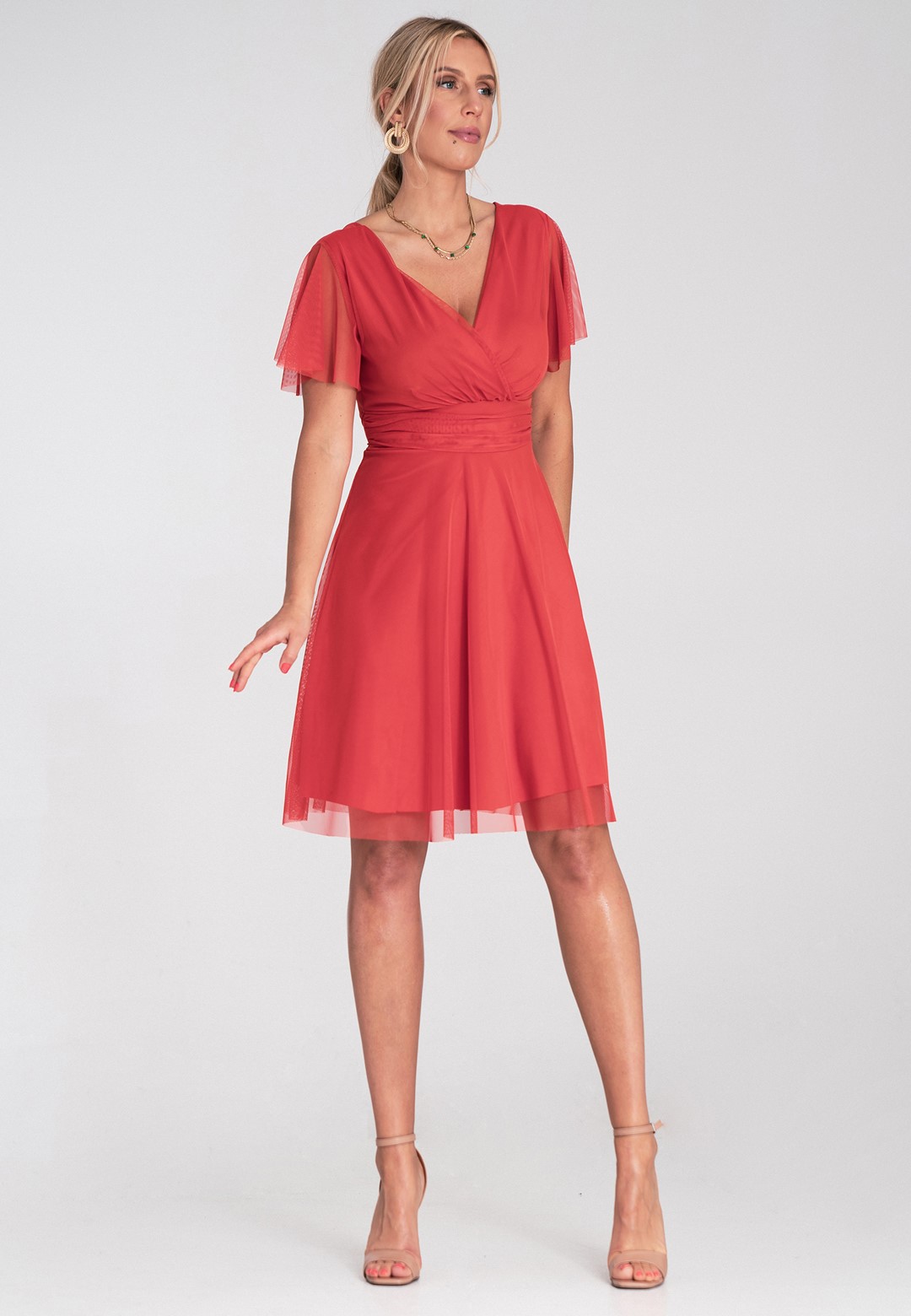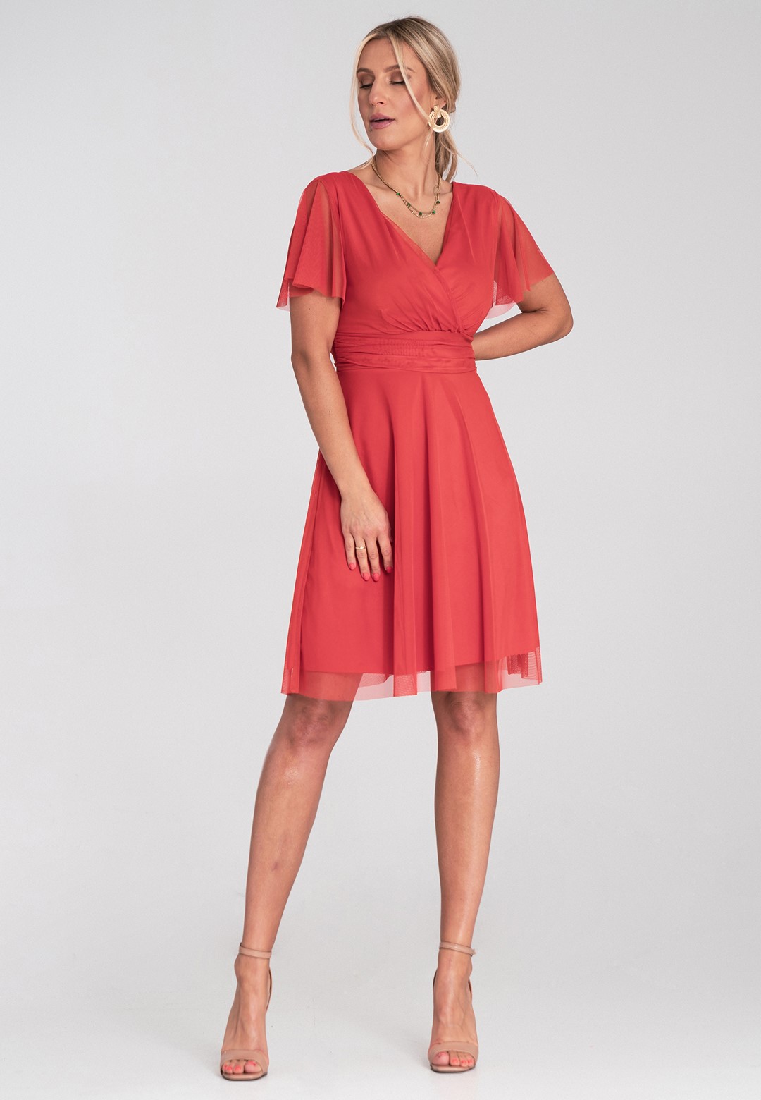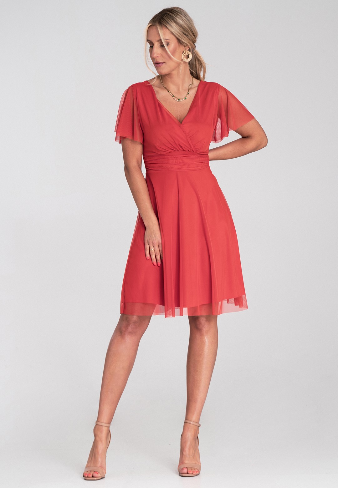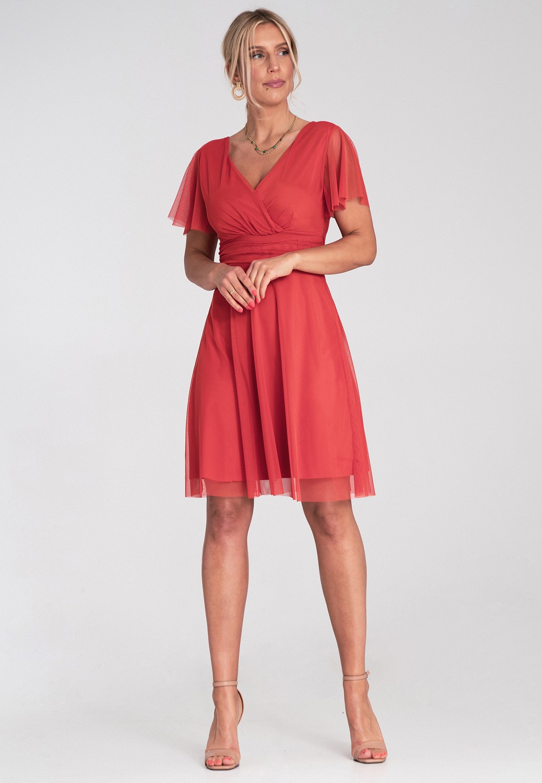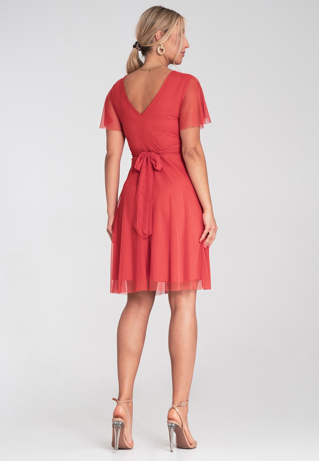 Krótka sukienka łączy w sobie dziewczęcy urok z nutą elegancji. Wykonana z delikatnej siateczki jest wytrzymała, lekko elastyczna i nie gniecie się nadmiernie. Nasza sukienka krótka została zaprojektowana tak, by subtelnie podkreślać atuty sylwetki. Kopertowy dekolt pięknie eksponuje szyję i biust, a tył w kształcie litery V dodaje całości intrygującego charakteru. Krótkie motylkowe rękawy z siateczki dodają lekkości ramionom, a zwiewny dół o długości przed kolana pięknie pracuje w ruchu. Pasek z tego samego materiału pozwala na idealne podkreślenie talii. W środku podszewka zapewnia pełen komfort i dyskrecję. Idealna propozycja na wyjątkowe okazje, randki czy letnie przyjęcia.