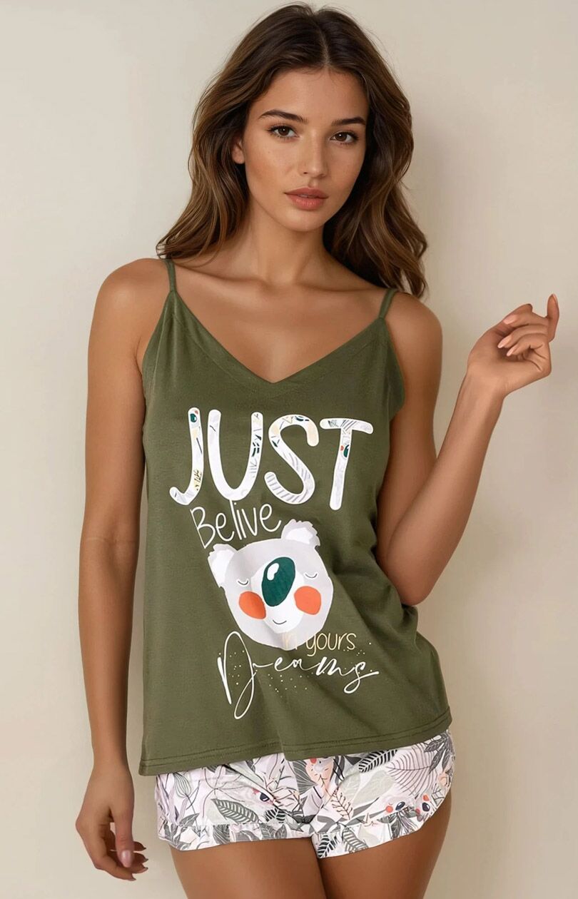 Piżama damska krótkie spodenki to połączenie komfortu i modnego designu. Wykonana jest z przyjemnej w dotyku bawełny, która zapewnia wygodę noszenia i pozwala skórze oddychać. Lekka i przewiewna koszulka z delikatnym nadrukiem zapewni Ci komfort i swobodę ruchów podczas snu. Cienkie ramiączka nie krępują ruchów i ładnie eksponują ramiona. Seksowne i eleganckie wycięcia podkreślą Twój kobiecy charakter. Dekolt w literę V z przodu optycznie wydłuża szyję, a dekolt w karo z tyłu dodaje uroku i nutki tajemniczości. Urocze szorty z roślinnym wzorem dodają piżamie letniego charakteru. Motyw roślinny jest nie tylko modny, ale również kojarzy się z naturą i spokojem. Elastyczna gumka w pasie zapewnia idealne dopasowanie piżamy do sylwetki i gwarantuje komfort podczas snu. Urocza falbanka na nogawkach dodaje piżamie dziewczęcego uroku. Piżama damska z krótkimi spodenkami świetnie sprawdzi się na letnie noce, a także jako strój do domu.