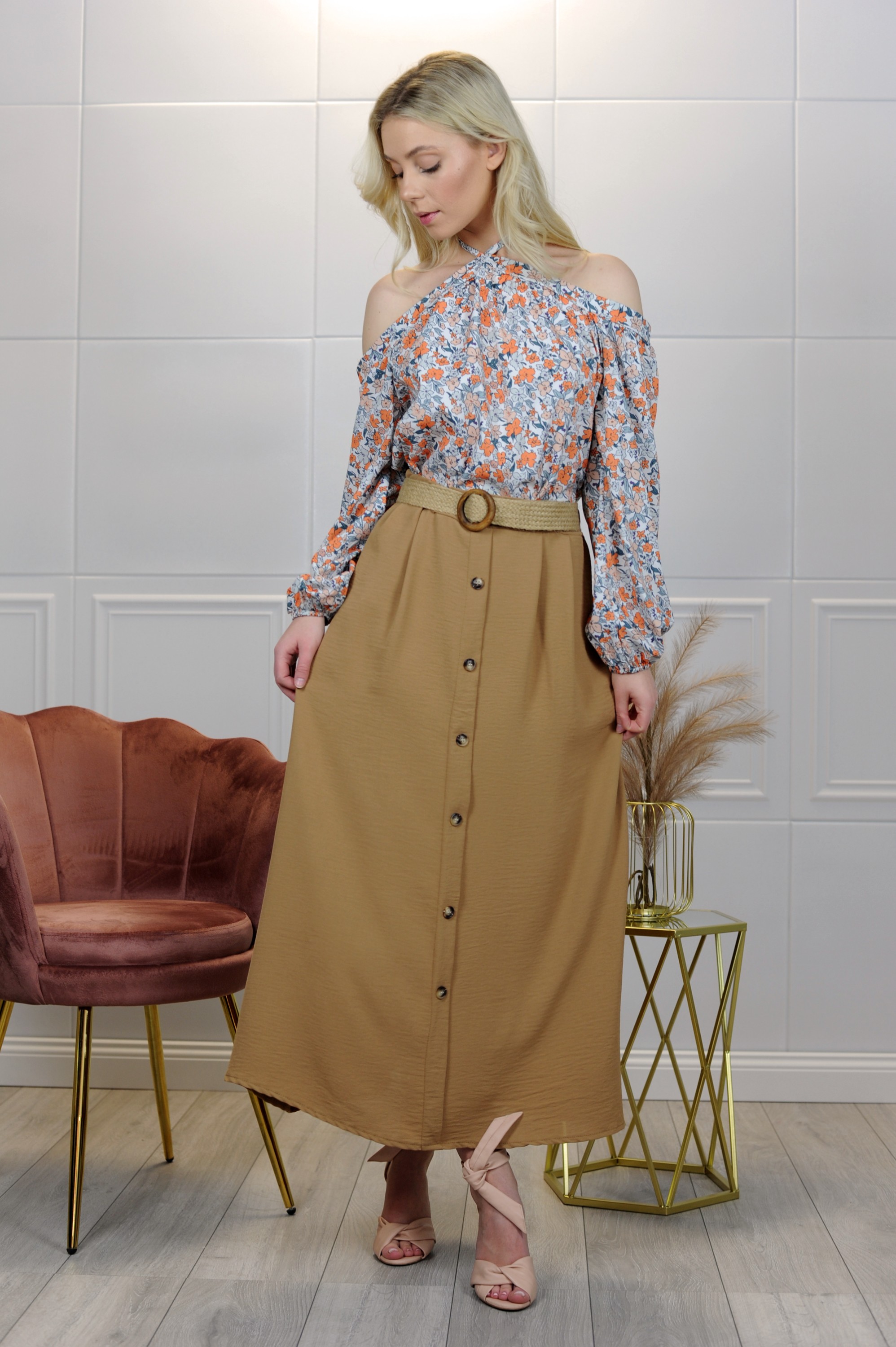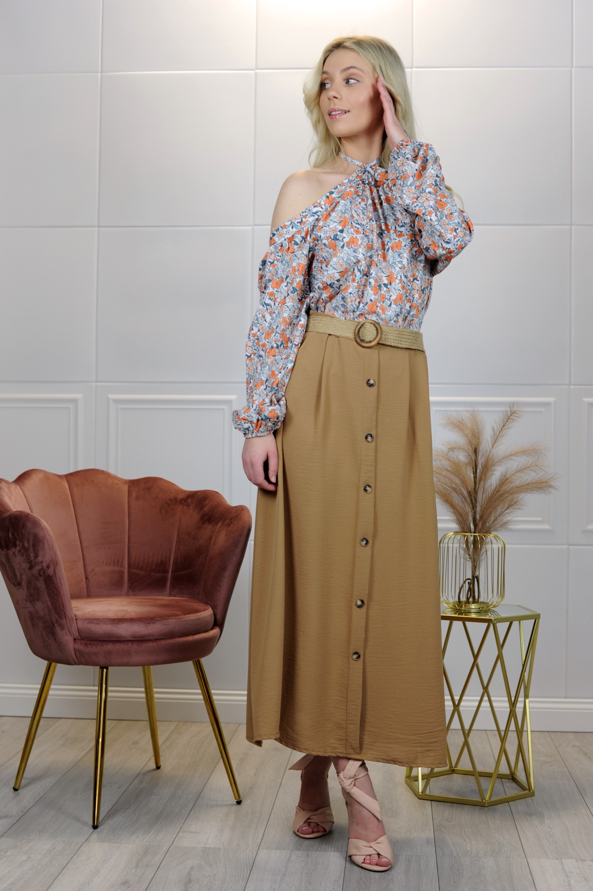 Spódnica damska stylowa i pełna elegancji. Wykonana z przyjemnego w dotyku poliestru, pięknie się układa i zapewnia komfort noszenia przez cały dzień. Szeroka gumka w pasie gwarantuje wygodę i idealne dopasowanie do każdej sylwetki. Pleciony pasek z okrągłą klamerką dodatkowo podkreśla talię i dodaje stylizacji kobiecego charakteru. Imitacja guzików i rozporek z przodu dodają jej uroku i stylowego charakteru. Długość maxi zapewnia swobodę ruchów i maskuje niedoskonałości figury. Długa spódnica damska idealna na każdą okazję: do pracy można zestawić ją z żakietem i bluzką koszulową, na spotkanie z przyjaciółmi połączyć ją z t-shirtem i sneakersami, na randkę do romantycznej bluzki i szpilek.
