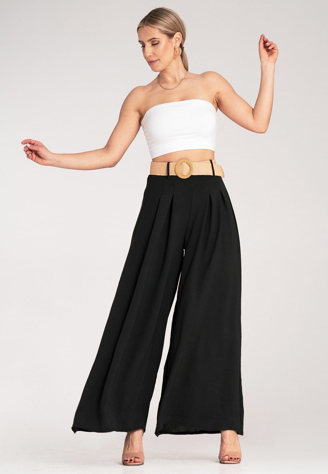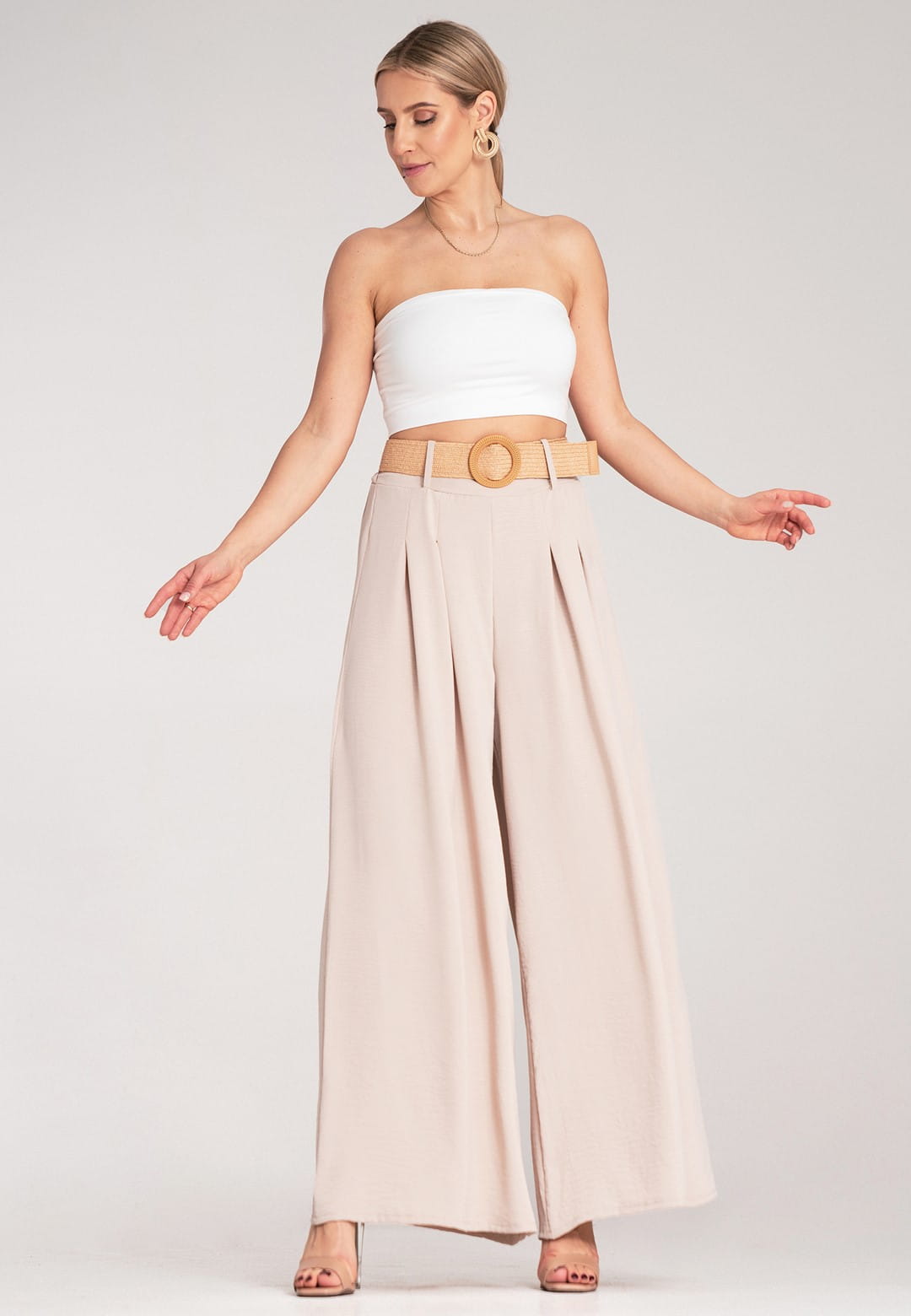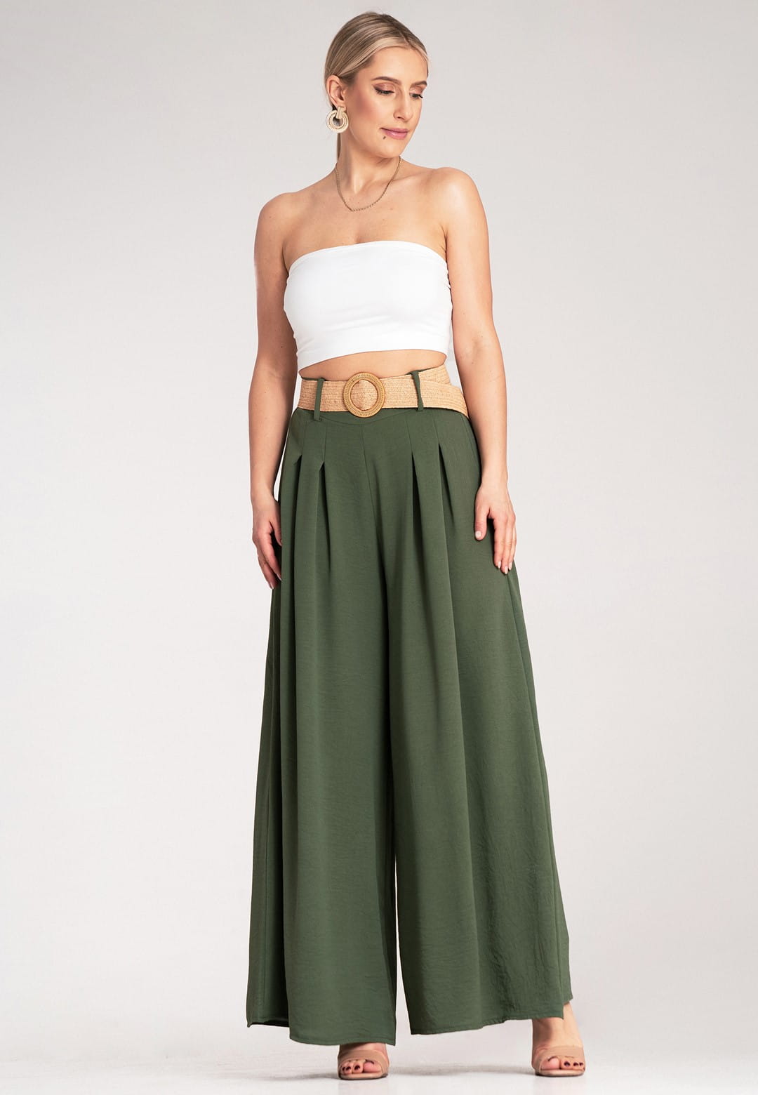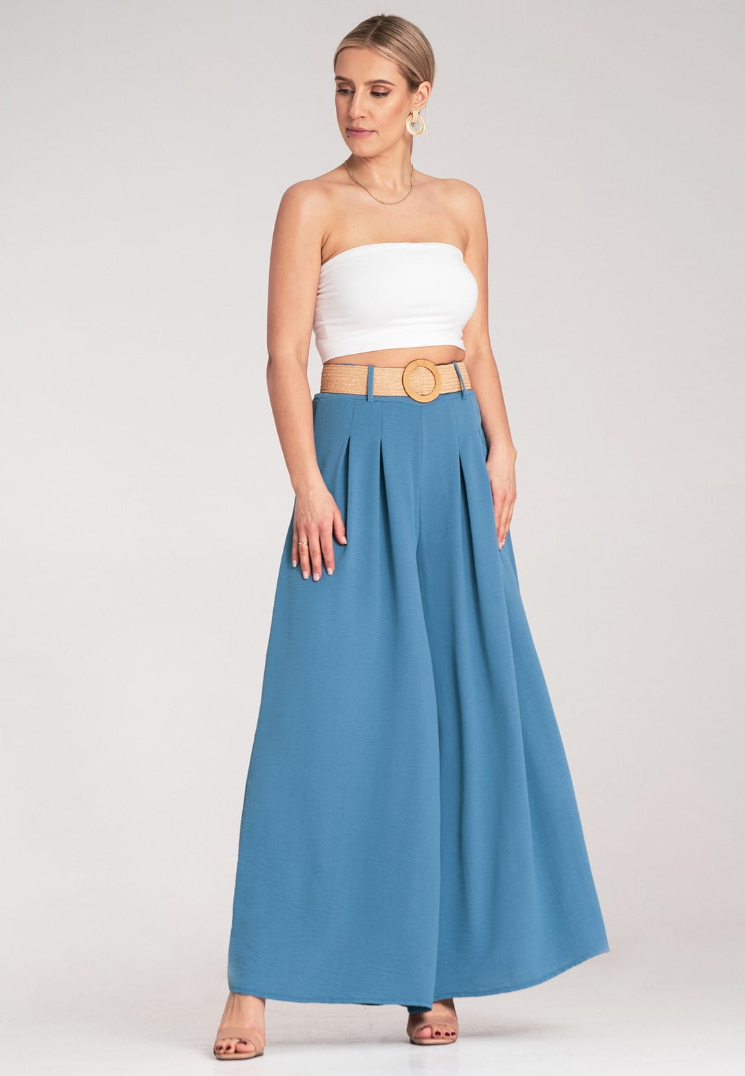 Spodnie szerokie nogawki to kwintesencja współczesnej elegancji. Wykonane z poliestru, który jest wytrzymały, odporny na zagniecenia i łatwy w pielęgnacji, idealny do codziennego użytku. Wysoki stan w spodniach szerokich podkreśla talię i optycznie wydłuża sylwetkę, zapewniając elegancki wygląd i komfort noszenia. Szeroki pas z przodu ze szlufkami dodaje szyku i pozwala na stylizację z paskiem. Elastyczna gumka z tyłu gwarantuje idealne dopasowanie do sylwetki, bez ucisku, zapewniając swobodę ruchów przez cały dzień. Pleciony pasek z ozdobną klamrą w zestawie, dodaje spodniom unikalnego charakteru i pozwala na natychmiastowe stworzenie kompletnej stylizacji. Efektowne plisy z przodu nadają spodniom elegancji i dynamiki, sprawiając, że nogawki pięknie układają się w ruchu. Szerokie, długie nogawki to najmodniejszy krój sezonu, który zapewnia komfort i swobodę, a jednocześnie optycznie wysmukla sylwetkę. Spodnie damskie szerokie nogawki to doskonały wybór zarówno do biura, jak i na specjalne okazje. Połącz je z elegancką koszulą lub dopasowanym topem, by stworzyć stylizację, która przyciągnie spojrzenia.