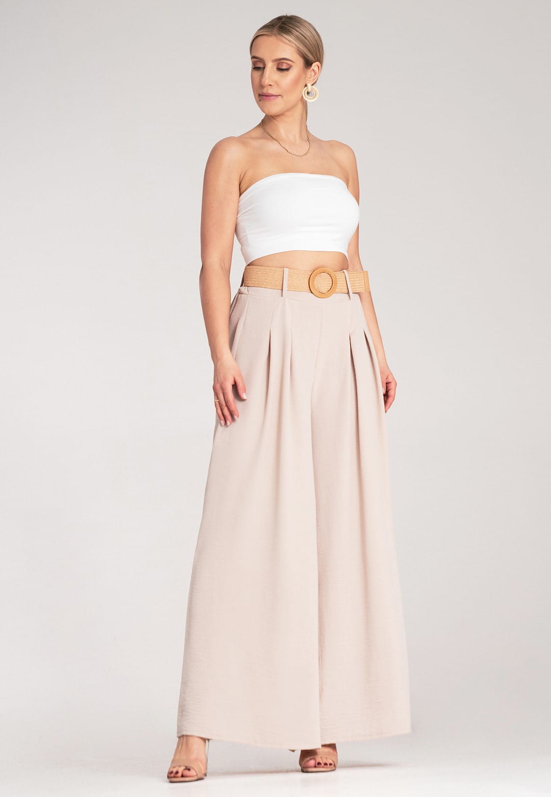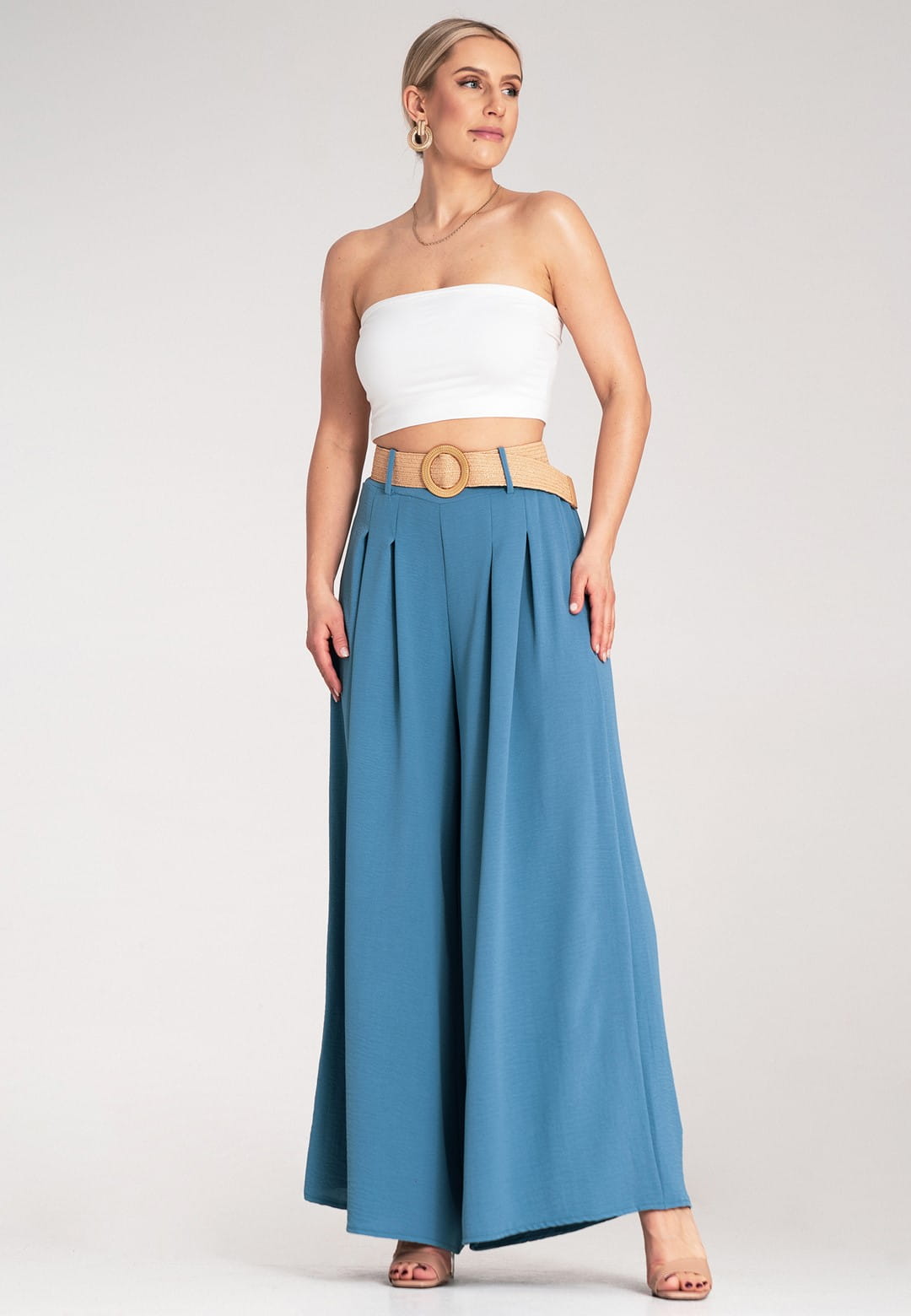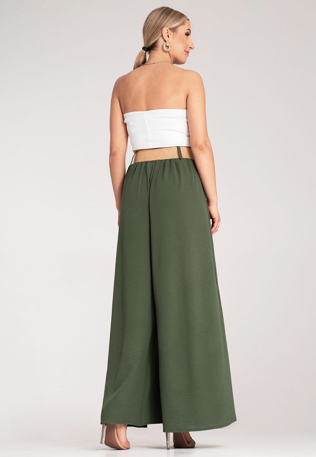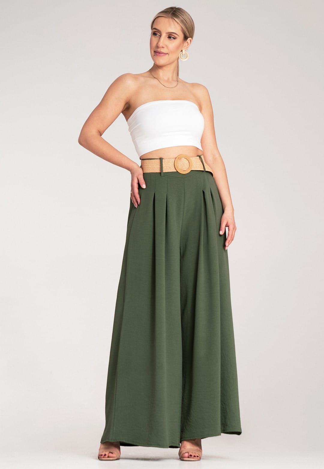 Spodnie szerokie nogawki to kwintesencja współczesnej elegancji. Wykonane z poliestru, który jest wytrzymały, odporny na zagniecenia i łatwy w pielęgnacji, idealny do codziennego użytku. Wysoki stan w spodniach szerokich podkreśla talię i optycznie wydłuża sylwetkę, zapewniając elegancki wygląd i komfort noszenia. Szeroki pas z przodu ze szlufkami dodaje szyku i pozwala na stylizację z paskiem. Elastyczna gumka z tyłu gwarantuje idealne dopasowanie do sylwetki, bez ucisku, zapewniając swobodę ruchów przez cały dzień. Pleciony pasek z ozdobną klamrą w zestawie, dodaje spodniom unikalnego charakteru i pozwala na natychmiastowe stworzenie kompletnej stylizacji. Efektowne plisy z przodu nadają spodniom elegancji i dynamiki, sprawiając, że nogawki pięknie układają się w ruchu. Szerokie, długie nogawki to najmodniejszy krój sezonu, który zapewnia komfort i swobodę, a jednocześnie optycznie wysmukla sylwetkę. Spodnie damskie szerokie nogawki to doskonały wybór zarówno do biura, jak i na specjalne okazje. Połącz je z elegancką koszulą lub dopasowanym topem, by stworzyć stylizację, która przyciągnie spojrzenia.