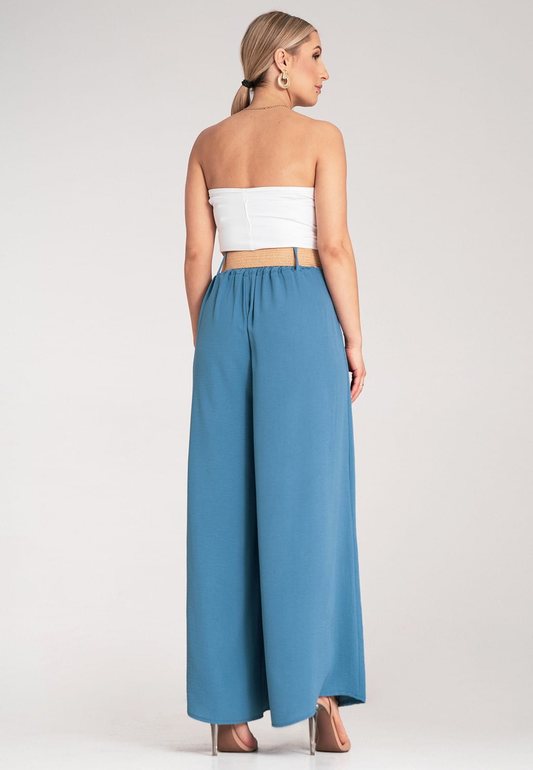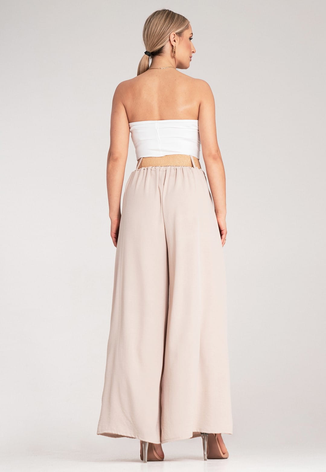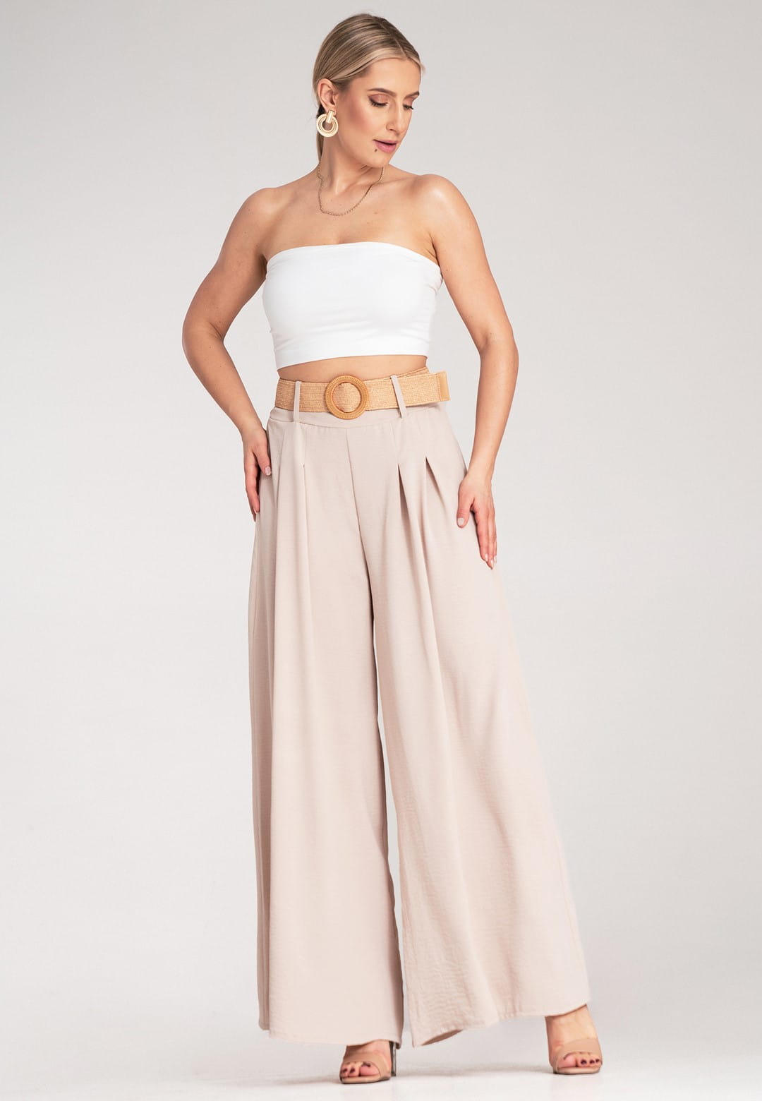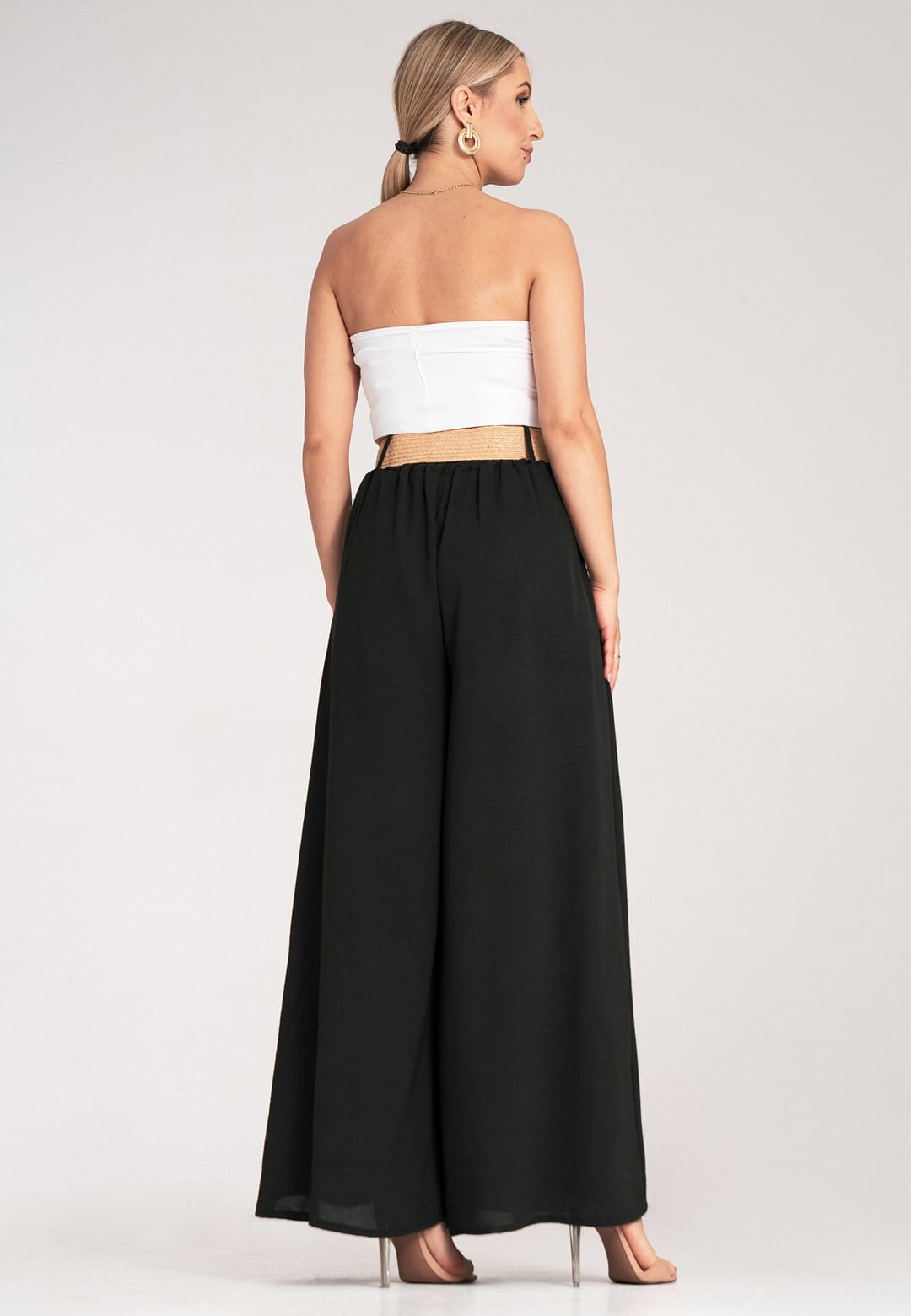 Spodnie szerokie nogawki to kwintesencja współczesnej elegancji. Wykonane z poliestru, który jest wytrzymały, odporny na zagniecenia i łatwy w pielęgnacji, idealny do codziennego użytku. Wysoki stan w spodniach szerokich podkreśla talię i optycznie wydłuża sylwetkę, zapewniając elegancki wygląd i komfort noszenia. Szeroki pas z przodu ze szlufkami dodaje szyku i pozwala na stylizację z paskiem. Elastyczna gumka z tyłu gwarantuje idealne dopasowanie do sylwetki, bez ucisku, zapewniając swobodę ruchów przez cały dzień. Pleciony pasek z ozdobną klamrą w zestawie, dodaje spodniom unikalnego charakteru i pozwala na natychmiastowe stworzenie kompletnej stylizacji. Efektowne plisy z przodu nadają spodniom elegancji i dynamiki, sprawiając, że nogawki pięknie układają się w ruchu. Szerokie, długie nogawki to najmodniejszy krój sezonu, który zapewnia komfort i swobodę, a jednocześnie optycznie wysmukla sylwetkę. Spodnie damskie szerokie nogawki to doskonały wybór zarówno do biura, jak i na specjalne okazje. Połącz je z elegancką koszulą lub dopasowanym topem, by stworzyć stylizację, która przyciągnie spojrzenia.