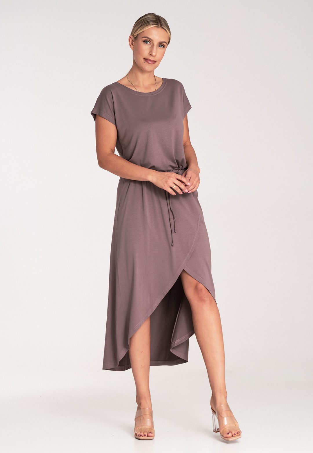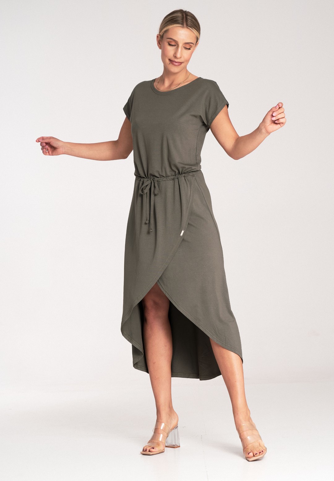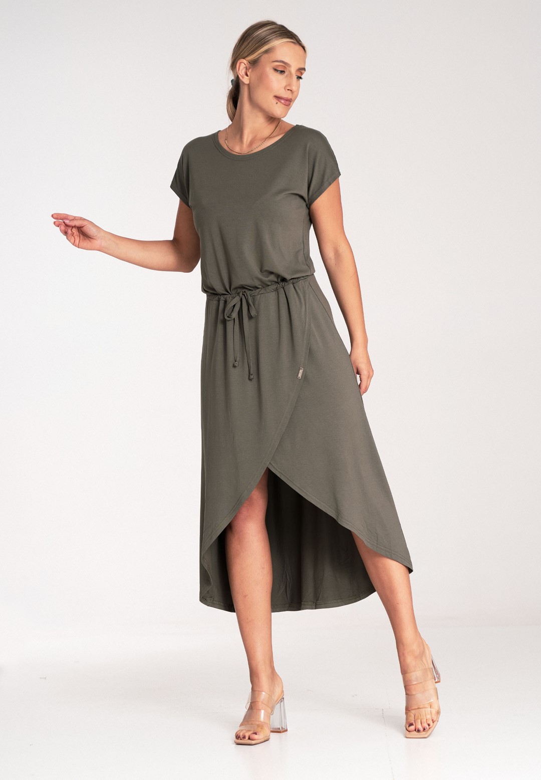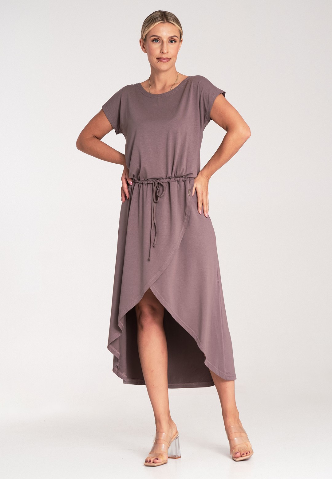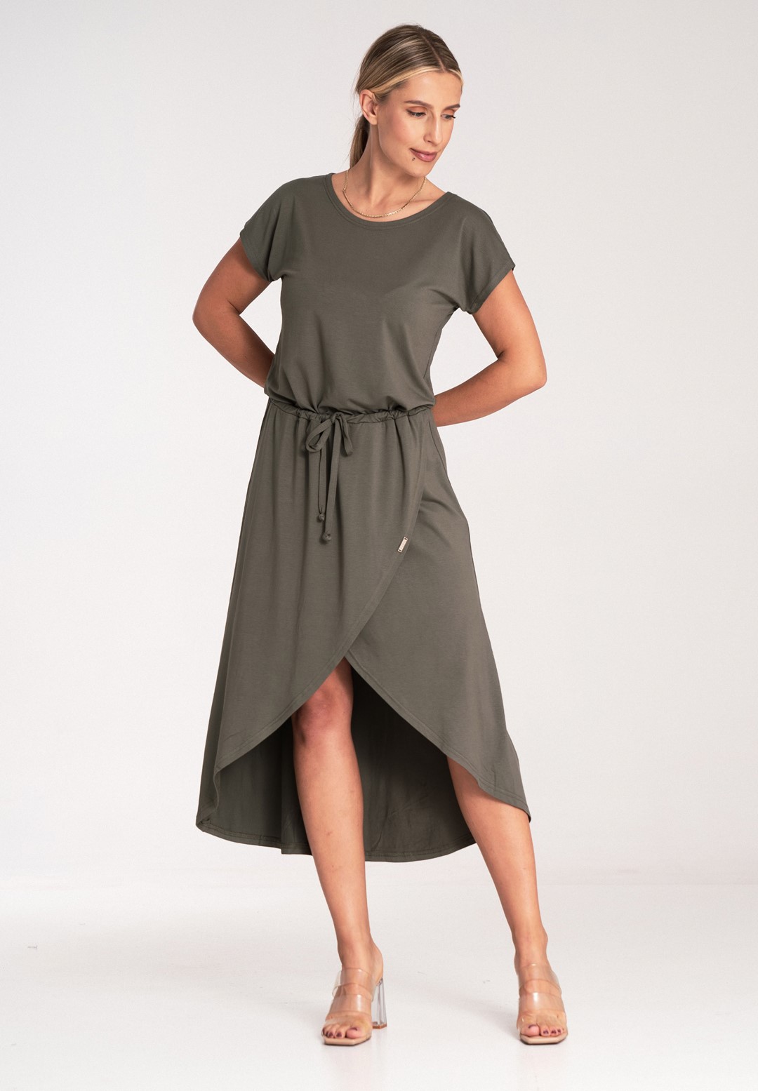 Sukienka asymetryczna to idealna propozycja dla kobiet, które cenią nowoczesny design i naturalne materiały. Wykonana z mieszanki wiskozy i elastanu. Wiskoza pozwala skórze oddychać, jest niezwykle miękka w dotyku i ma delikatny, szlachetny połysk. Dzięki elastanowi materiał jest sprężysty, nie deformuje się i idealnie układa się na ciele. Klasyczny okrągły dekolt oraz krótkie rękawy sprawiają, że sukienka świetnie sprawdza się zarówno w codziennych, jak i nieco bardziej eleganckich zestawieniach. Funkcjonalne wiązanie w pasie troczkami pozwala na idealne dopasowanie sukienki do figury, akcentując wcięcie w talii. Krótszy przód odsłaniający nogi w połączeniu z dłuższym tyłem tworzy intrygującą linię, która optycznie wysmukla sylwetkę. Lekki, trapezowy dół nie krępuje ruchów, zapewniając komfort nawet podczas intensywnego dnia. Asymetryczna sukienka to nie tylko fason, ale prawdziwy kameleon! Zestaw ją z białymi sneakersami, aby uzyskać miejski look, lub załóż sandały na słupku, by stworzyć romantyczną stylizację na wieczorne wyjście.