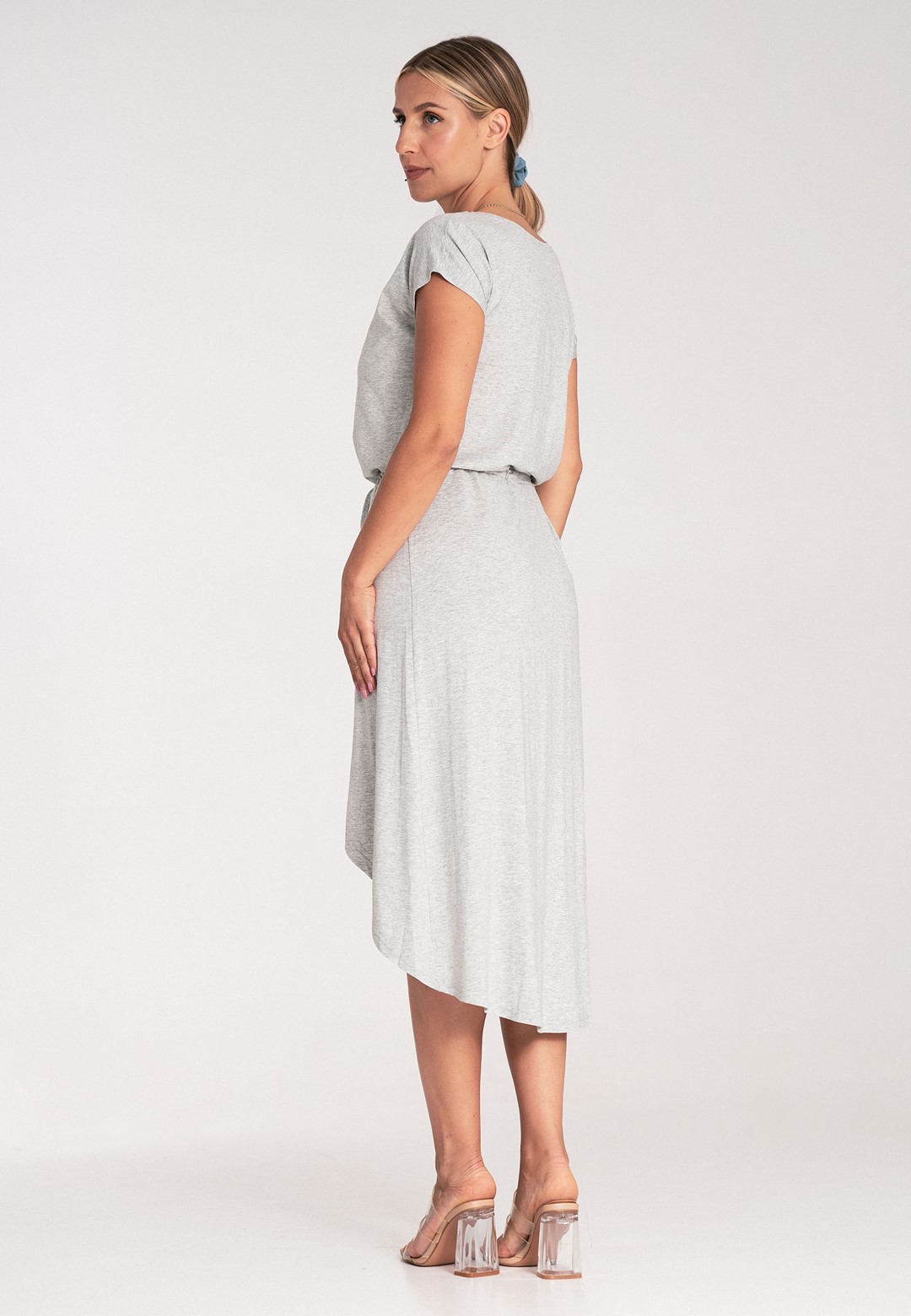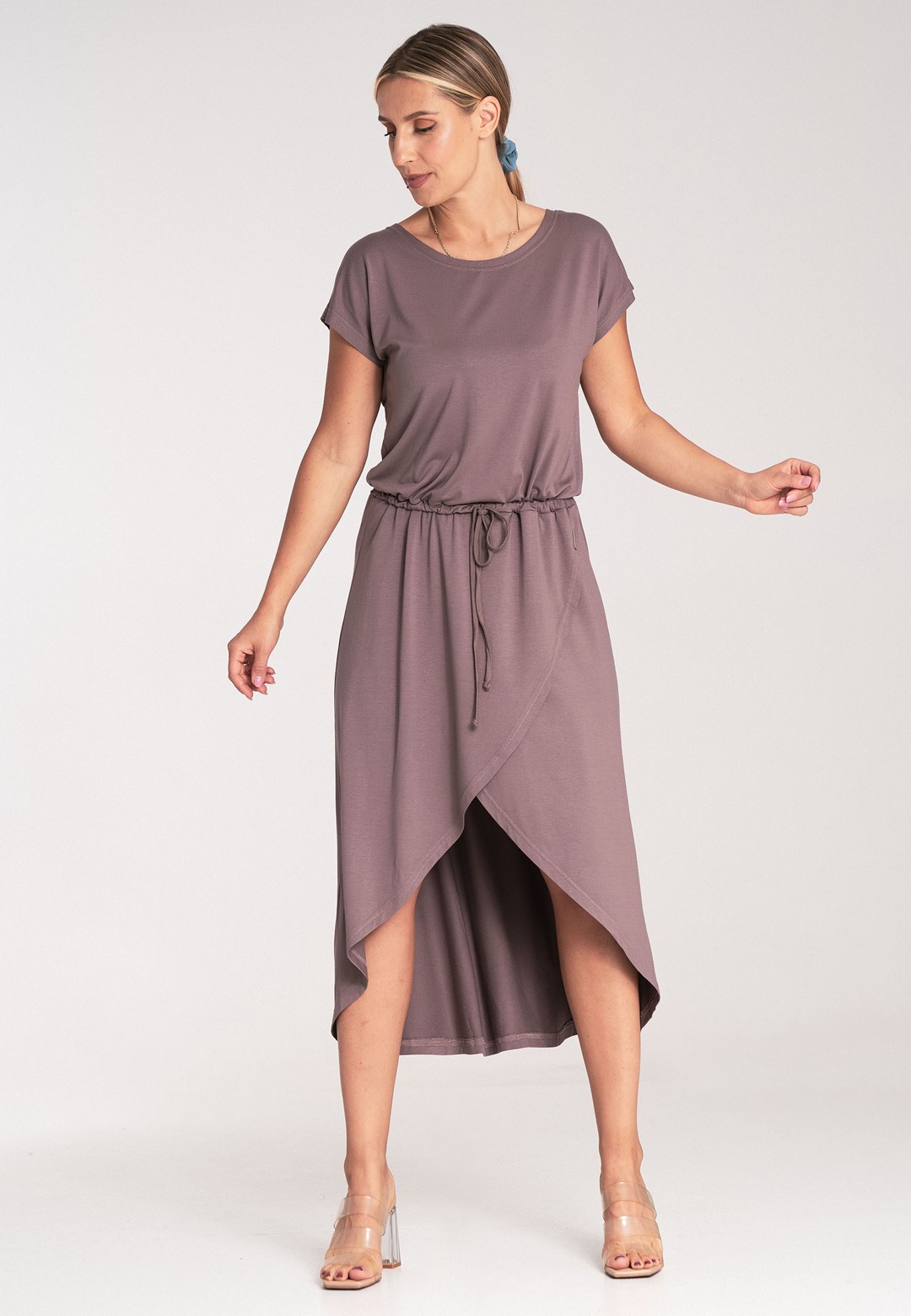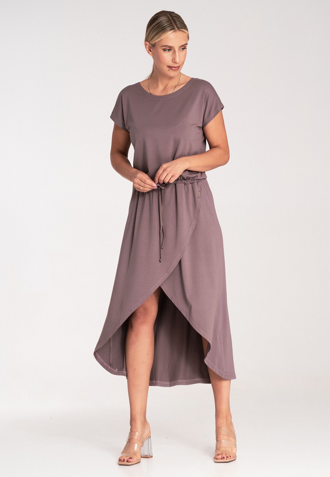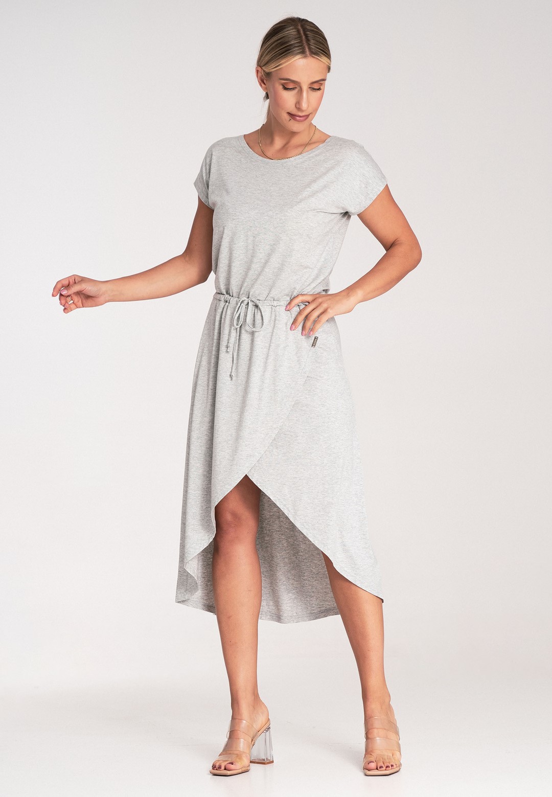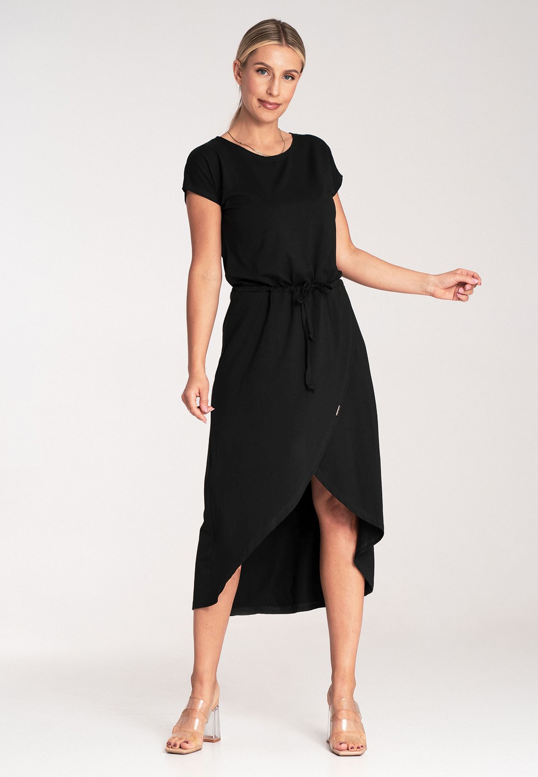 Sukienka asymetryczna to idealna propozycja dla kobiet, które cenią nowoczesny design i naturalne materiały. Wykonana z mieszanki wiskozy i elastanu. Wiskoza pozwala skórze oddychać, jest niezwykle miękka w dotyku i ma delikatny, szlachetny połysk. Dzięki elastanowi materiał jest sprężysty, nie deformuje się i idealnie układa się na ciele. Klasyczny okrągły dekolt oraz krótkie rękawy sprawiają, że sukienka świetnie sprawdza się zarówno w codziennych, jak i nieco bardziej eleganckich zestawieniach. Funkcjonalne wiązanie w pasie troczkami pozwala na idealne dopasowanie sukienki do figury, akcentując wcięcie w talii. Krótszy przód odsłaniający nogi w połączeniu z dłuższym tyłem tworzy intrygującą linię, która optycznie wysmukla sylwetkę. Lekki, trapezowy dół nie krępuje ruchów, zapewniając komfort nawet podczas intensywnego dnia. Asymetryczna sukienka to nie tylko fason, ale prawdziwy kameleon! Zestaw ją z białymi sneakersami, aby uzyskać miejski look, lub załóż sandały na słupku, by stworzyć romantyczną stylizację na wieczorne wyjście.
