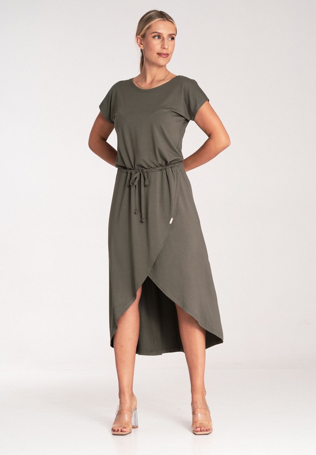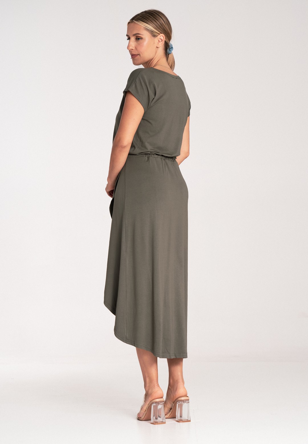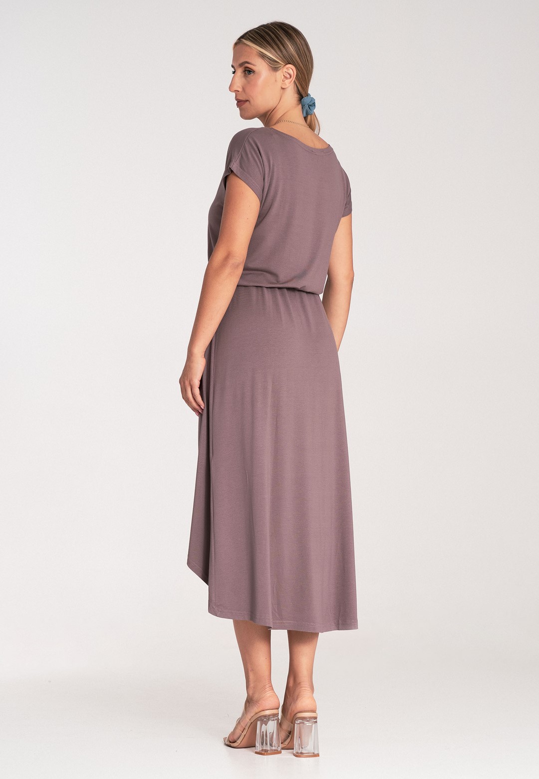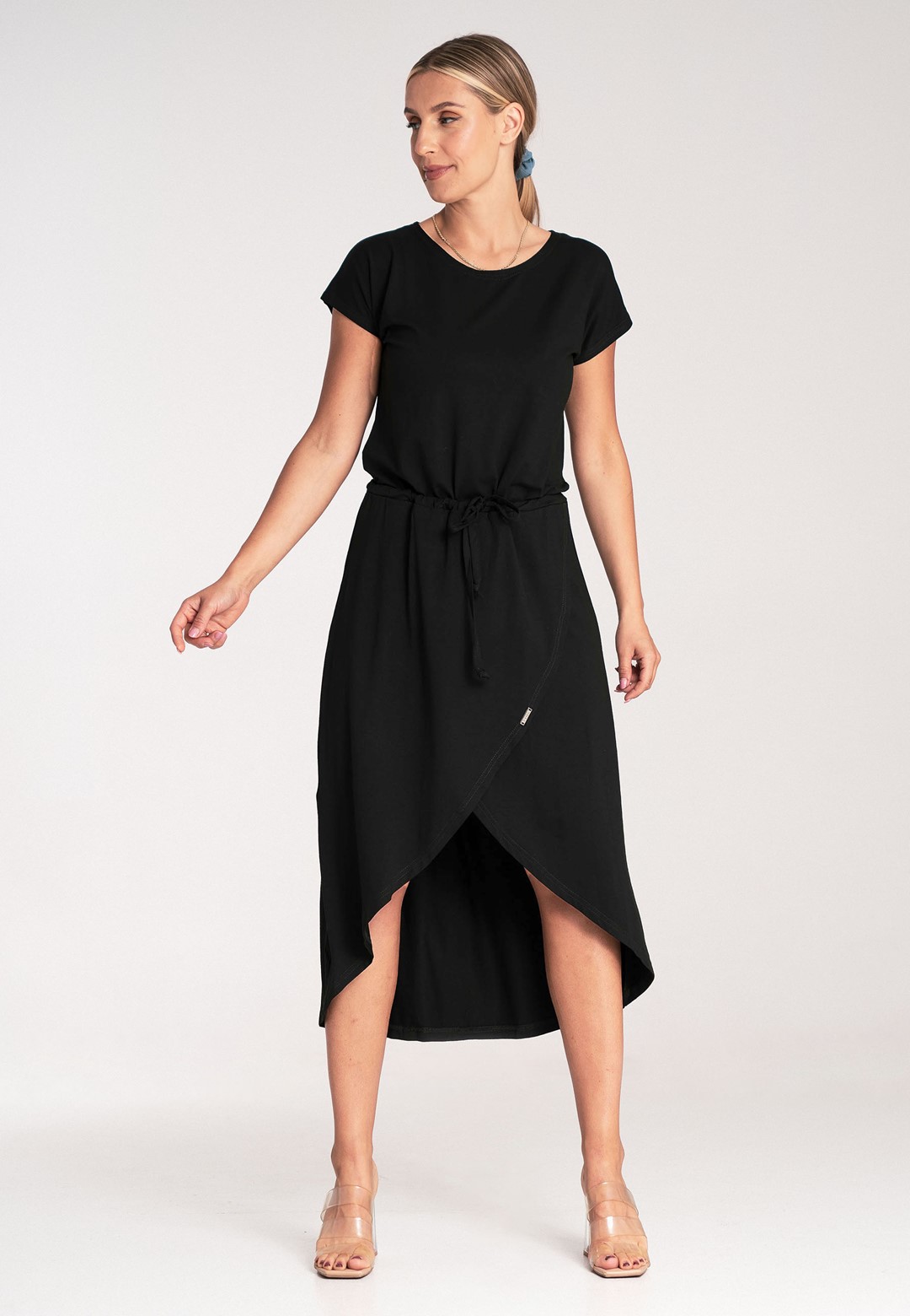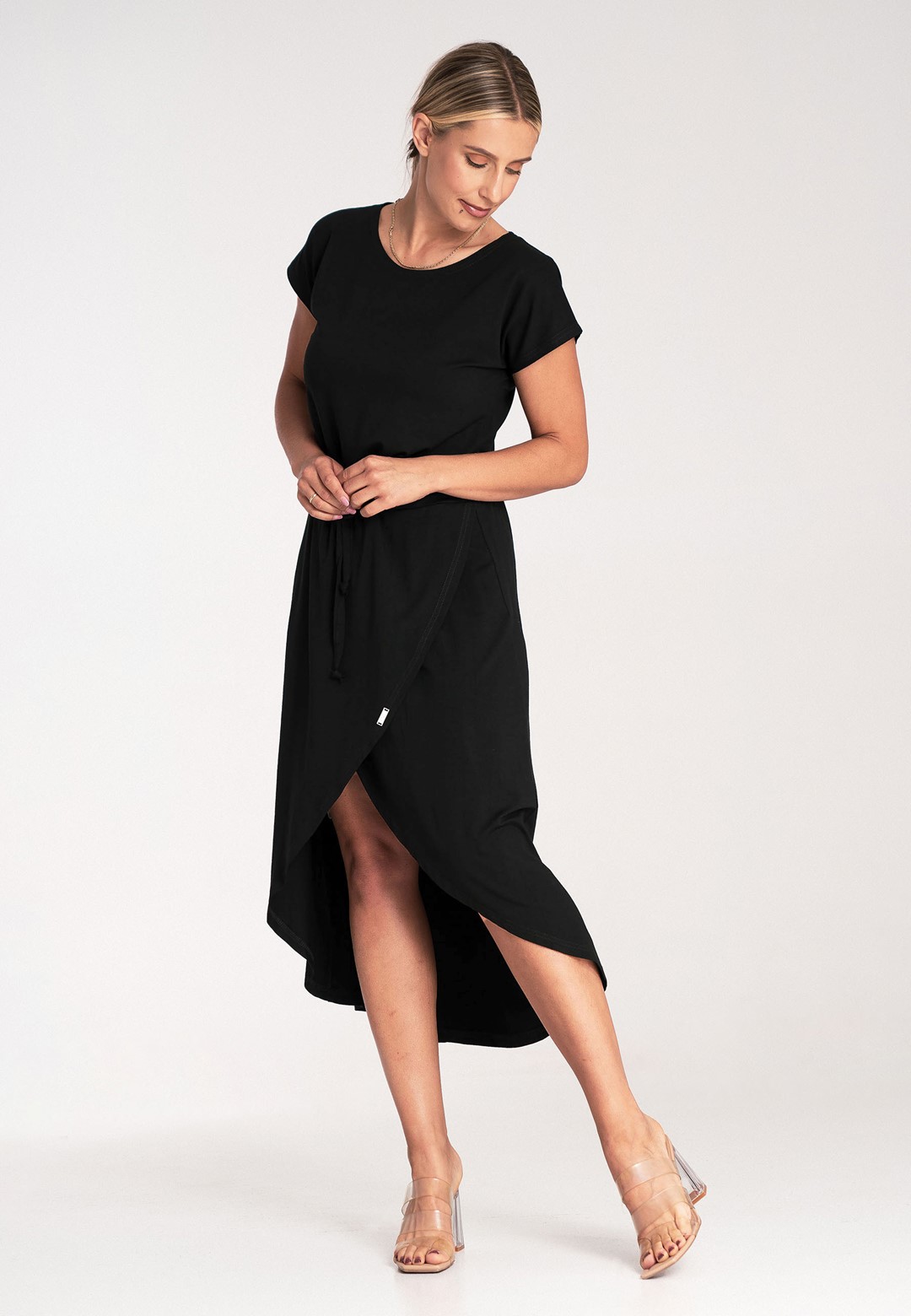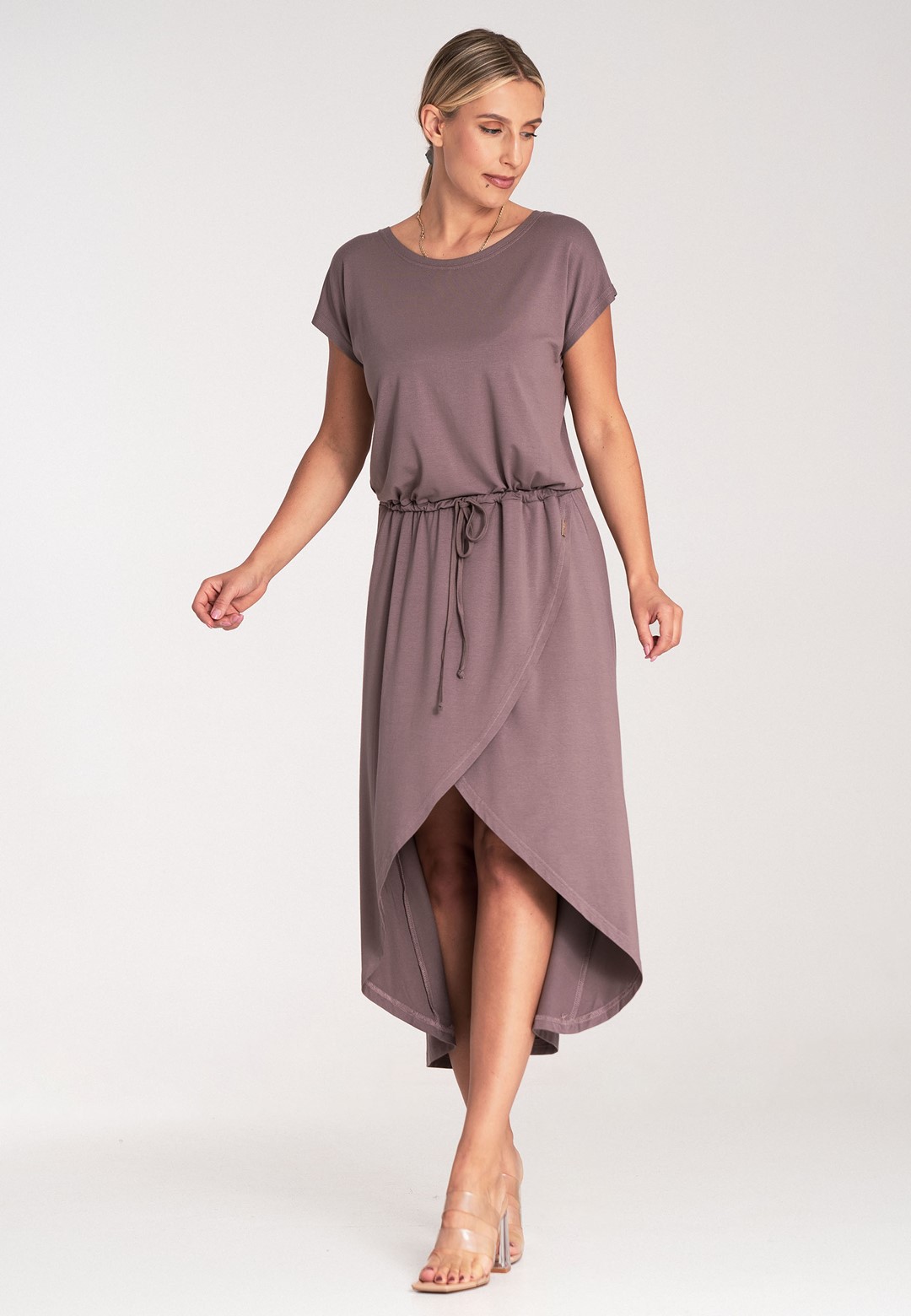 Sukienka asymetryczna to idealna propozycja dla kobiet, które cenią nowoczesny design i naturalne materiały. Wykonana z mieszanki wiskozy i elastanu. Wiskoza pozwala skórze oddychać, jest niezwykle miękka w dotyku i ma delikatny, szlachetny połysk. Dzięki elastanowi materiał jest sprężysty, nie deformuje się i idealnie układa się na ciele. Klasyczny okrągły dekolt oraz krótkie rękawy sprawiają, że sukienka świetnie sprawdza się zarówno w codziennych, jak i nieco bardziej eleganckich zestawieniach. Funkcjonalne wiązanie w pasie troczkami pozwala na idealne dopasowanie sukienki do figury, akcentując wcięcie w talii. Krótszy przód odsłaniający nogi w połączeniu z dłuższym tyłem tworzy intrygującą linię, która optycznie wysmukla sylwetkę. Lekki, trapezowy dół nie krępuje ruchów, zapewniając komfort nawet podczas intensywnego dnia. Asymetryczna sukienka to nie tylko fason, ale prawdziwy kameleon! Zestaw ją z białymi sneakersami, aby uzyskać miejski look, lub załóż sandały na słupku, by stworzyć romantyczną stylizację na wieczorne wyjście.