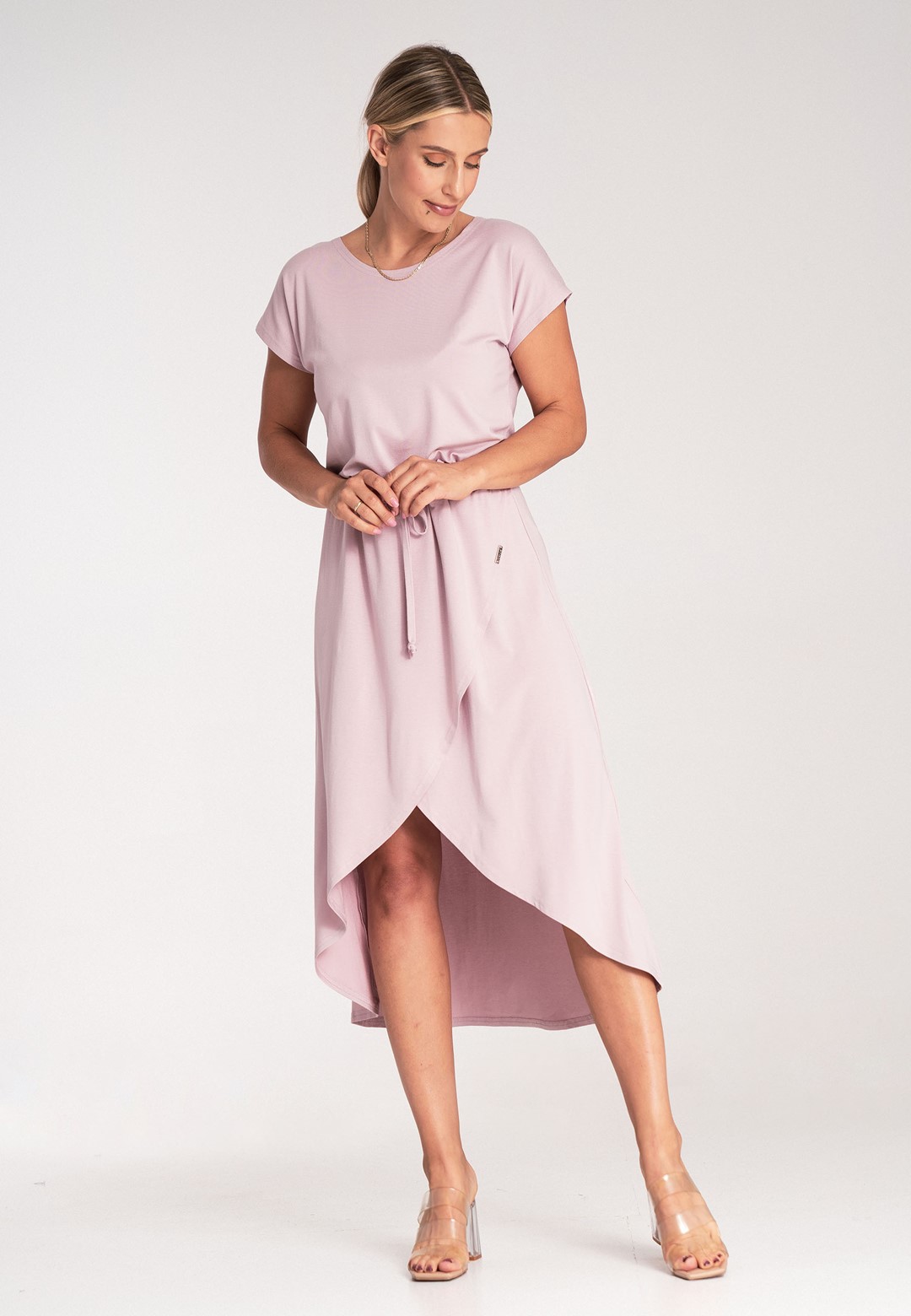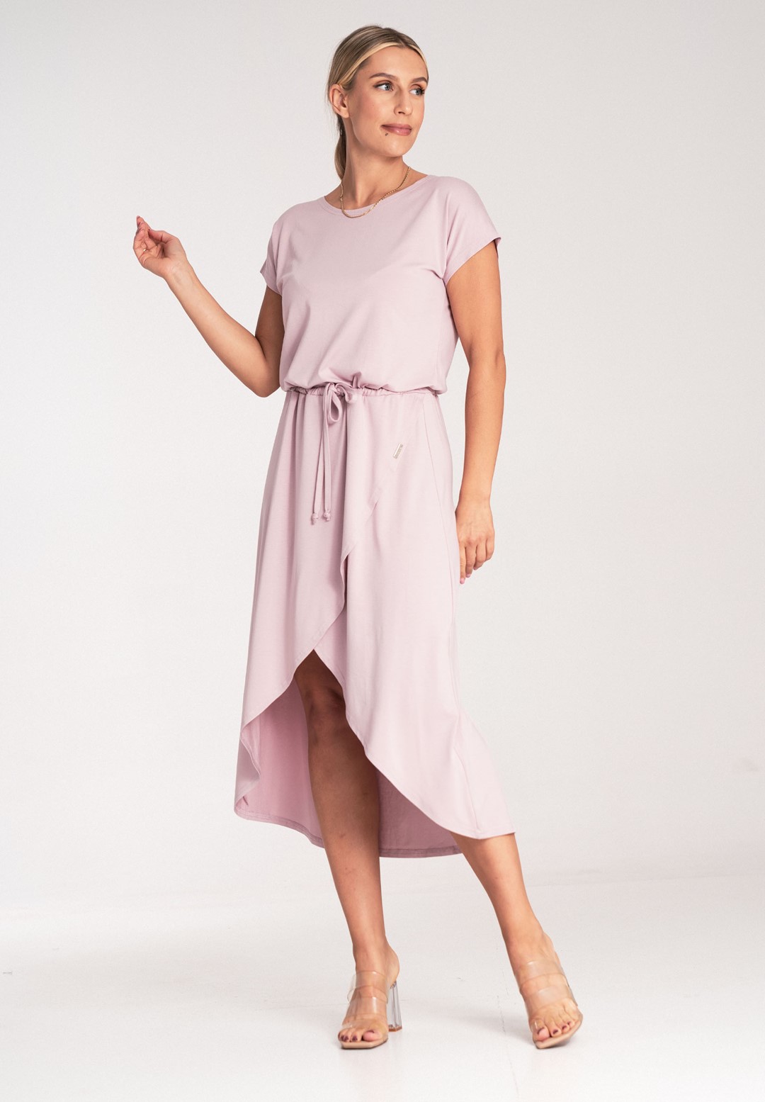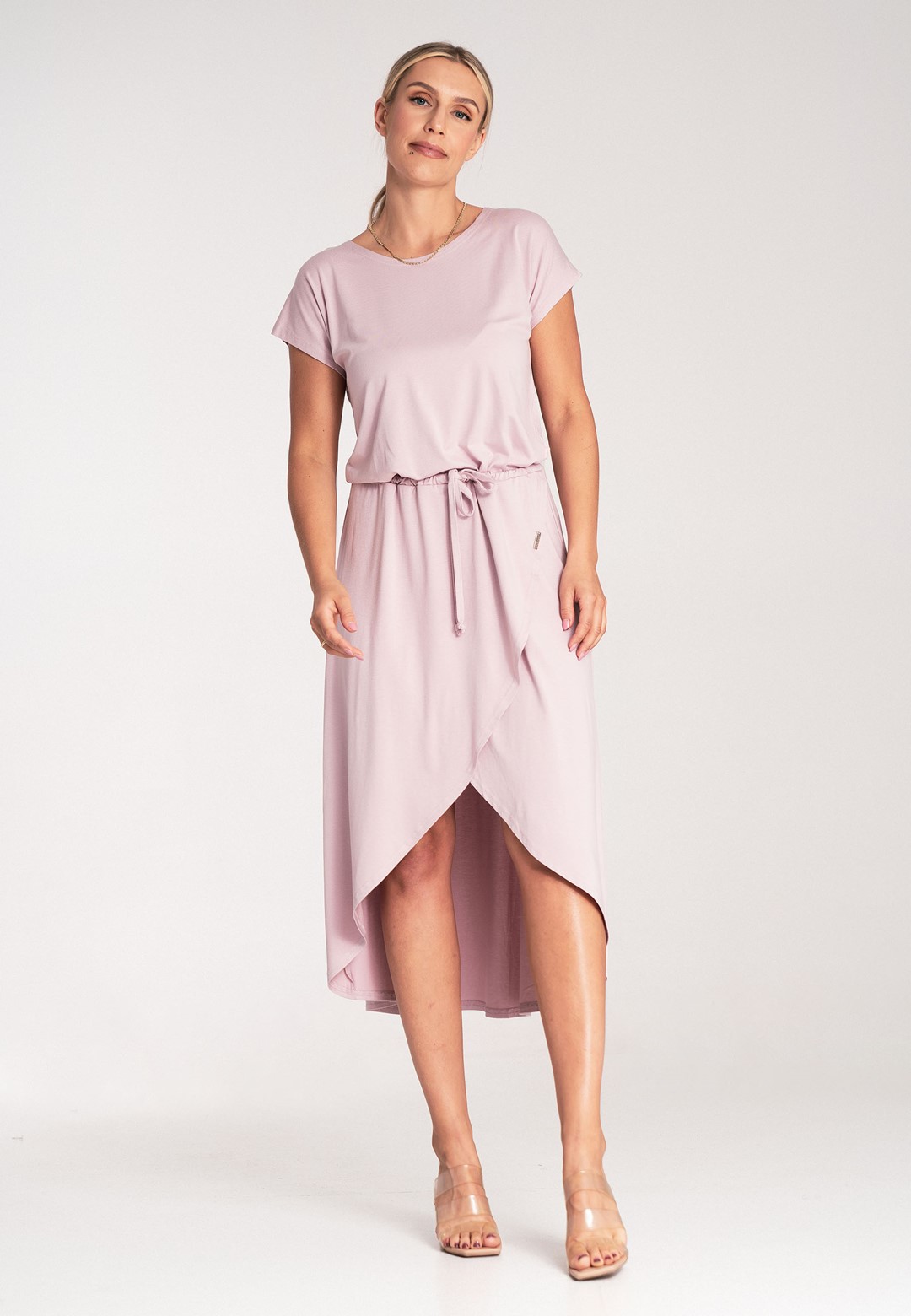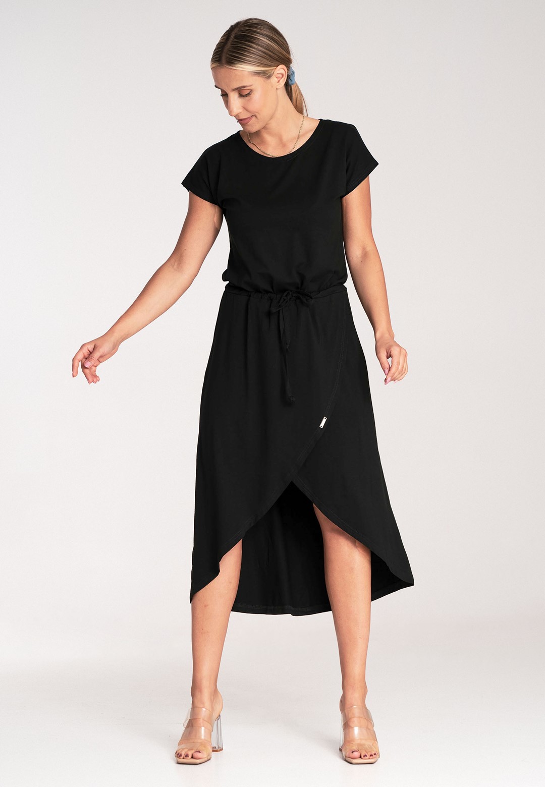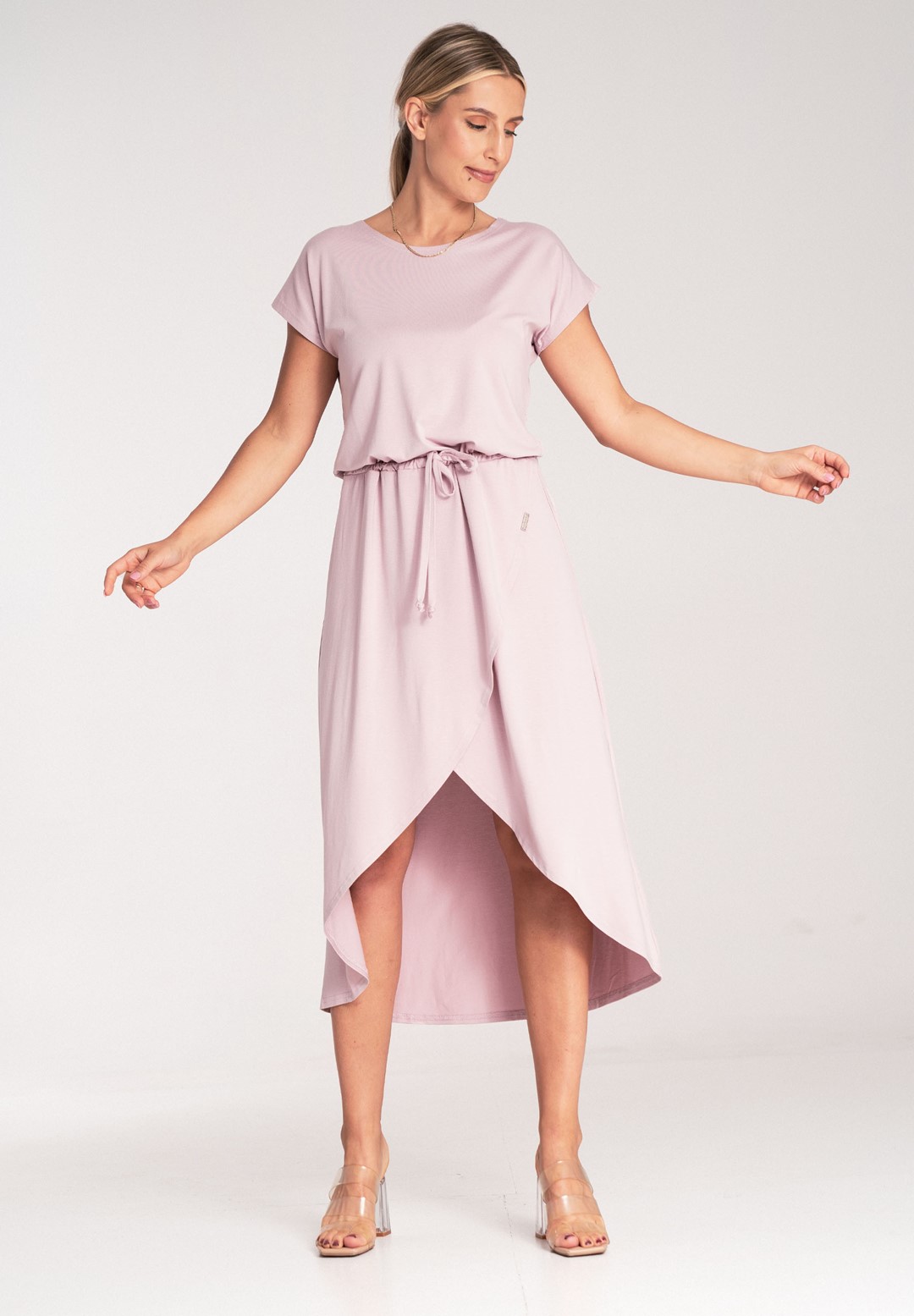 Sukienka asymetryczna to idealna propozycja dla kobiet, które cenią nowoczesny design i naturalne materiały. Wykonana z mieszanki wiskozy i elastanu. Wiskoza pozwala skórze oddychać, jest niezwykle miękka w dotyku i ma delikatny, szlachetny połysk. Dzięki elastanowi materiał jest sprężysty, nie deformuje się i idealnie układa się na ciele. Klasyczny okrągły dekolt oraz krótkie rękawy sprawiają, że sukienka świetnie sprawdza się zarówno w codziennych, jak i nieco bardziej eleganckich zestawieniach. Funkcjonalne wiązanie w pasie troczkami pozwala na idealne dopasowanie sukienki do figury, akcentując wcięcie w talii. Krótszy przód odsłaniający nogi w połączeniu z dłuższym tyłem tworzy intrygującą linię, która optycznie wysmukla sylwetkę. Lekki, trapezowy dół nie krępuje ruchów, zapewniając komfort nawet podczas intensywnego dnia. Asymetryczna sukienka to nie tylko fason, ale prawdziwy kameleon! Zestaw ją z białymi sneakersami, aby uzyskać miejski look, lub załóż sandały na słupku, by stworzyć romantyczną stylizację na wieczorne wyjście.