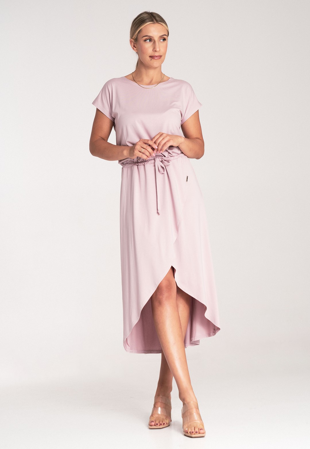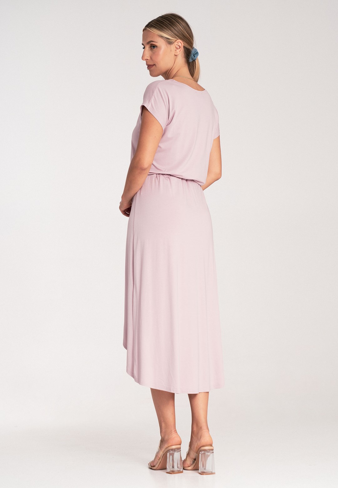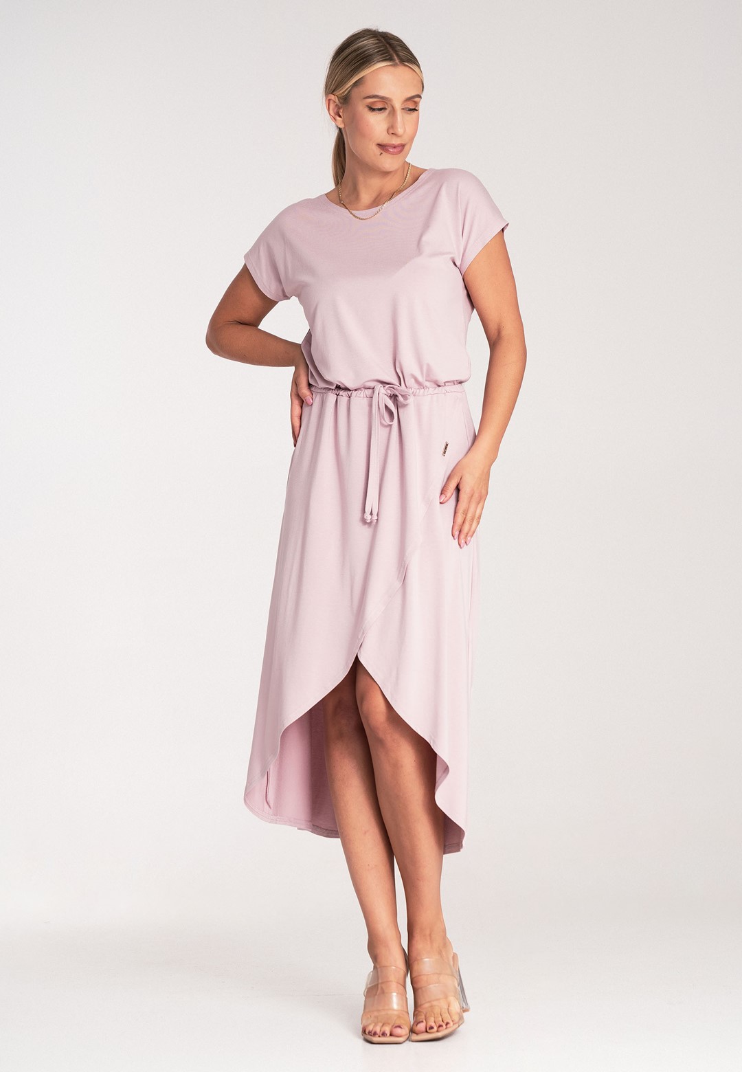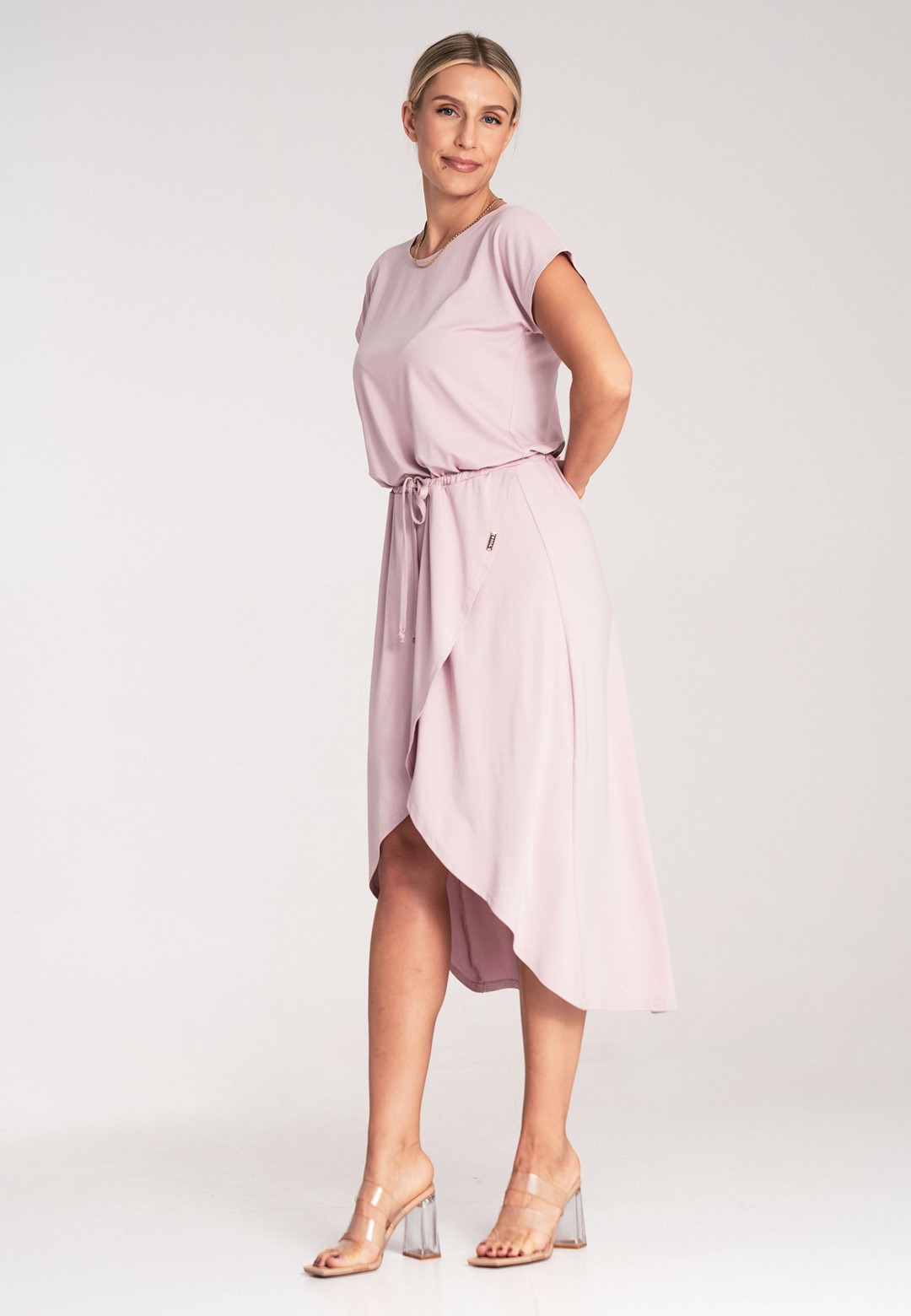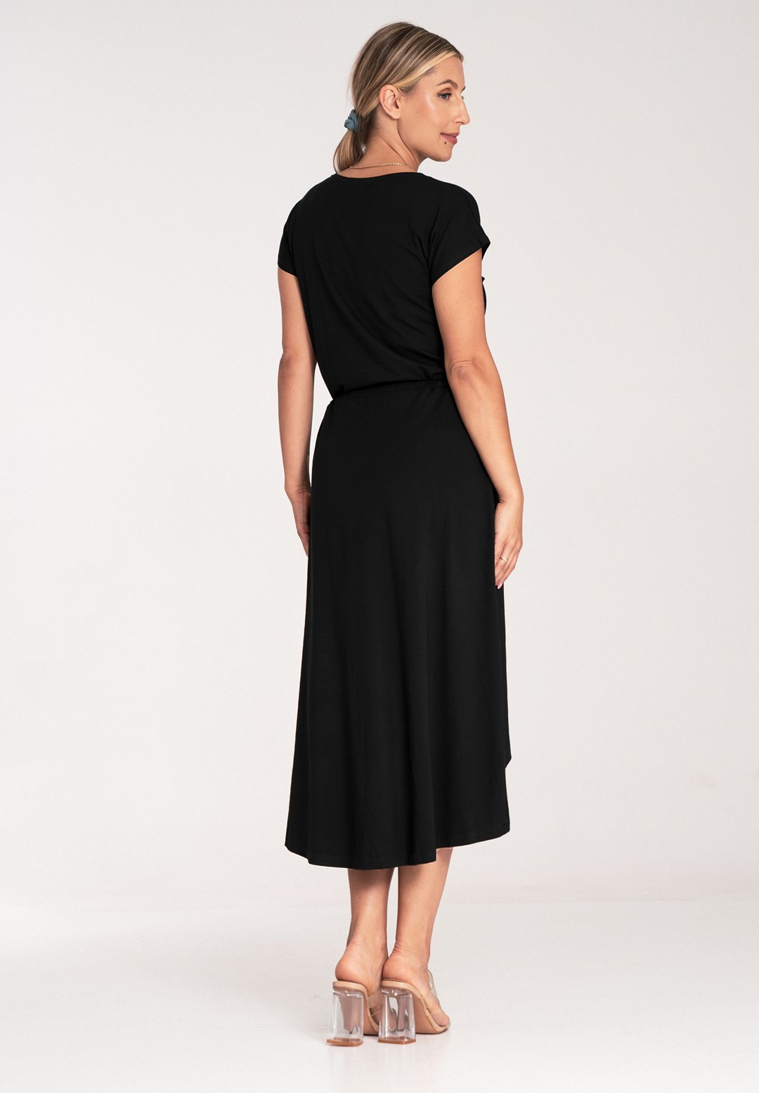 Sukienka asymetryczna to idealna propozycja dla kobiet, które cenią nowoczesny design i naturalne materiały. Wykonana z mieszanki wiskozy i elastanu. Wiskoza pozwala skórze oddychać, jest niezwykle miękka w dotyku i ma delikatny, szlachetny połysk. Dzięki elastanowi materiał jest sprężysty, nie deformuje się i idealnie układa się na ciele. Klasyczny okrągły dekolt oraz krótkie rękawy sprawiają, że sukienka świetnie sprawdza się zarówno w codziennych, jak i nieco bardziej eleganckich zestawieniach. Funkcjonalne wiązanie w pasie troczkami pozwala na idealne dopasowanie sukienki do figury, akcentując wcięcie w talii. Krótszy przód odsłaniający nogi w połączeniu z dłuższym tyłem tworzy intrygującą linię, która optycznie wysmukla sylwetkę. Lekki, trapezowy dół nie krępuje ruchów, zapewniając komfort nawet podczas intensywnego dnia. Asymetryczna sukienka to nie tylko fason, ale prawdziwy kameleon! Zestaw ją z białymi sneakersami, aby uzyskać miejski look, lub załóż sandały na słupku, by stworzyć romantyczną stylizację na wieczorne wyjście.