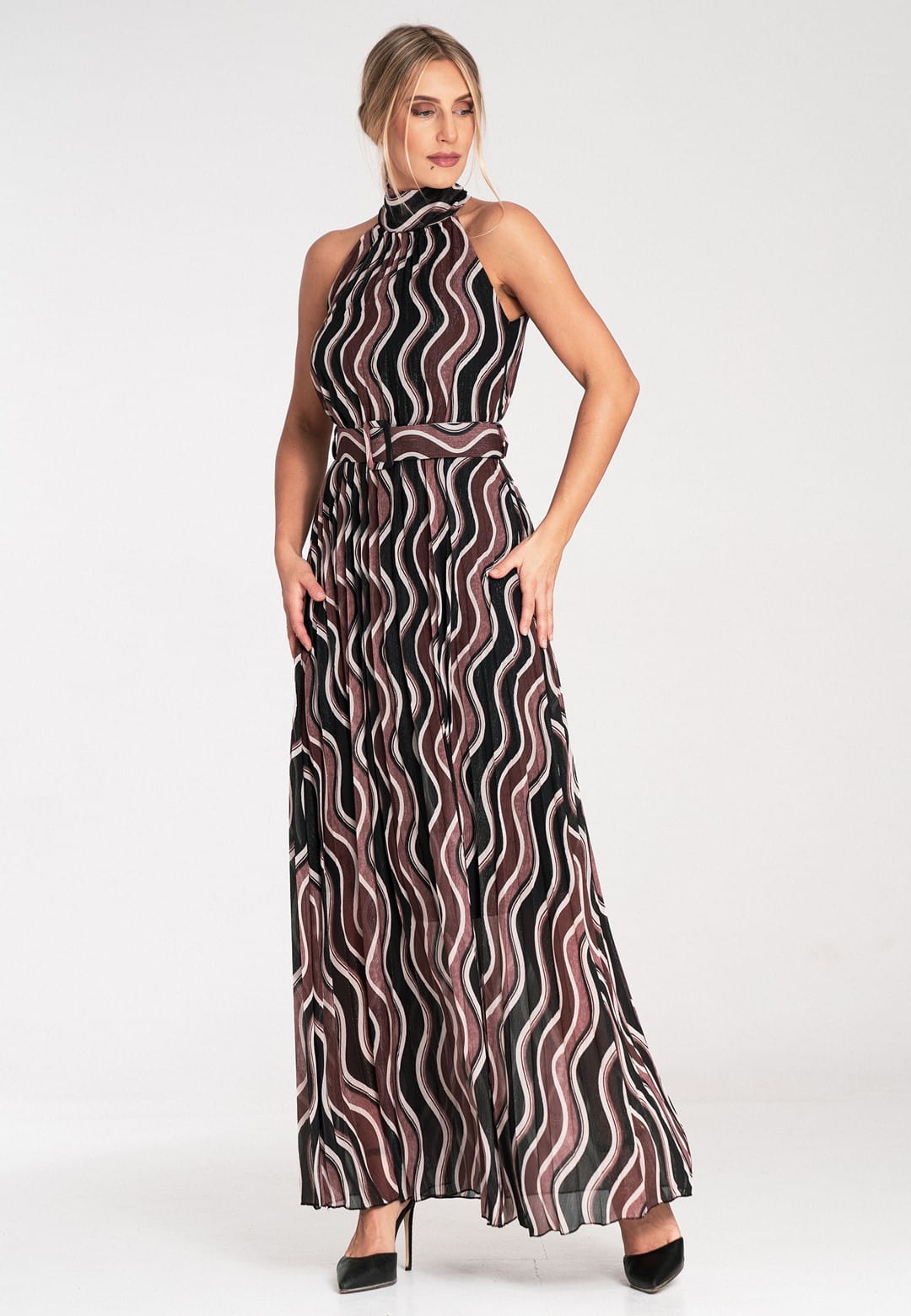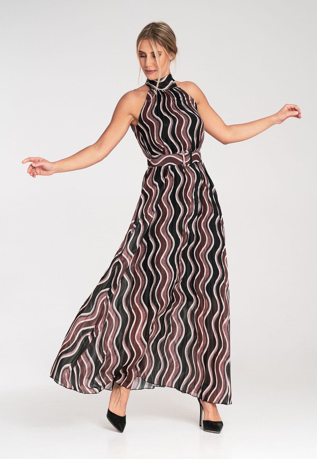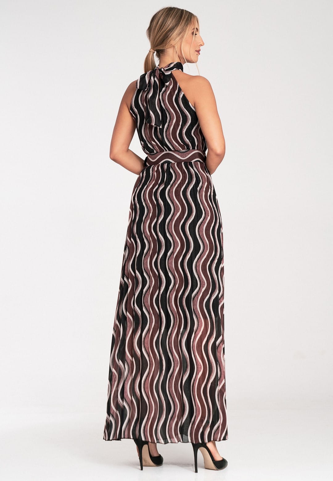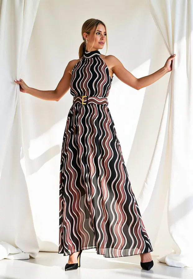 Sukienka bez rękawów to połączenie klasycznej elegancji z nowoczesnymi detalami. Wykonana została z połączenia poliestru z elastanem, dzięki czemu tkanina idealnie układa się na ciele, jest łatwa w pielęgnacji i zapewnia trwałość. Plisowana falista tkanina porusza się z każdym Twoim krokiem, tworząc hipnotyzujący efekt. Wzór w odcieniach bordo, czerni i beżu – stonowana, a zarazem intrygująca kolorystyka, która nadaje sukience wyrafinowanego charakteru. Wysoki dekolt halter i odkryte ramiona to elegancki fason, który pięknie eksponuje szyję i ramiona dodając elegancji i kobiecości. Wiązanie na szyi pozwala na idealne dopasowanie i dodaje uroku. Pasek z klamrą, ten sam falisty wzór, co sukienka, dzięki czemu idealnie podkreśla talię. Posiada podszewkę, która zapewnia komfort noszenia i sprawia, że materiał nie prześwituje. Długość maxi optycznie wydłuża sylwetkę i dodaje szyku. Elegancka sukienka bez rękawów idealna na wesele, przyjęcie, randkę czy uroczysty wieczór.