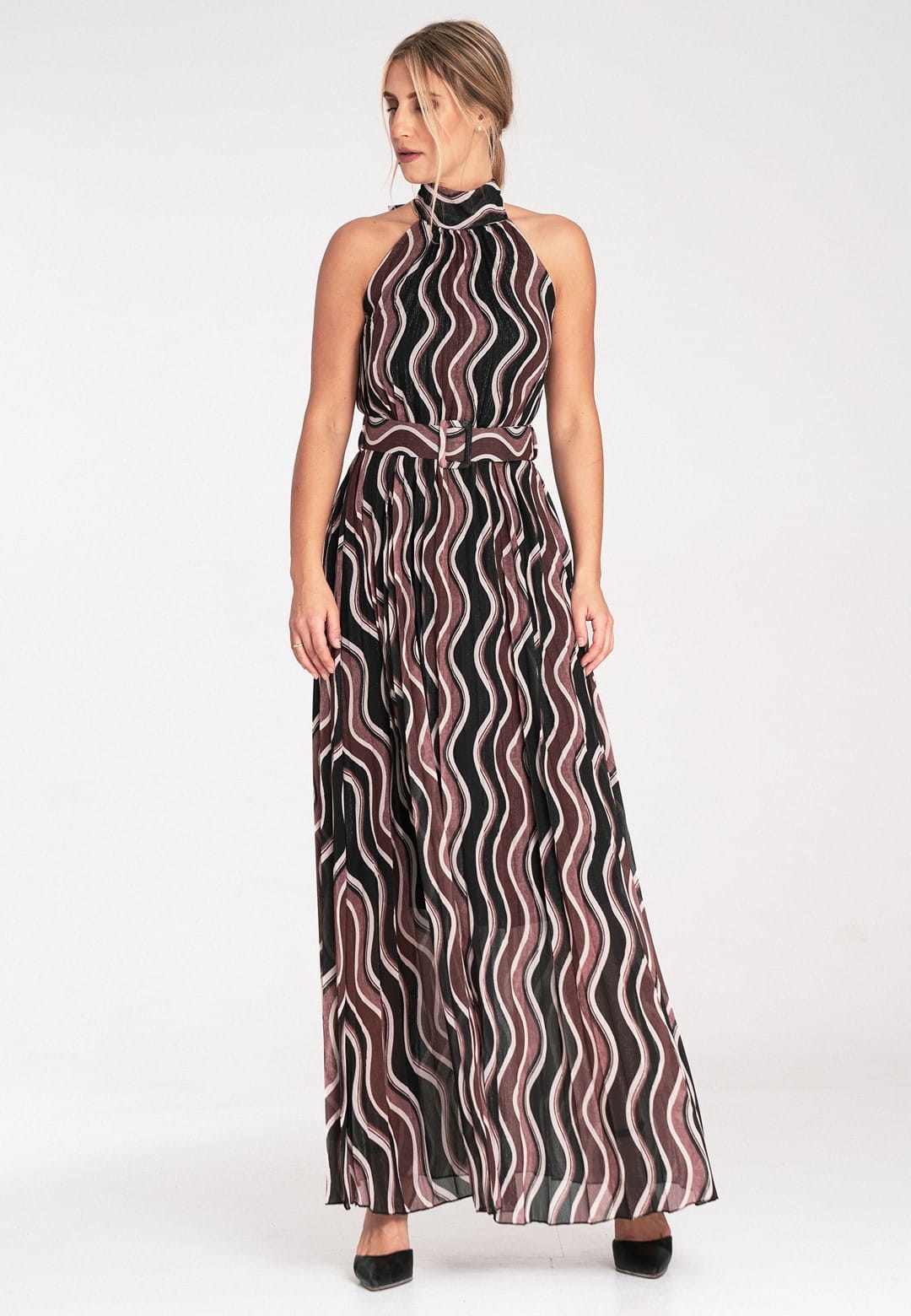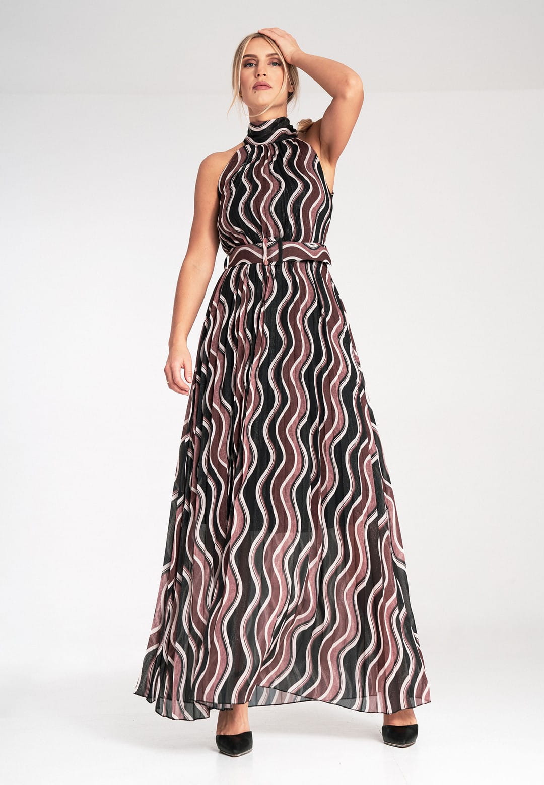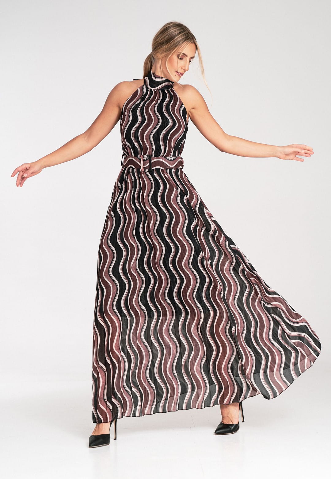 Sukienka bez rękawów to połączenie klasycznej elegancji z nowoczesnymi detalami. Wykonana została z połączenia poliestru z elastanem, dzięki czemu tkanina idealnie układa się na ciele, jest łatwa w pielęgnacji i zapewnia trwałość. Plisowana falista tkanina porusza się z każdym Twoim krokiem, tworząc hipnotyzujący efekt. Wzór w odcieniach bordo, czerni i beżu – stonowana, a zarazem intrygująca kolorystyka, która nadaje sukience wyrafinowanego charakteru. Wysoki dekolt halter i odkryte ramiona to elegancki fason, który pięknie eksponuje szyję i ramiona dodając elegancji i kobiecości. Wiązanie na szyi pozwala na idealne dopasowanie i dodaje uroku. Pasek z klamrą, ten sam falisty wzór, co sukienka, dzięki czemu idealnie podkreśla talię. Posiada podszewkę, która zapewnia komfort noszenia i sprawia, że materiał nie prześwituje. Długość maxi optycznie wydłuża sylwetkę i dodaje szyku. Elegancka sukienka bez rękawów idealna na wesele, przyjęcie, randkę czy uroczysty wieczór.