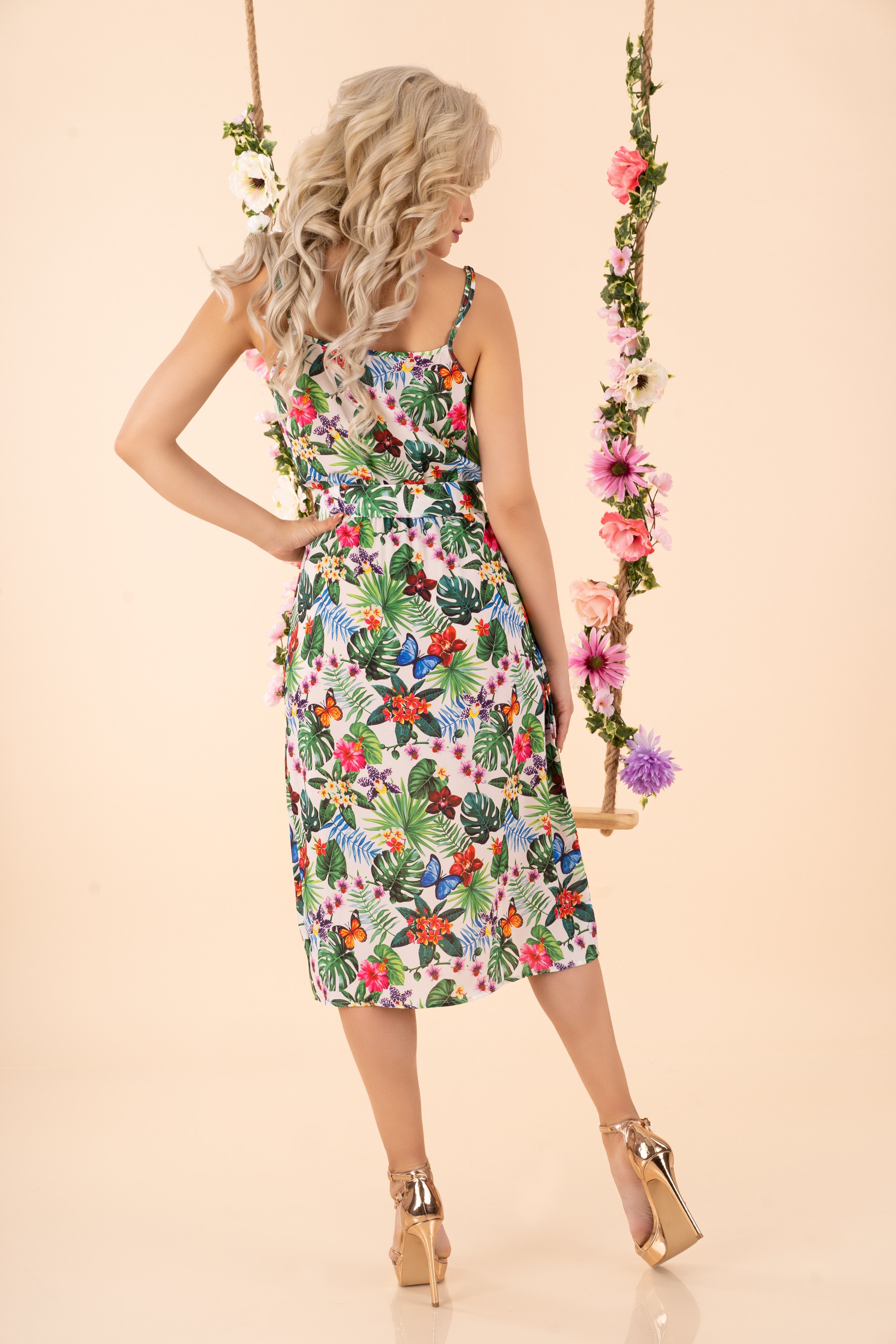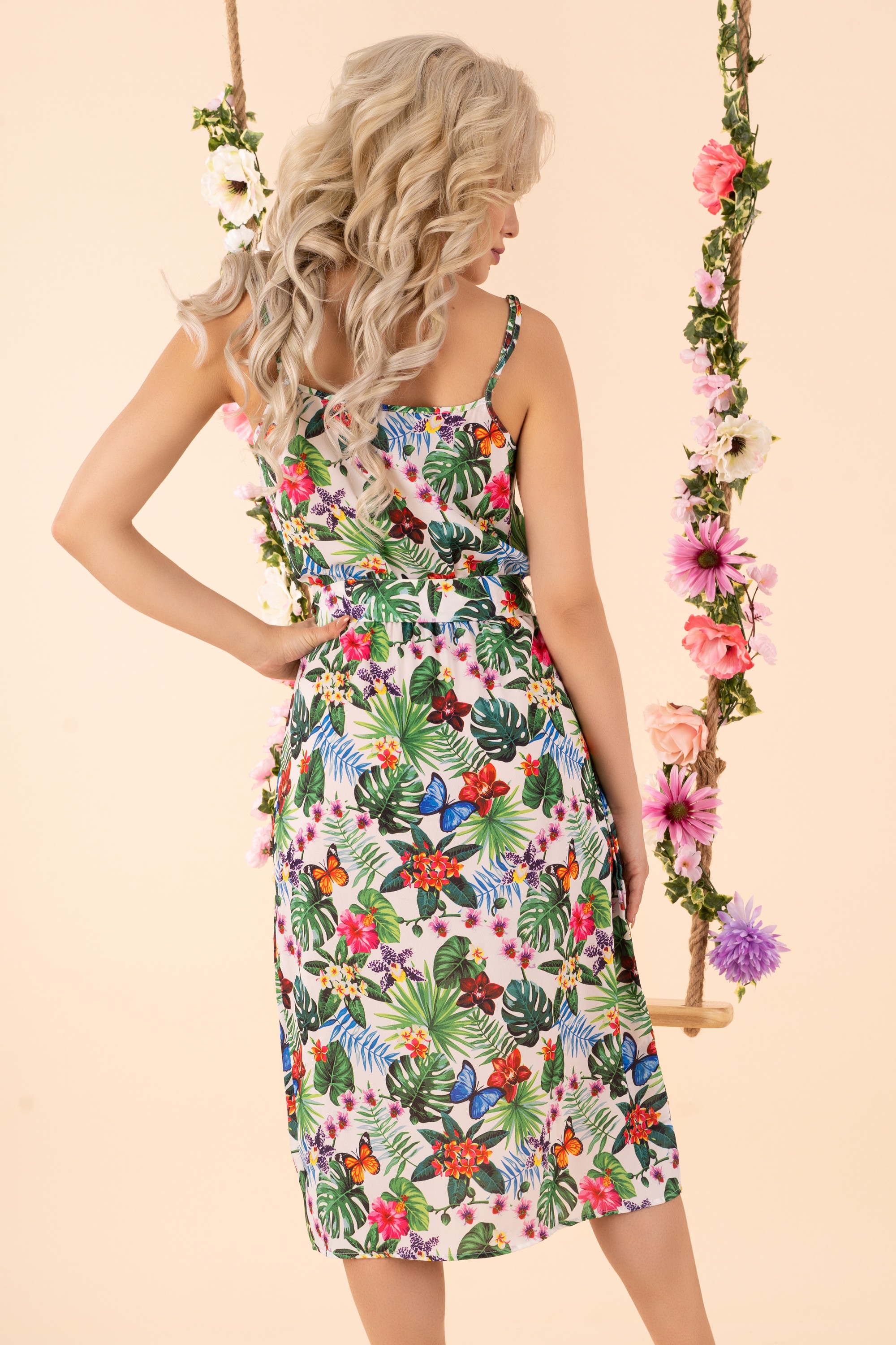 Sukienka długa kwiaty to propozycja, która zachwyca lekkością i dbałością o detale. Została wykonana z wysokiej jakości mieszanki poliestru i elastanu. Dzięki temu materiał jest odporny na zagniecenia, lekko się naddaje, dopasowując się do kształtów ciała, szybko schnie i zachowuje intensywność kolorów kwiatowego printu nawet po wielu praniach. Wyróżnia się przemyślanym fasonem i została zaprojektowana, by podkreślać atuty sylwetki, zapewniając jednocześnie pełną swobodę ruchów. Kwadratowy dekolt (przód i tył) to bardzo modny akcent, który pięknie eksponuje linię obojczyków i plecy. Cienkie, regulowane ramiączka pozwalają na idealne dopasowanie głębokości dekoltu do Twoich potrzeb. Elastyczna gumka w pasie i szlufki gwarantują wygodę i podkreślają talię. Pasek z materiału z brązową okrągłą klamrą dodaje całości charakteru i domyka stylizację, a brązowa klamra paska wprowadza naturalny, nieco rustykalny akcent. Fason z rozporkiem efektownie odsłania nogę w ruchu, dodając sukience lekkości. Prosty krój o długości midi to klasyka, która nigdy nie wychodzi z mody. Długa sukienka w kwiaty sprawdzi się zarówno podczas letnich spacerów, jak i eleganckich przyjęć w ogrodzie.