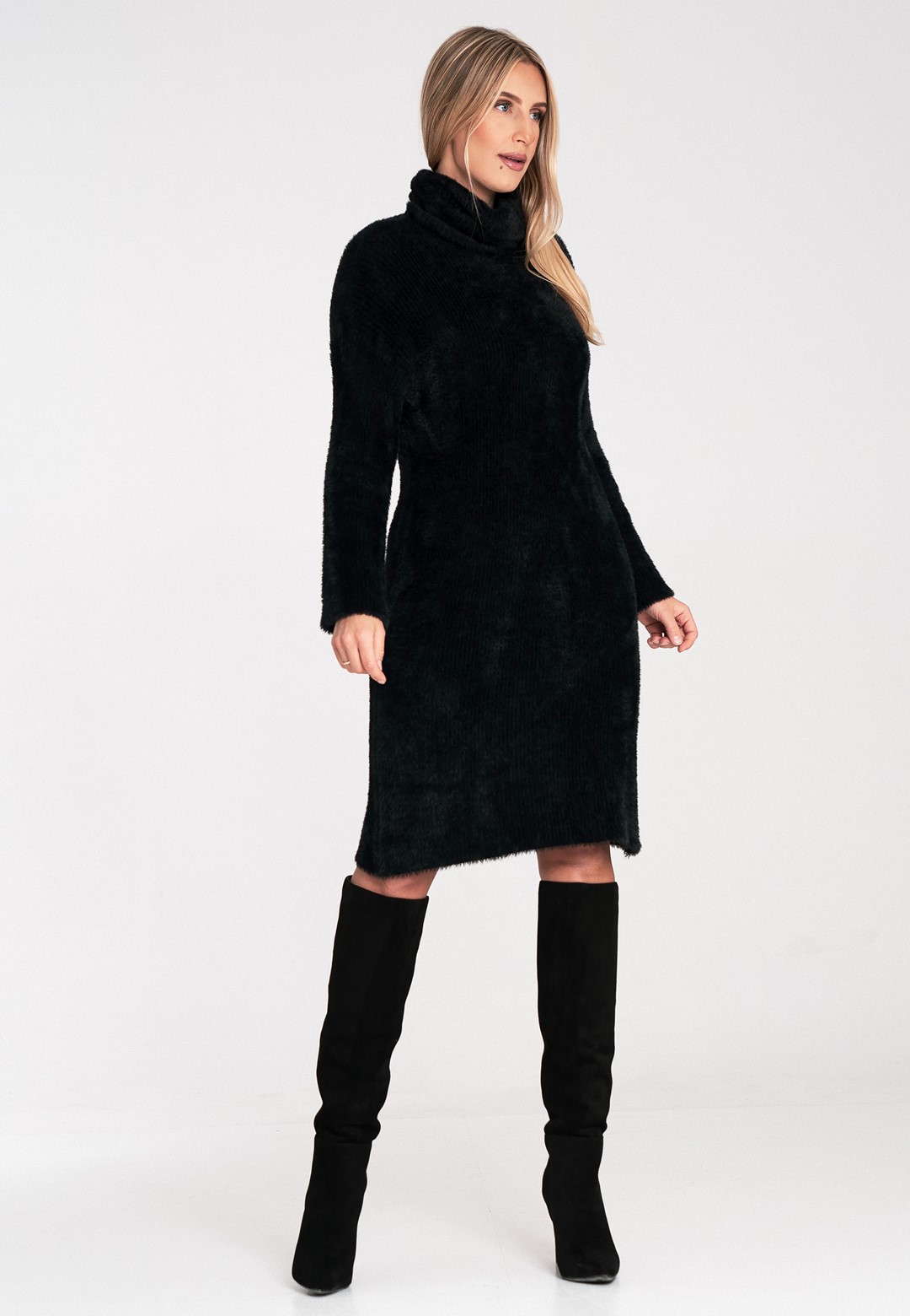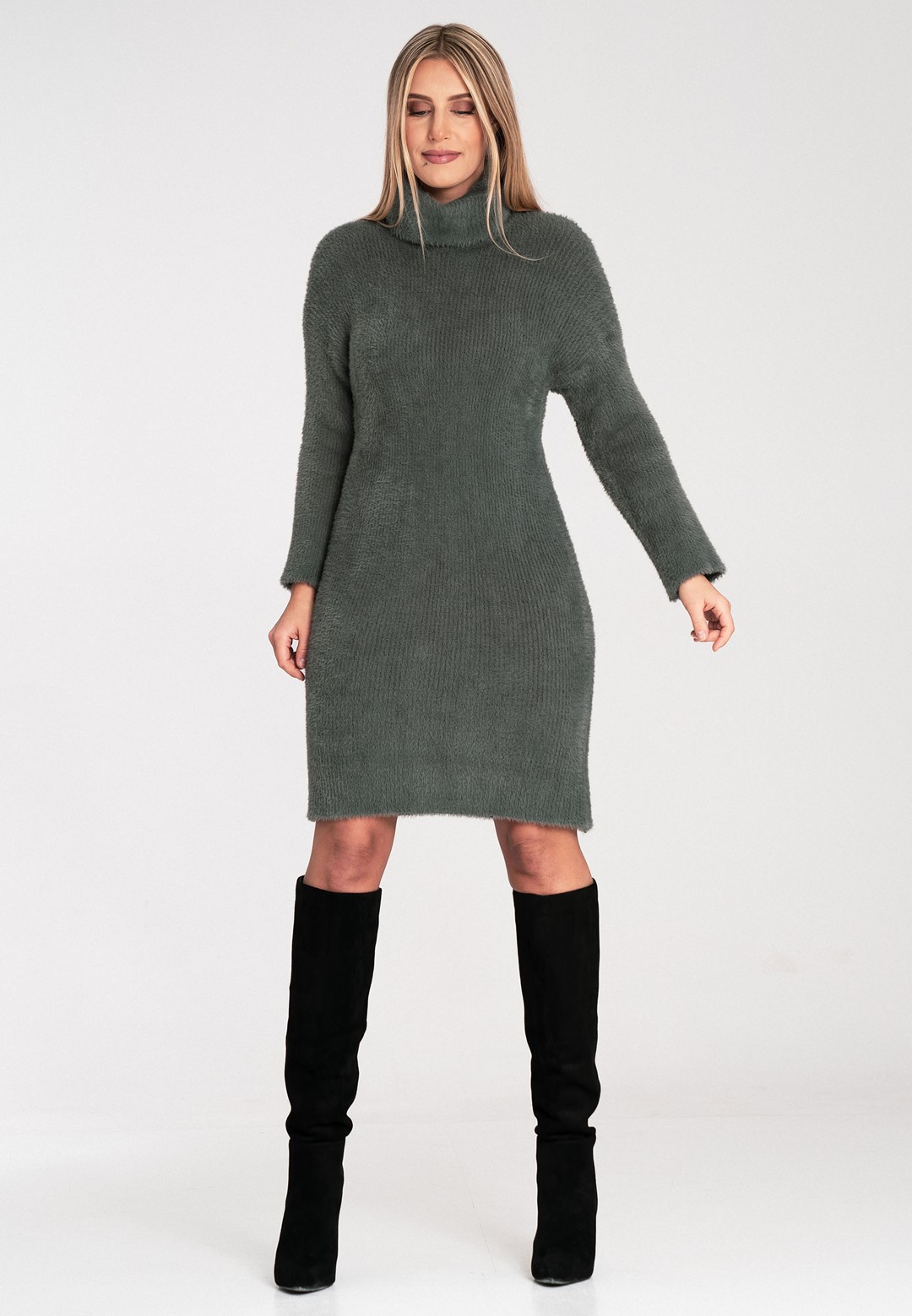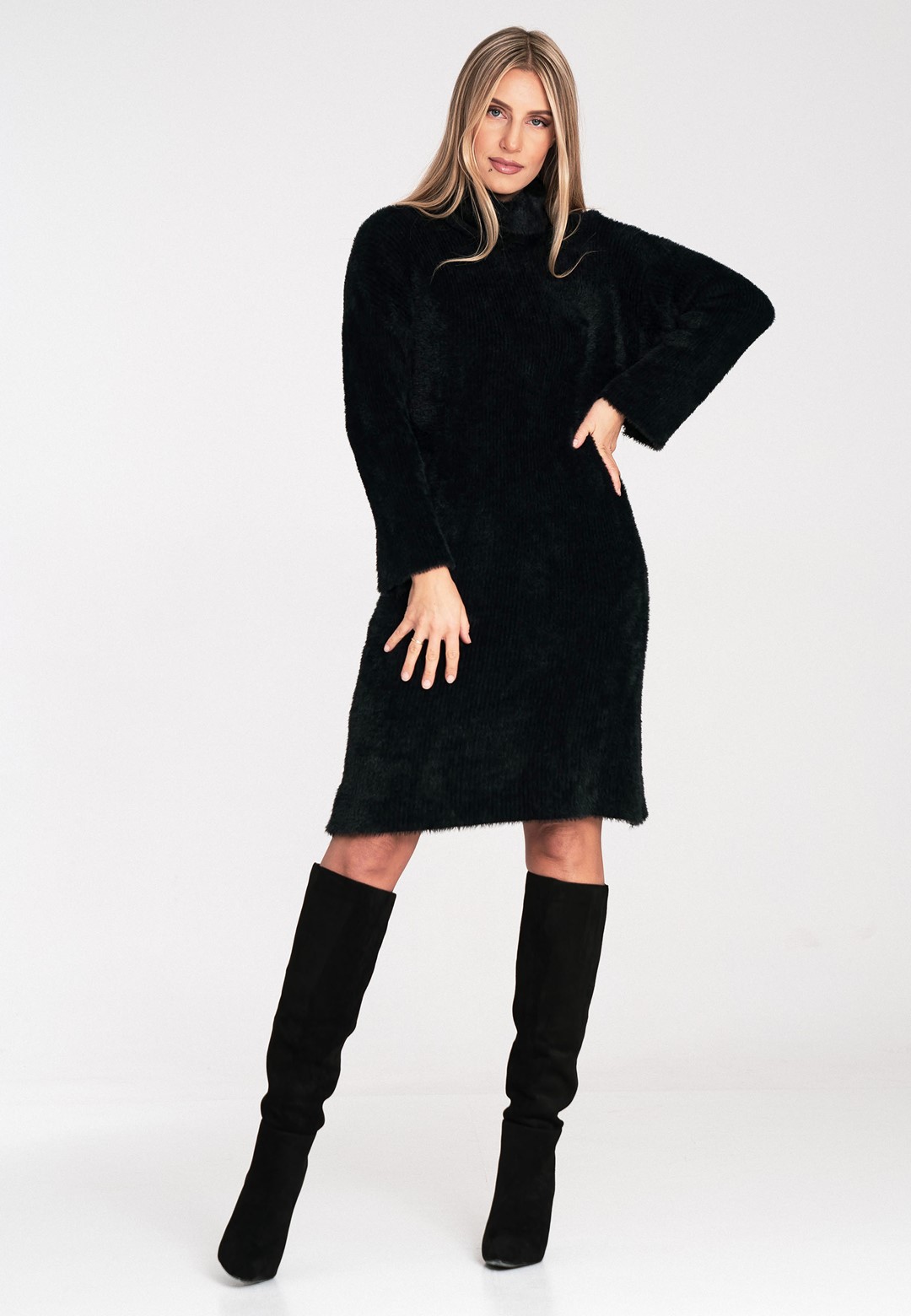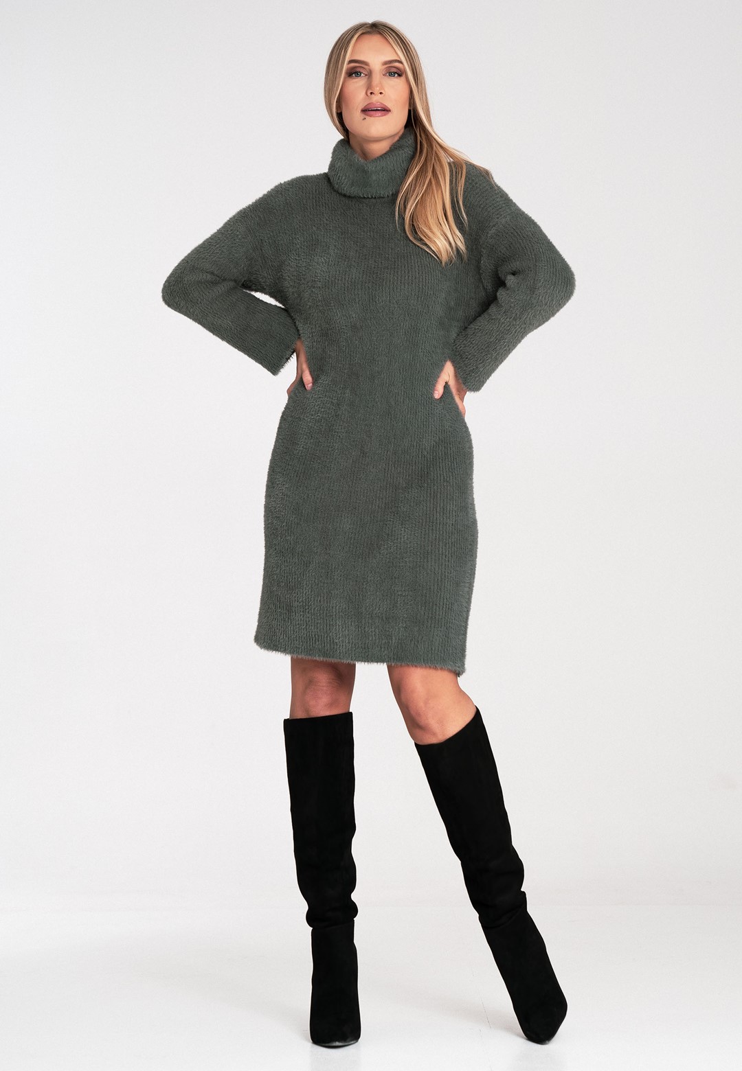 Sukienka dzianinowa – Twój styl na chłodne dni. Wykonana z lekkiego, wytrzymałego i łatwego w pielęgnacji nylonu, który doskonale trzyma formę. Sukienka z miękkiej puszystej dzianiny w delikatne prążki zapewnia przyjemne ciepło i komfort noszenia, a subtelne prążki dodają elegancji. Odwijany golf to klasyczny i modny element, który chroni szyję przed chłodem i dodaje sukience szyku. Obniżona linia ramion zapewnia luźniejszy, swobodny wygląd i maksymalny komfort podczas noszenia. Długie rękawy typu dzwon są modnym akcentem, który nadaje sukience oryginalny charakter. Lekko dopasowany krój podkreśla sylwetkę, ale nie krępuje ruchów, zapewniając komfort przez cały dzień. Długość przed kolano dodaje lekkości i świeżości, optycznie wysmukla i wydłuża nogi, jest uniwersalna i praktyczna. Dzianinowa sukienka to idealny element Twojej garderoby, który sprawdzi się w wielu sytuacjach. Możesz ją nosić na co dzień, do biura, na spotkanie z przyjaciółmi, a nawet na bardziej formalne wyjścia, dodając eleganckie dodatki. Dodatkowo pasuje zarówno do botków, jak i kozaków.