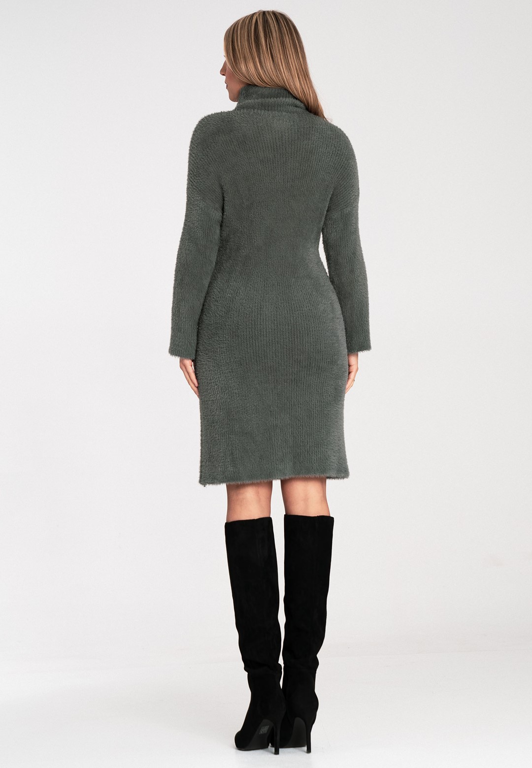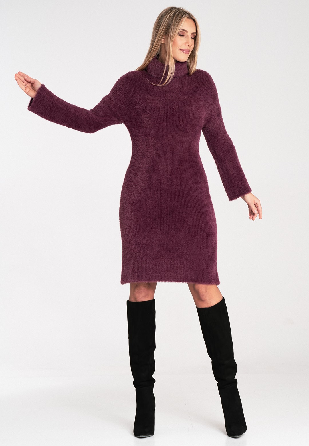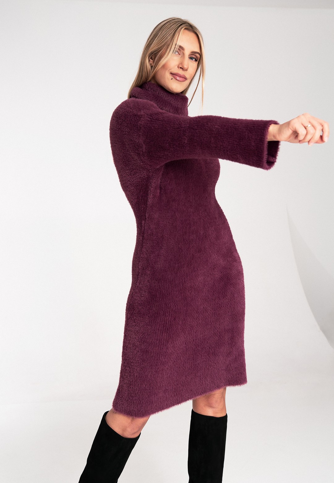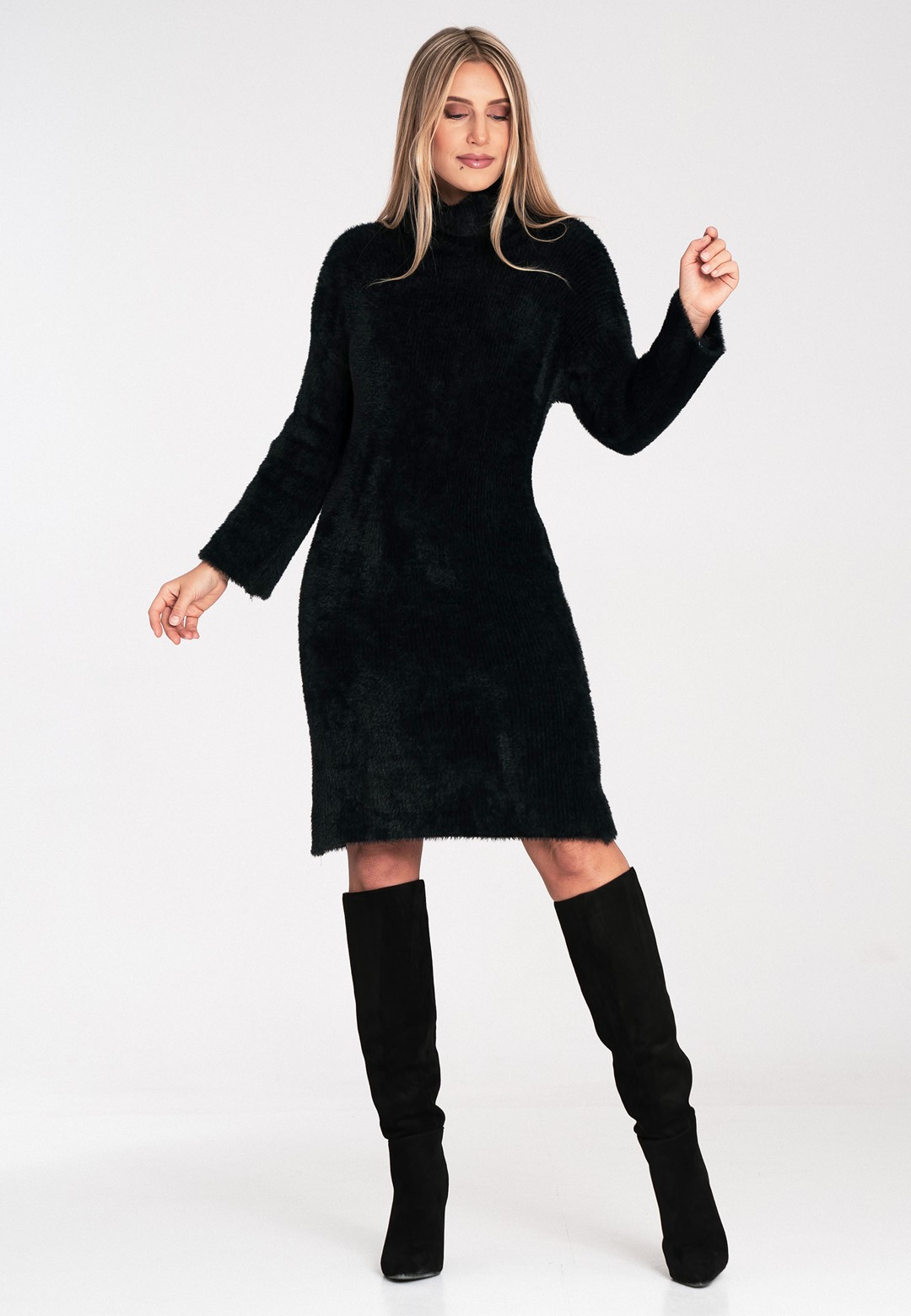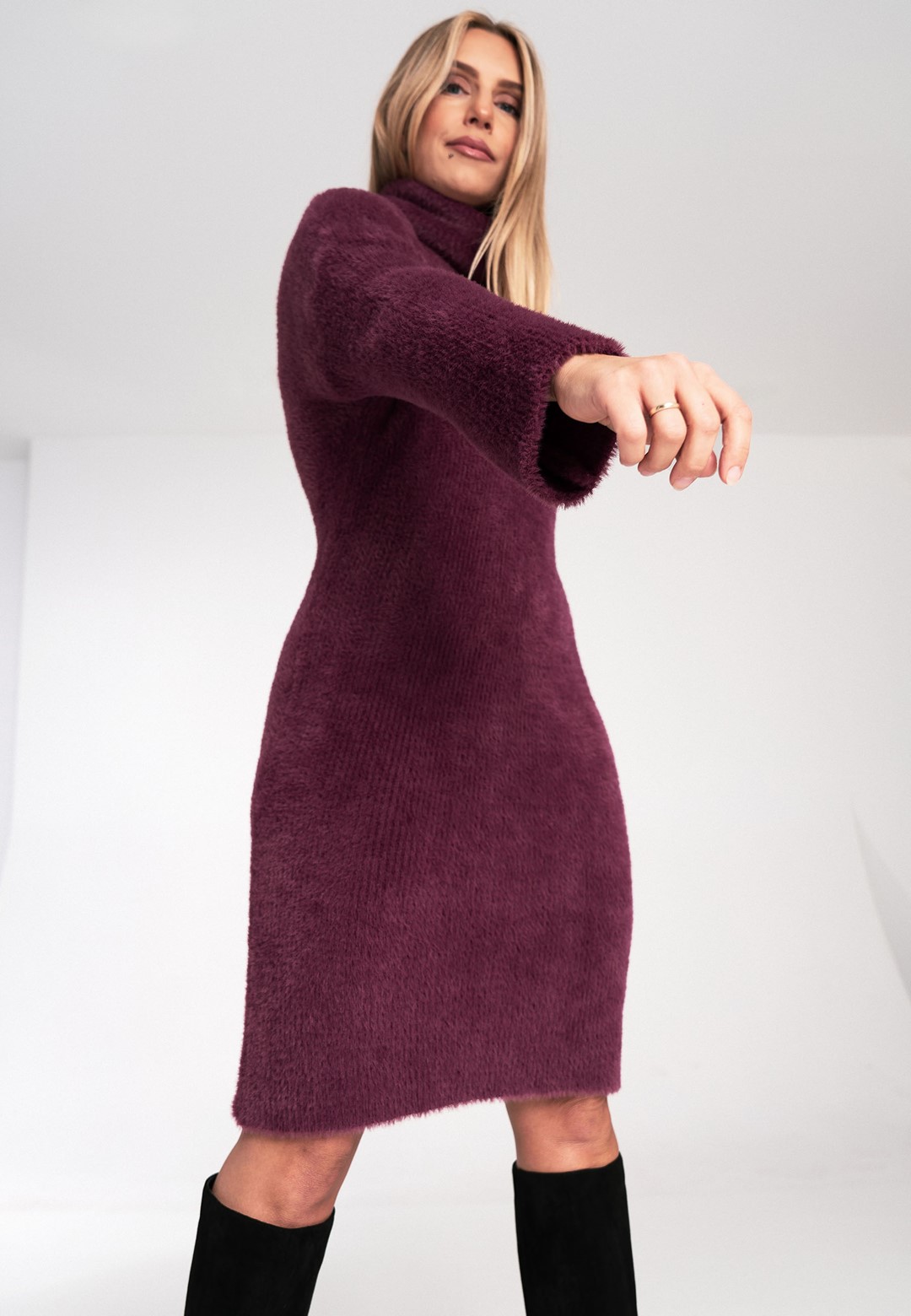 Sukienka dzianinowa – Twój styl na chłodne dni. Wykonana z lekkiego, wytrzymałego i łatwego w pielęgnacji nylonu, który doskonale trzyma formę. Sukienka z miękkiej puszystej dzianiny w delikatne prążki zapewnia przyjemne ciepło i komfort noszenia, a subtelne prążki dodają elegancji. Odwijany golf to klasyczny i modny element, który chroni szyję przed chłodem i dodaje sukience szyku. Obniżona linia ramion zapewnia luźniejszy, swobodny wygląd i maksymalny komfort podczas noszenia. Długie rękawy typu dzwon są modnym akcentem, który nadaje sukience oryginalny charakter. Lekko dopasowany krój podkreśla sylwetkę, ale nie krępuje ruchów, zapewniając komfort przez cały dzień. Długość przed kolano dodaje lekkości i świeżości, optycznie wysmukla i wydłuża nogi, jest uniwersalna i praktyczna. Dzianinowa sukienka to idealny element Twojej garderoby, który sprawdzi się w wielu sytuacjach. Możesz ją nosić na co dzień, do biura, na spotkanie z przyjaciółmi, a nawet na bardziej formalne wyjścia, dodając eleganckie dodatki. Dodatkowo pasuje zarówno do botków, jak i kozaków.