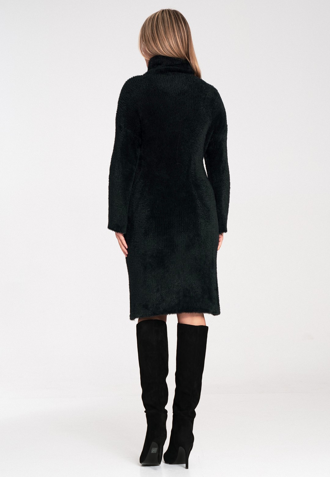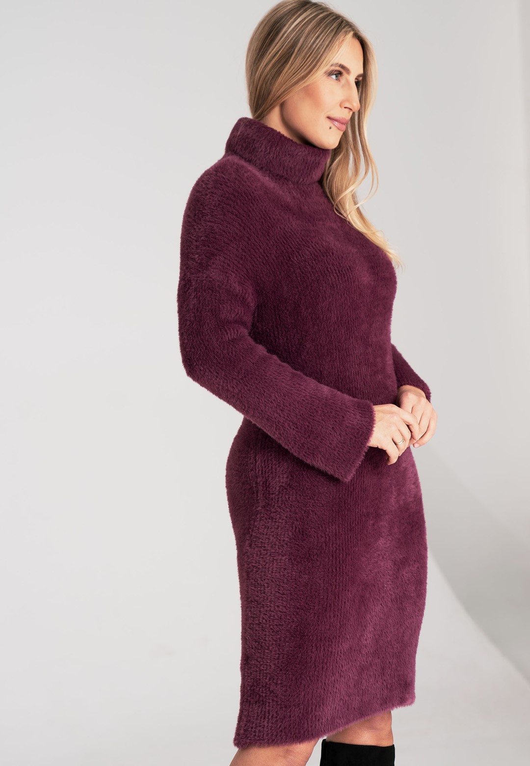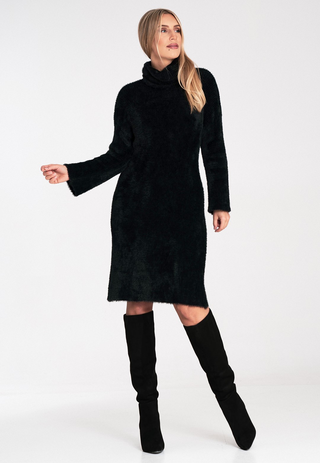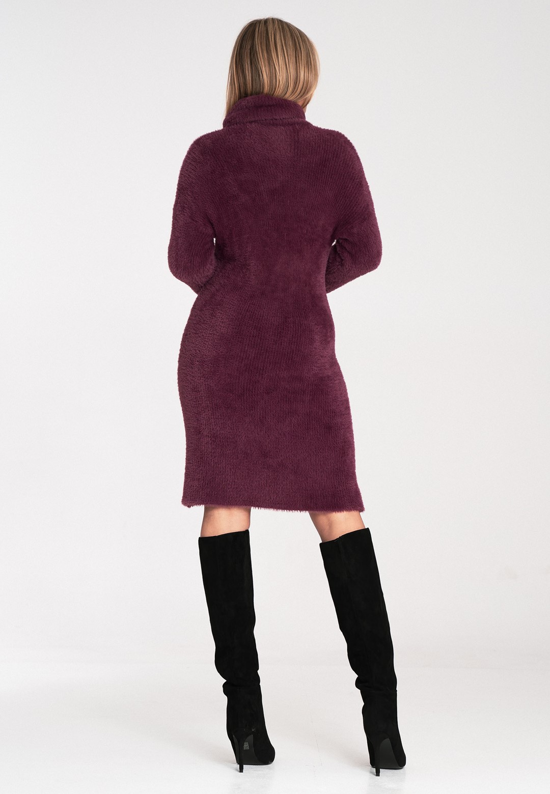 Sukienka dzianinowa – Twój styl na chłodne dni. Wykonana z lekkiego, wytrzymałego i łatwego w pielęgnacji nylonu, który doskonale trzyma formę. Sukienka z miękkiej puszystej dzianiny w delikatne prążki zapewnia przyjemne ciepło i komfort noszenia, a subtelne prążki dodają elegancji. Odwijany golf to klasyczny i modny element, który chroni szyję przed chłodem i dodaje sukience szyku. Obniżona linia ramion zapewnia luźniejszy, swobodny wygląd i maksymalny komfort podczas noszenia. Długie rękawy typu dzwon są modnym akcentem, który nadaje sukience oryginalny charakter. Lekko dopasowany krój podkreśla sylwetkę, ale nie krępuje ruchów, zapewniając komfort przez cały dzień. Długość przed kolano dodaje lekkości i świeżości, optycznie wysmukla i wydłuża nogi, jest uniwersalna i praktyczna. Dzianinowa sukienka to idealny element Twojej garderoby, który sprawdzi się w wielu sytuacjach. Możesz ją nosić na co dzień, do biura, na spotkanie z przyjaciółmi, a nawet na bardziej formalne wyjścia, dodając eleganckie dodatki. Dodatkowo pasuje zarówno do botków, jak i kozaków.