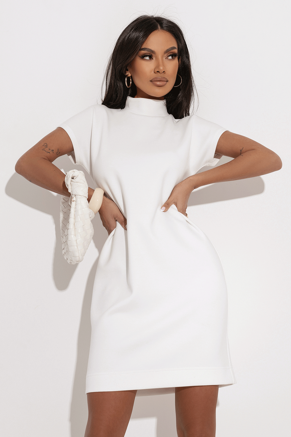 Sukienka dzianinowa damska łączy w sobie komfort, styl i uniwersalność. Wykonana z wyjątkowo miękkiej, elastycznej dzianiny, ta sukienka otuli Cię niczym chmurka, dopasowując się do Twojej sylwetki jak druga skóra. Mieszanka rayonu, nylonu i spandexu zapewnia niezwykłą miękkość, elastyczność i trwałość. Delikatny golf jako elegancki i subtelny detal, który dodaje uroku i chroni przed chłodem. Krótki rękaw idealny na przejściowe pory roku i do tworzenia warstwowych stylizacji, na przykład z żakietem czy kardiganem. Prosty krój to ponadczasowy design, który łatwo dopasować do wielu okazji. Dzięki dopasowanemu krojowi sukienka pięknie modeluje i wyszczupla sylwetkę, podkreślając jej atuty. Długość mini, modna i kobieca długość, która pięknie eksponuje nogi. Ta sukienka dzianinowa damska to must-have w każdej szafie. Jest niezwykle wszechstronna – idealna na co dzień, do pracy czy na spotkanie ze znajomymi. Możesz ją nosić solo lub jako bazę pod marynarkę, ramoneskę czy sweter. Wystarczy, że zmienisz dodatki, założysz do kozaków na obcasie, dodasz złotą biżuterię i jesteś gotowa na wieczorne wyjście. Na co dzień sneakersy i shopperka i tworzysz stylizację effortless look w stylu paryżanek.