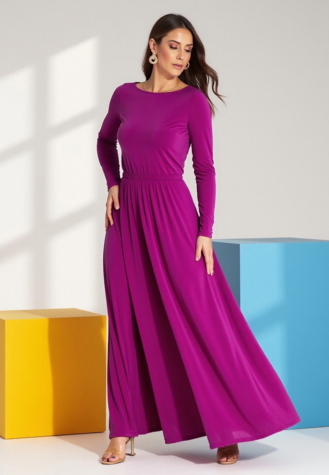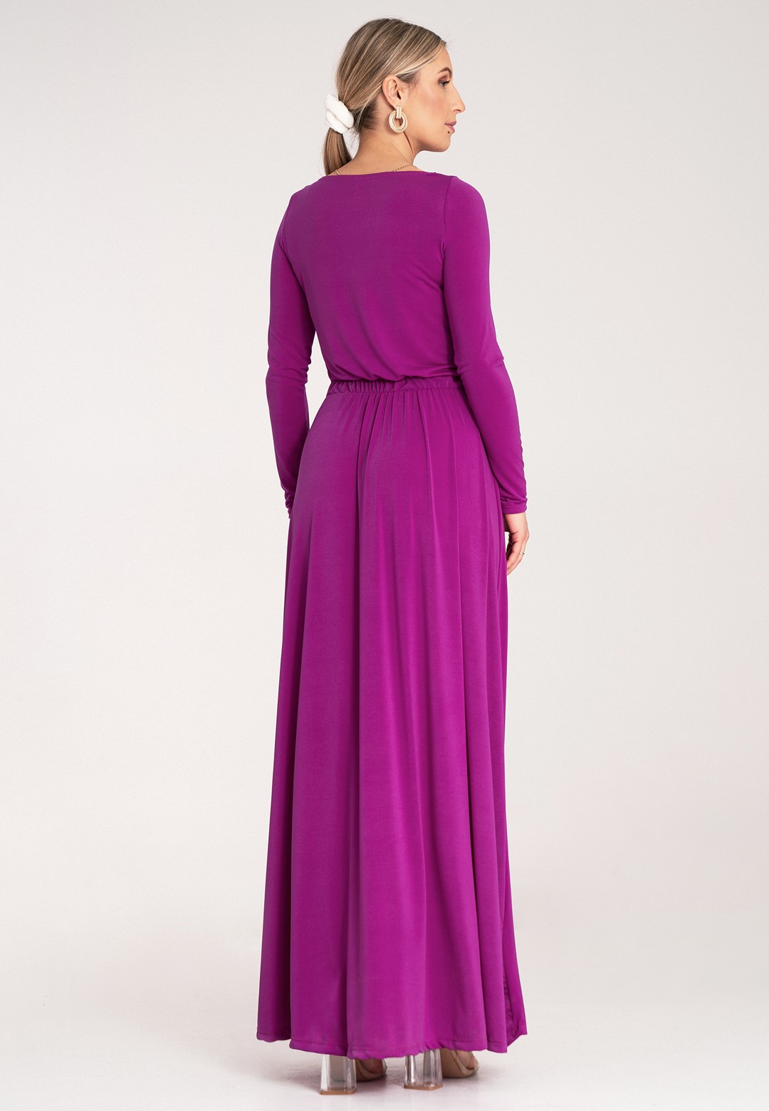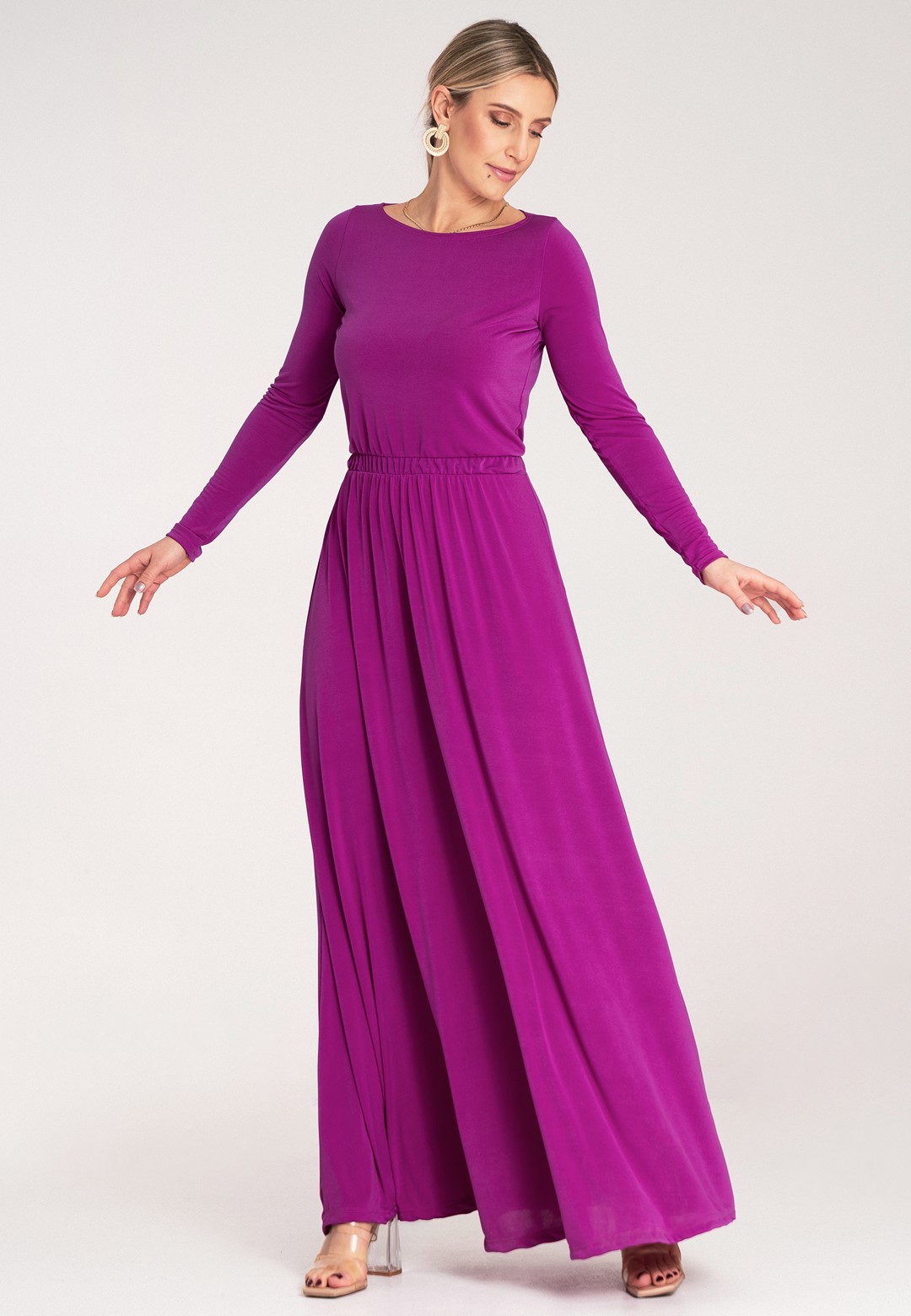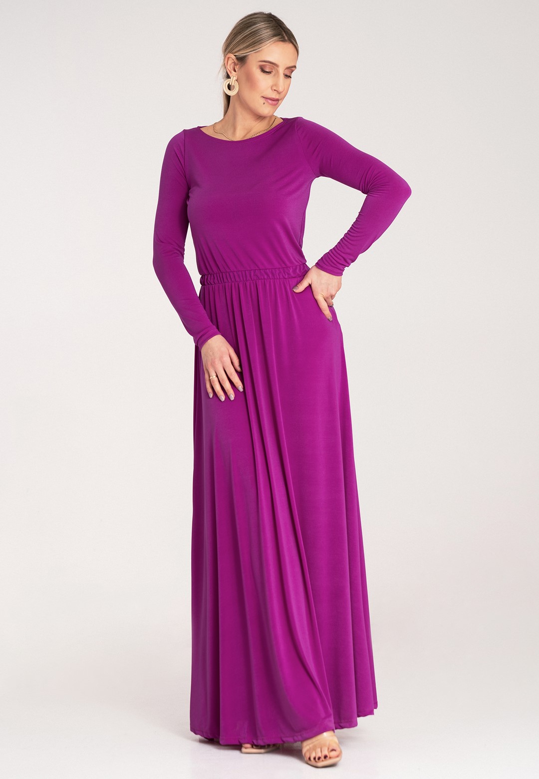 Sukienka fuksja to kwintesencja kobiecości i stylu. Wykonana z mieszanki poliestru i elastanu, nasza sukienka fuksja jest nie tylko efektowna, ale i praktyczna. Materiał jest przyjemny w dotyku, lekko elastyczny i zapewnia komfort noszenia przez wiele godzin. Półokrągły dekolt jest klasyczny i uniwersalny, idealnie pasuje do każdego typu sylwetki. Lekko dopasowana góra subtelnie podkreśla biust i ramiona. Długie wąskie rękawy dodają elegancji, idealne na chłodniejsze wieczory lub formalne wyjścia. Wszyta elastyczna gumka w pasie zapewnia doskonałe dopasowanie i wygodę, pięknie modelując talię. lekko rozkloszowany dół, lejący się materiał i długość maxi dodają lekkości i sprawiają, że sukienka fuksjowa zjawiskowo układa się w ruchu. Intensywny, modny kolor fuksja w połączeniu z lejącym się, długim fasonem sprawia, że jest to idealny wybór na każdą wyjątkową okazję.
