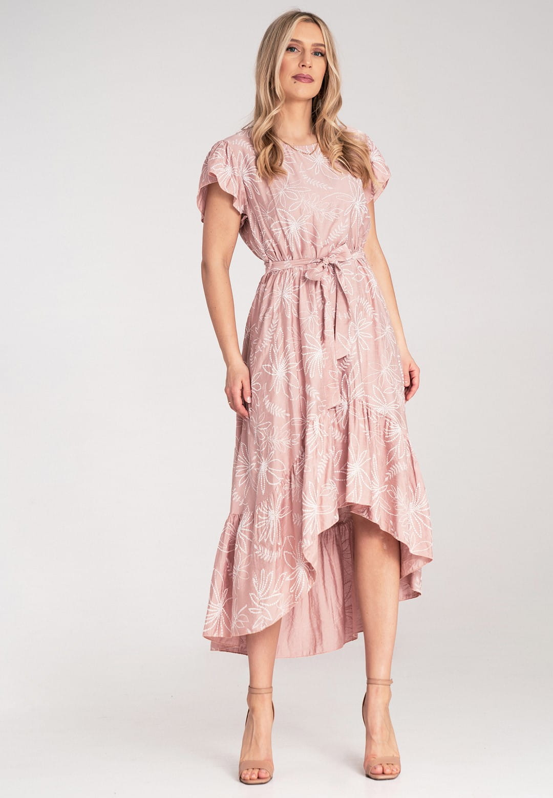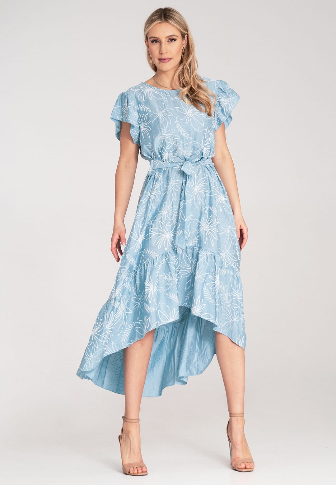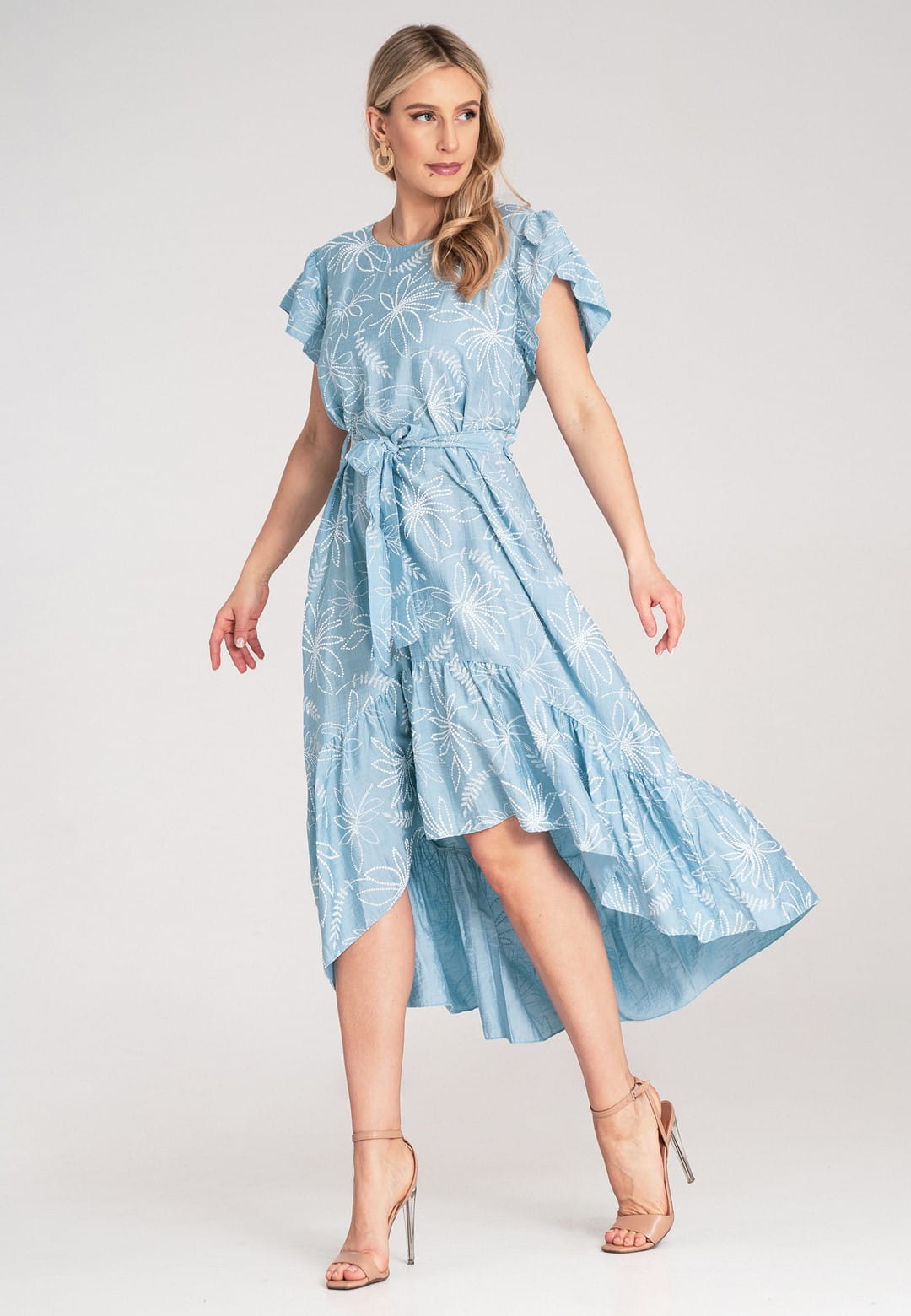 Sukienka midi w kwiatki łączy w sobie styl i oryginalność. Wykonana z wysokiej jakości mieszanki wiskozy i nylonu, sukienka jest przyjemna w dotyku, przewiewna i odporna na zagniecenia, zapewniając komfort noszenia przez cały dzień. Na całej powierzchni sukienki nadrukowany jest unikalny motyw kwiatowy. Ale to nie wszystko! Kwiaty posiadają wypukłą, gumową fakturę, która dodaje sukience trójwymiarowości i niepowtarzalnego charakteru. Okrągły dekolt jest klasyczny i elegancki, pasuje do wielu typów sylwetki i pozwala na swobodne dopasowanie biżuterii. Delikatne i zwiewne rękawy z falbanką dodają sukience lekkości i dziewczęcego uroku. Zapięcie z tyłu na guzik to praktyczne i dyskretne zapięcie, które ułatwia zakładanie i zdejmowanie sukienki. Pasek z tego samego materiału pozwala na idealne dopasowanie sukienki do sylwetki, podkreślając talię i tworząc kobiece kształty. Możesz go zawiązać na wiele sposobów, dodając stylizacji osobistego akcentu. Dół sukienki jest asymetryczny – przód jest krótszy niż tył, co nadaje jej nowoczesny i dynamiczny wygląd. Dodatkowa falbana na dole sprawia, że sukienka pięknie układa się w ruchu. Długość midi, idealna długość do kolan lub nieco za kolano, która jest zarówno elegancka, jak i praktyczna. Sprawdzi się na wiele okazji. Sukienka w kwiatki midi to strzał w dziesiątkę dla każdej kobiety ceniącej sobie oryginalność i komfort.