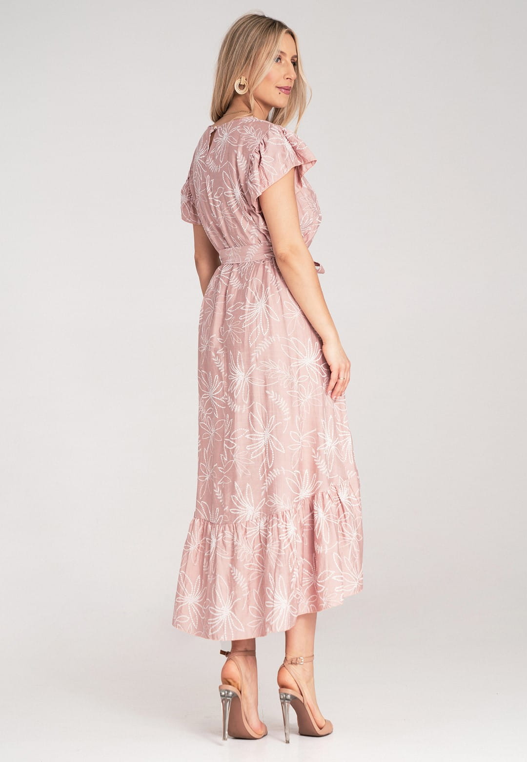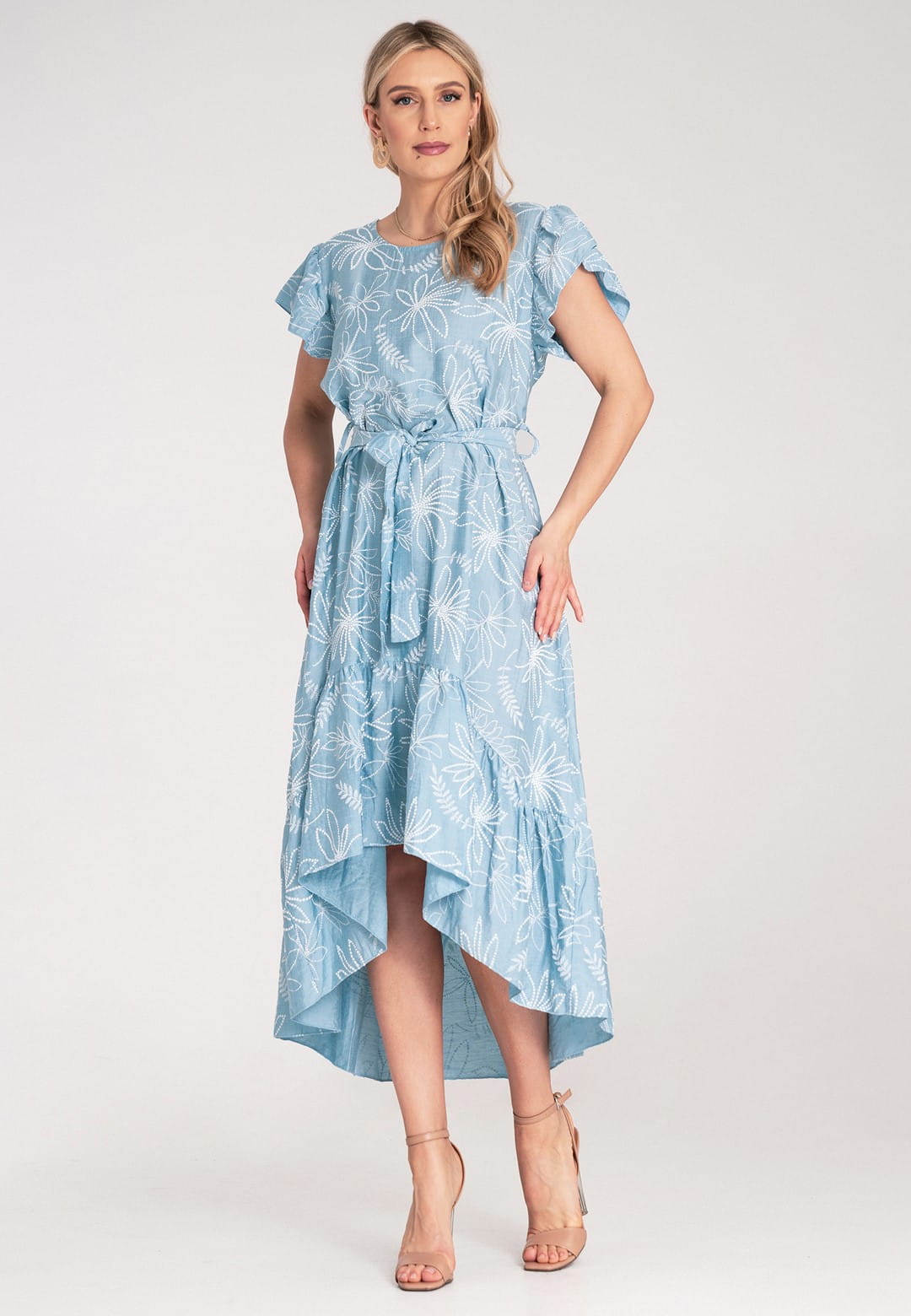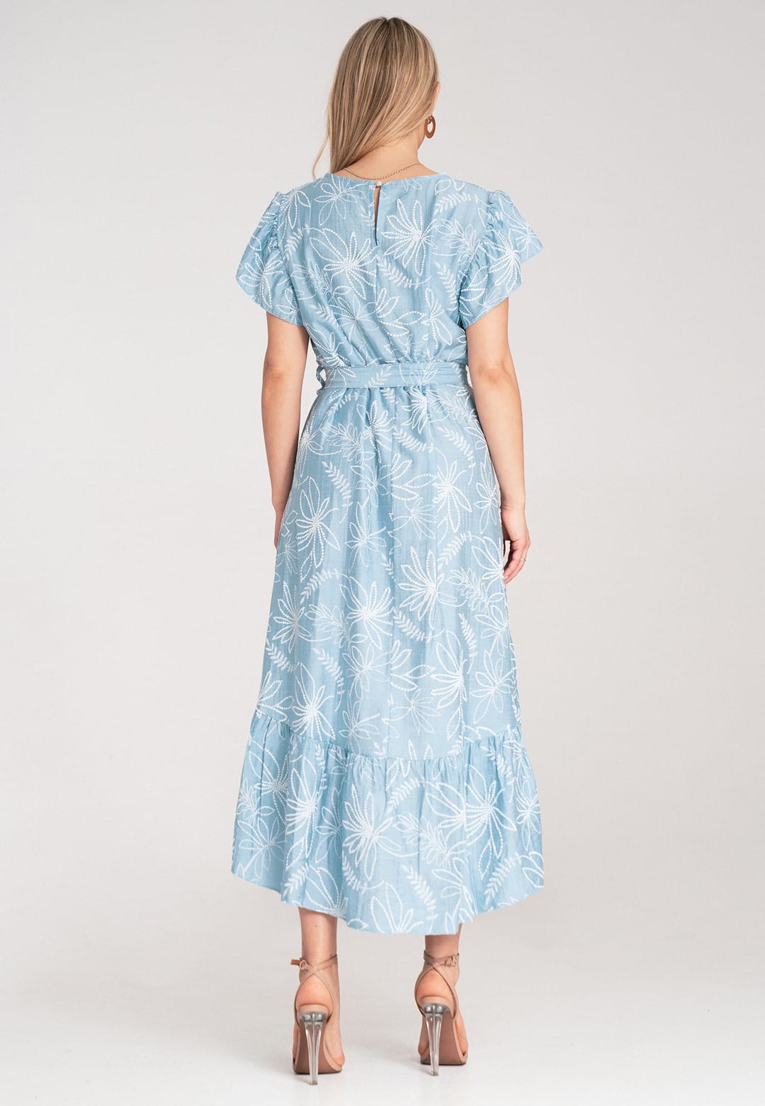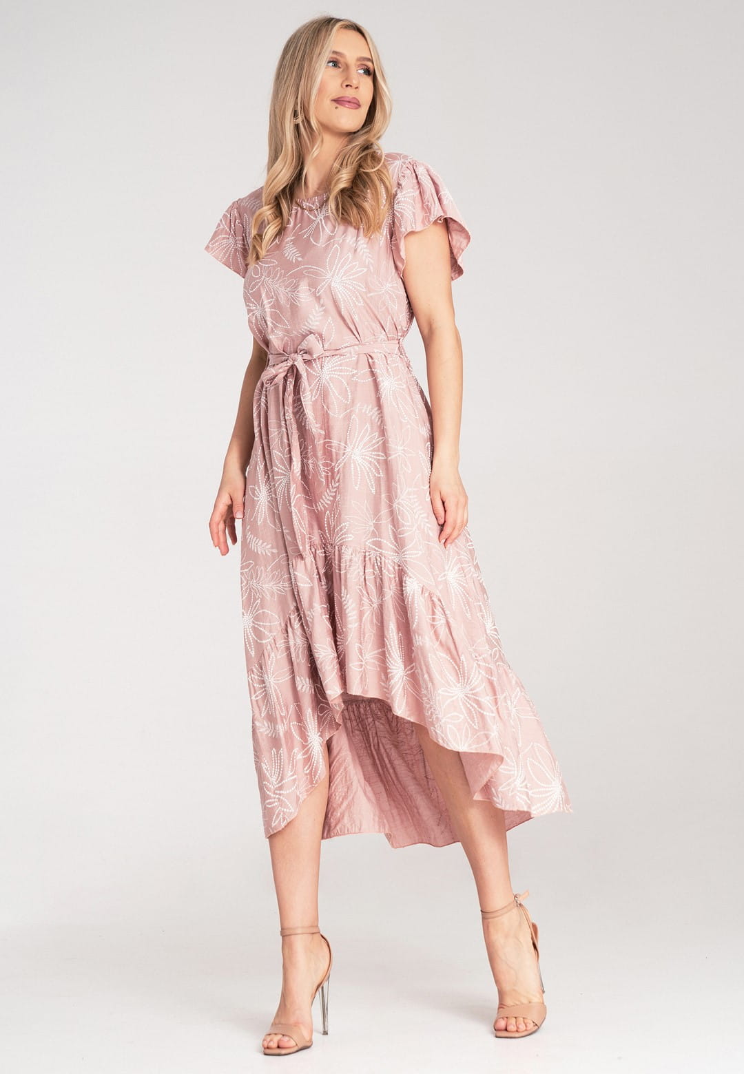 Sukienka midi w kwiatki łączy w sobie styl i oryginalność. Wykonana z wysokiej jakości mieszanki wiskozy i nylonu, sukienka jest przyjemna w dotyku, przewiewna i odporna na zagniecenia, zapewniając komfort noszenia przez cały dzień. Na całej powierzchni sukienki nadrukowany jest unikalny motyw kwiatowy. Ale to nie wszystko! Kwiaty posiadają wypukłą, gumową fakturę, która dodaje sukience trójwymiarowości i niepowtarzalnego charakteru. Okrągły dekolt jest klasyczny i elegancki, pasuje do wielu typów sylwetki i pozwala na swobodne dopasowanie biżuterii. Delikatne i zwiewne rękawy z falbanką dodają sukience lekkości i dziewczęcego uroku. Zapięcie z tyłu na guzik to praktyczne i dyskretne zapięcie, które ułatwia zakładanie i zdejmowanie sukienki. Pasek z tego samego materiału pozwala na idealne dopasowanie sukienki do sylwetki, podkreślając talię i tworząc kobiece kształty. Możesz go zawiązać na wiele sposobów, dodając stylizacji osobistego akcentu. Dół sukienki jest asymetryczny – przód jest krótszy niż tył, co nadaje jej nowoczesny i dynamiczny wygląd. Dodatkowa falbana na dole sprawia, że sukienka pięknie układa się w ruchu. Długość midi, idealna długość do kolan lub nieco za kolano, która jest zarówno elegancka, jak i praktyczna. Sprawdzi się na wiele okazji. Sukienka w kwiatki midi to strzał w dziesiątkę dla każdej kobiety ceniącej sobie oryginalność i komfort.
