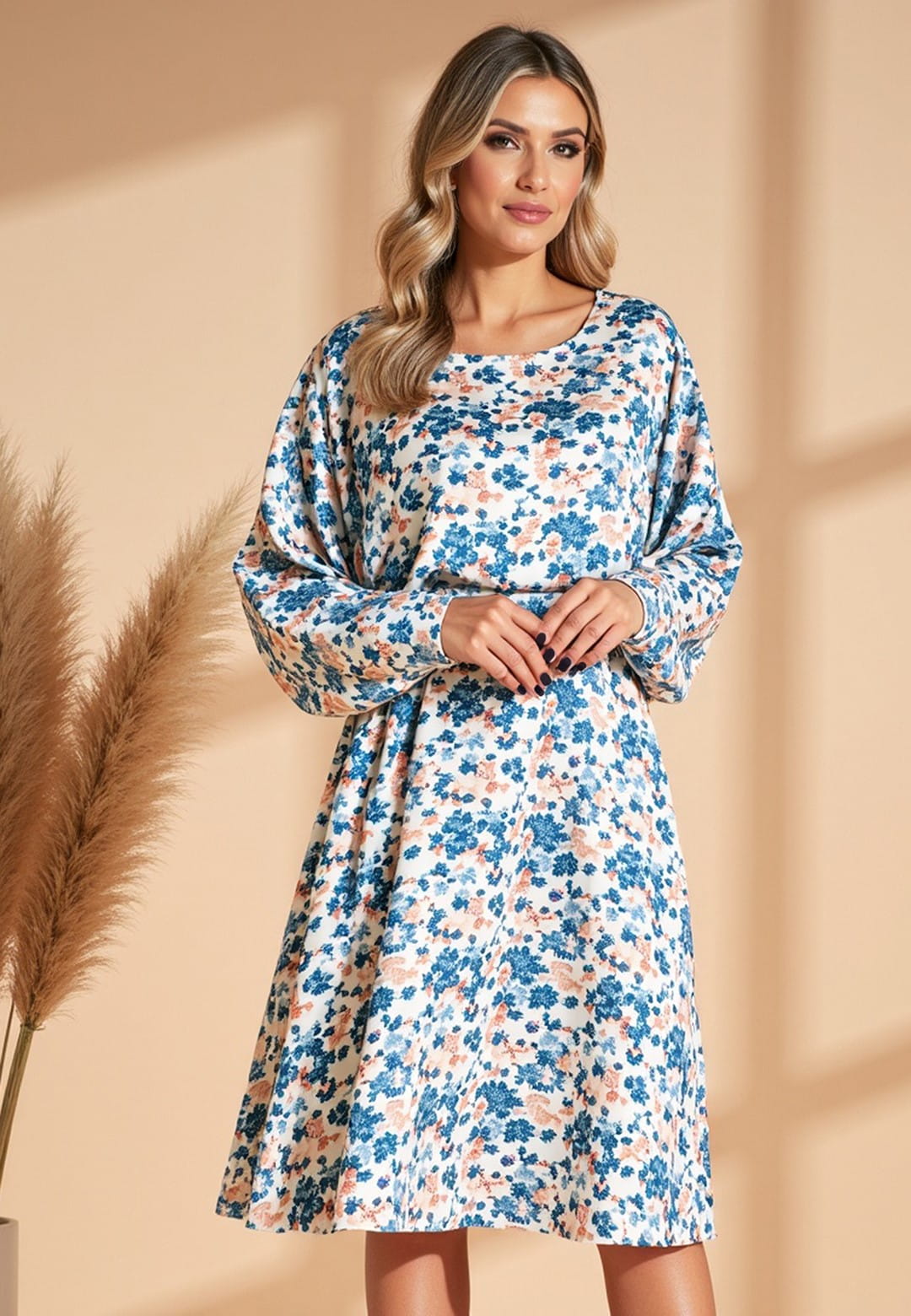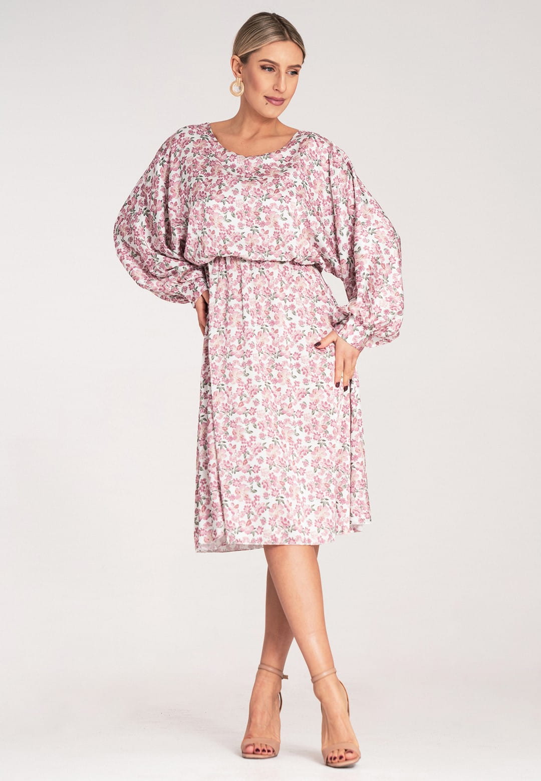Sukienka midi w kwiaty łączy elegancję z wygodą. Połączenie poliestru i elastanu gwarantuje, że sukienka jest nie tylko trwała i odporna na zagniecenia, ale także elastyczna i świetnie układa się na ciele. Kwiatowy wzór z wysokiej jakości satyny jako delikatny i elegancki motyw, który dodaje blasku i kobiecości. Okrągły dekolt jest klasyczny i uniwersalny, pasuje do każdego typu sylwetki. Góra w stylu kimono to luźny, stylowy krój, który zapewnia swobodę ruchów. Długie, szerokie rękawy zakończone mankietem jako eleganckie wykończenie, które dodaje szyku. Gumka i niewielkie marszczenie w talii podkreśla figurę i zapewnia komfort noszenia. Lekko rozkloszowany dół dodaje lekkości i subtelności. Długość midi optycznie wydłuża nogi oraz dobrze leży na różnych typach sylwetek. Sukienka w kwiaty midi to idealny wybór na co dzień, do biura, na spacer, na spotkanie z przyjaciółmi, na randkę czy na weekendowy wypad. Możesz ją nosić z sandałami, espadrylami lub balerinami. Dodaj do tego swoje ulubione dodatki i stwórz niepowtarzalny look!