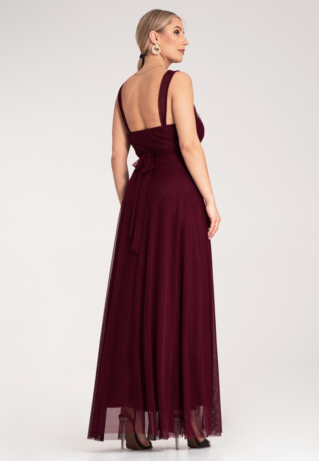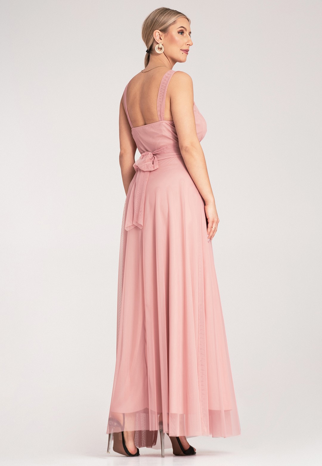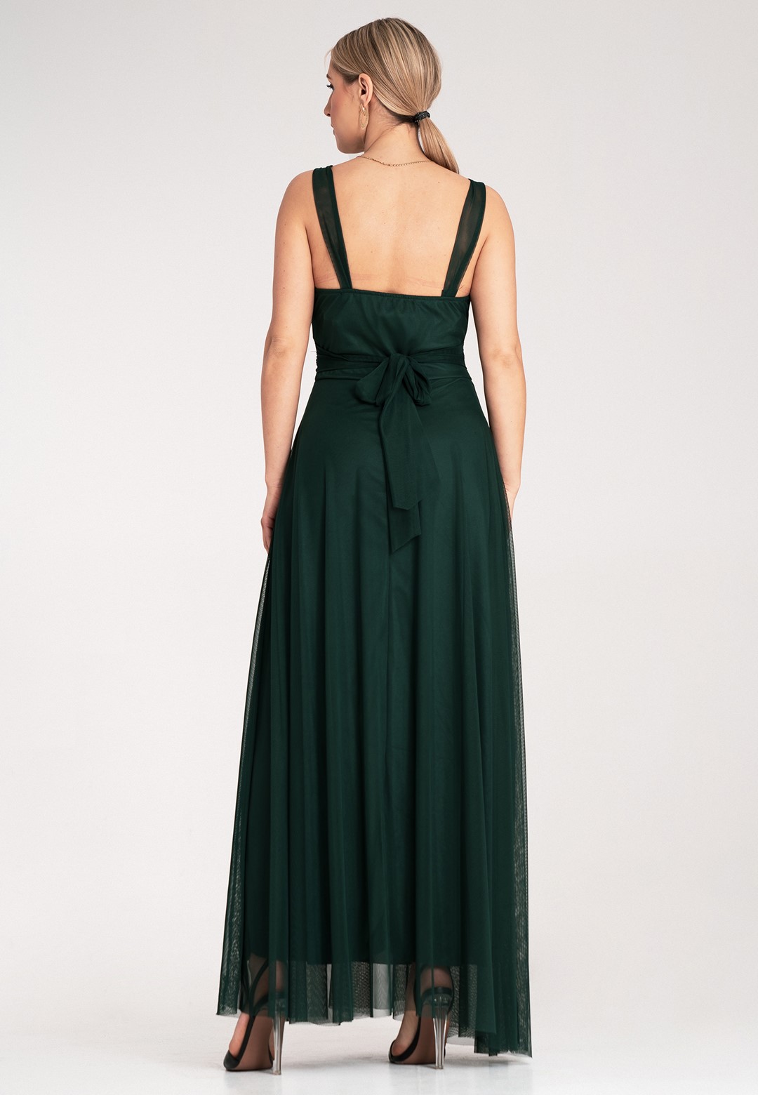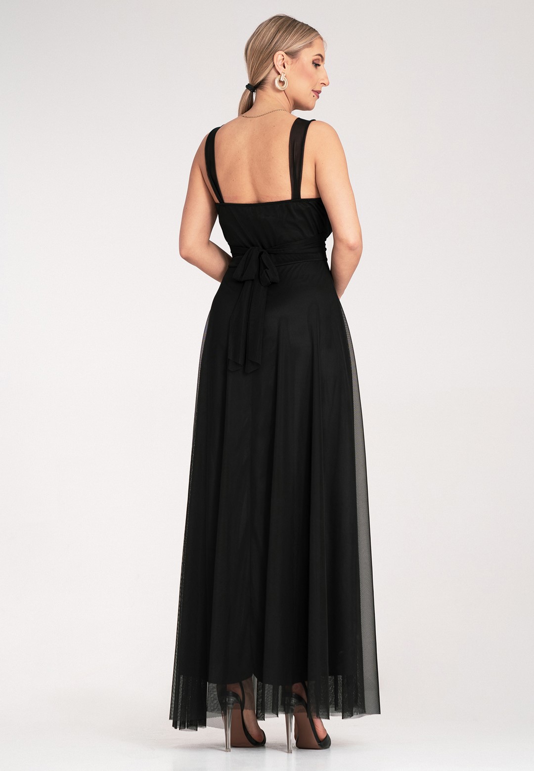 Sukienka wieczorowa długa łączy klasyczną elegancję z nowoczesnym, zmysłowym akcentem. Materiał z którego została wykonana to połączenie poliestru i elastanu, dzięki czemu sukienka jest trwała, lekko elastyczna i świetnie się prezentuje przez całą noc. Klasyczna góra z akcentem posiada elegancki okrągły dekolt i wygodne, szerokie ramiączka, które zapewniają komfort noszenia. Subtelnie marszczona góra dodaje szyku i delikatności. Zmysłowo odkryte plecy to element, który przyciąga wzrok i nadaje kreacji nowoczesnego charakteru. Szeroki pas w talii z tego samego materiału pięknie modeluje sylwetkę i jest wiązany z tyłu, co pozwala na idealne dopasowanie do figury. Zwiewny, szyfonowy dół sukienki dodaje jej lekkości, eteryczności i kobiecości, sprawiając, że pięknie układa się w ruchu, falując i nadając stylizacji delikatności. Długość maxi daje elegancki wygląd, maskuje niedoskonałości figury i zapewnia komfort. Całość jest podszyta miękką podszewką, co zapewnia dyskrecję i wygodę. Sukienka długa wieczorowa idealna na wyjątkowe okazje takie jak bale, wesela czy studniówki.
