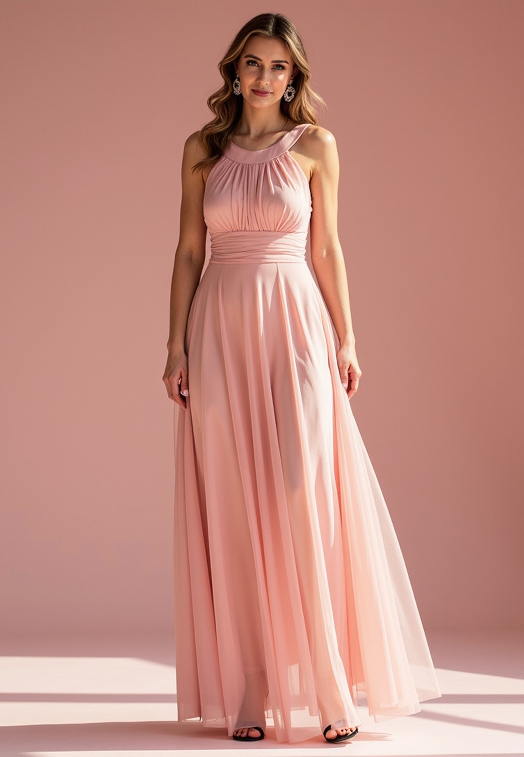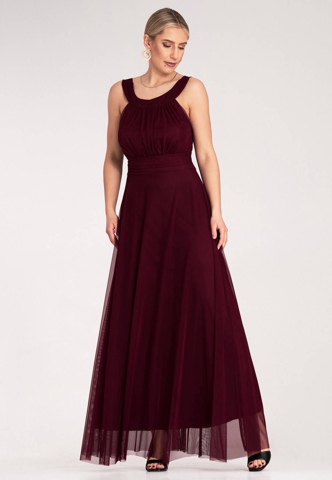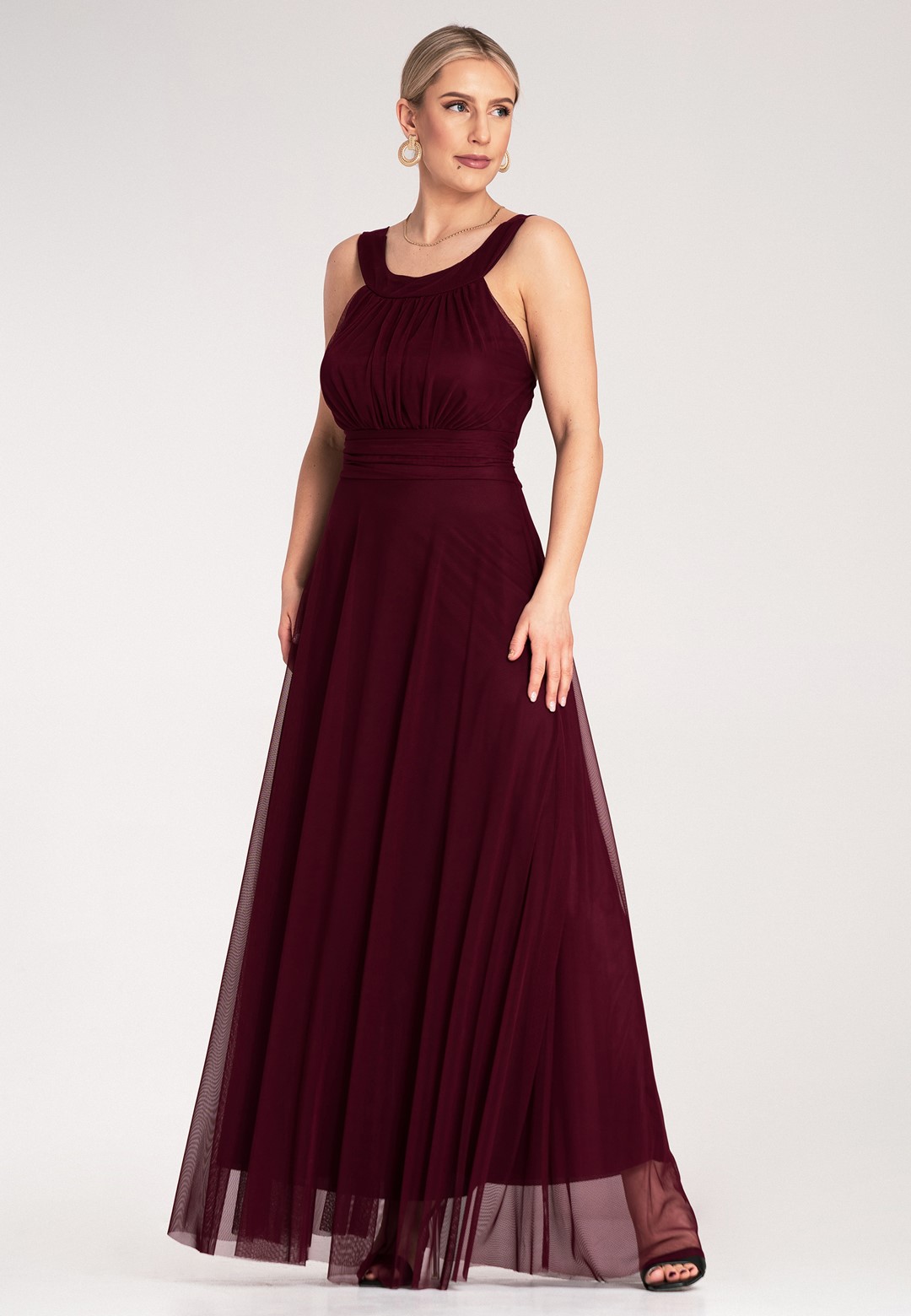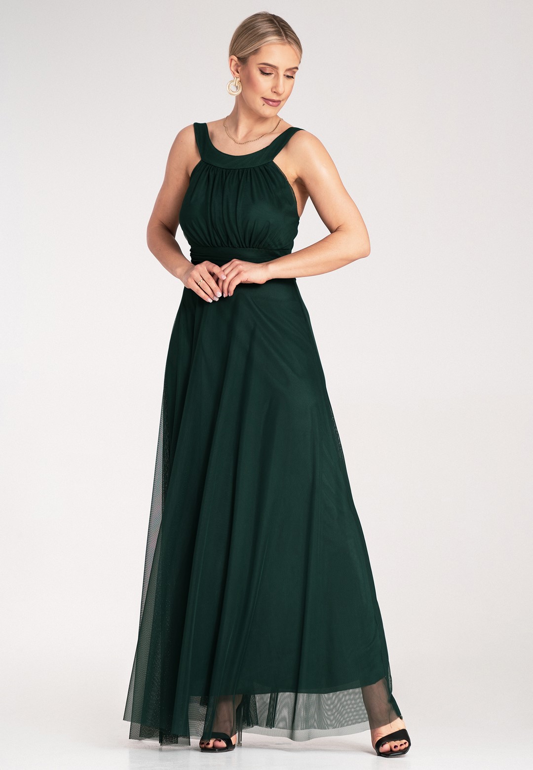 Sukienka wieczorowa długa łączy klasyczną elegancję z nowoczesnym, zmysłowym akcentem. Materiał z którego została wykonana to połączenie poliestru i elastanu, dzięki czemu sukienka jest trwała, lekko elastyczna i świetnie się prezentuje przez całą noc. Klasyczna góra z akcentem posiada elegancki okrągły dekolt i wygodne, szerokie ramiączka, które zapewniają komfort noszenia. Subtelnie marszczona góra dodaje szyku i delikatności. Zmysłowo odkryte plecy to element, który przyciąga wzrok i nadaje kreacji nowoczesnego charakteru. Szeroki pas w talii z tego samego materiału pięknie modeluje sylwetkę i jest wiązany z tyłu, co pozwala na idealne dopasowanie do figury. Zwiewny, szyfonowy dół sukienki dodaje jej lekkości, eteryczności i kobiecości, sprawiając, że pięknie układa się w ruchu, falując i nadając stylizacji delikatności. Długość maxi daje elegancki wygląd, maskuje niedoskonałości figury i zapewnia komfort. Całość jest podszyta miękką podszewką, co zapewnia dyskrecję i wygodę. Sukienka długa wieczorowa idealna na wyjątkowe okazje takie jak bale, wesela czy studniówki.