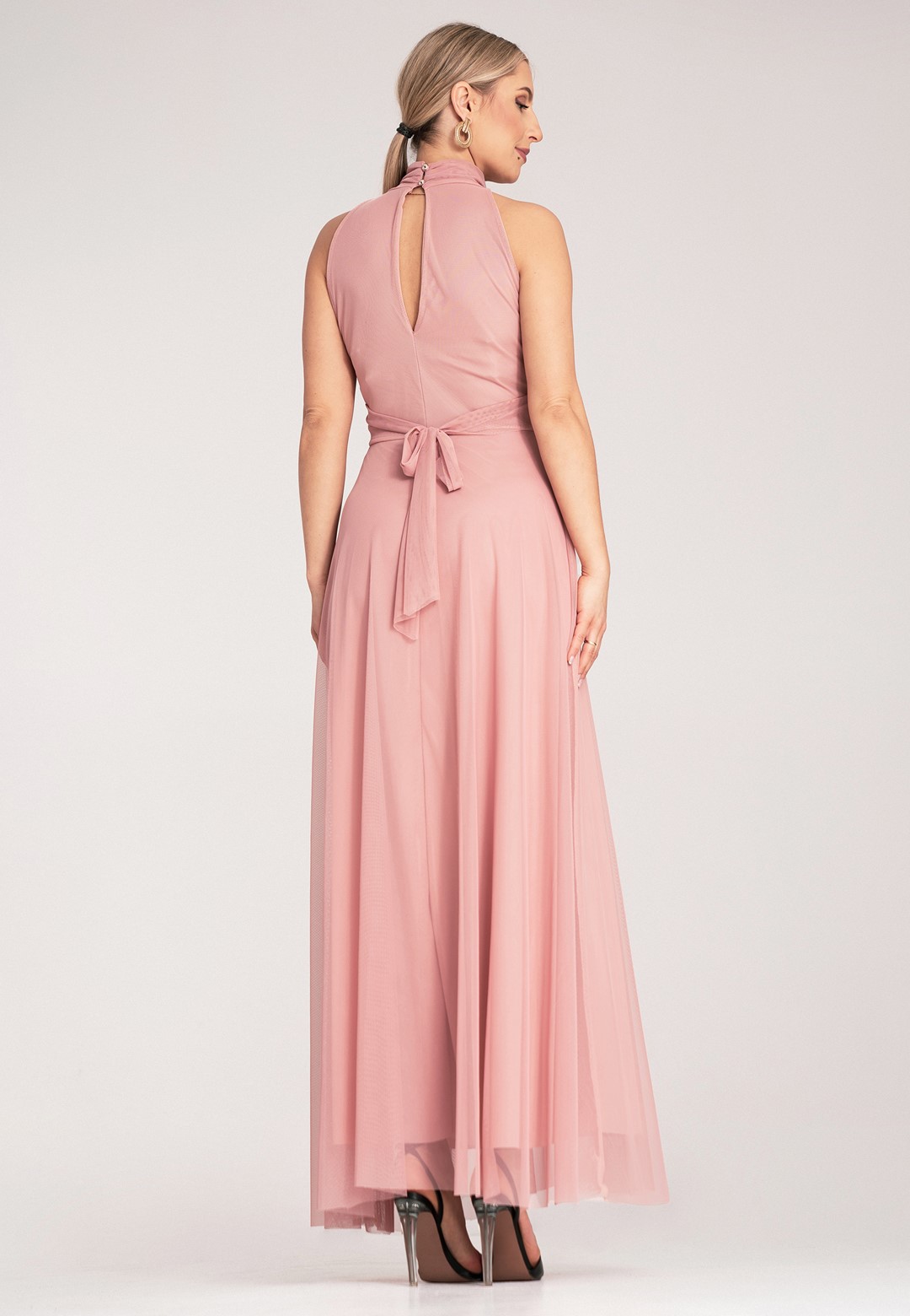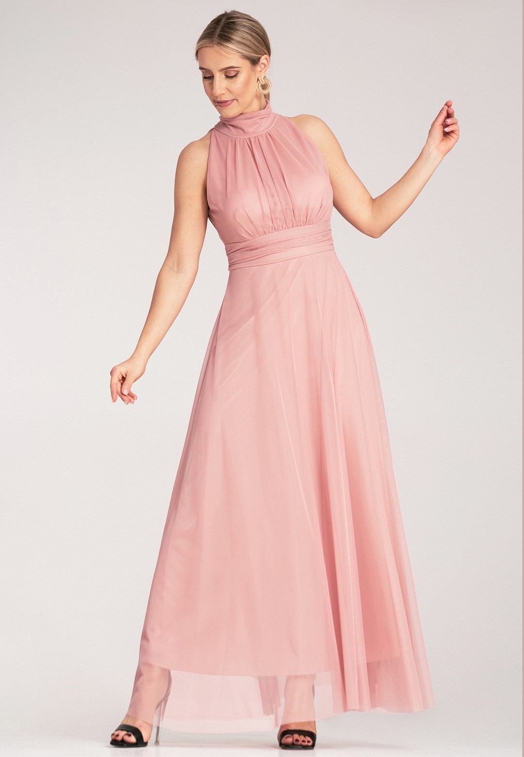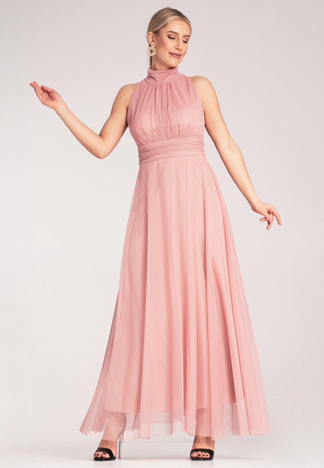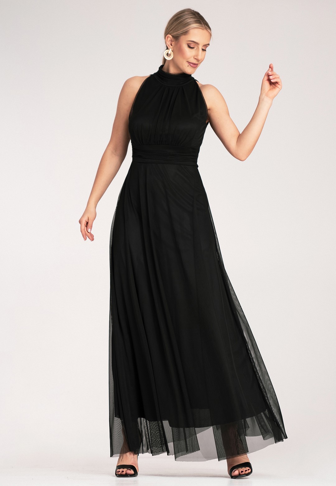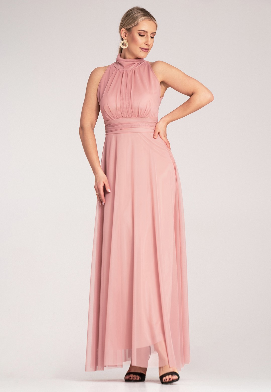 Sukienka z dekoltem halter elegancka i zjawiskowa. Ta długa sukienka typu halter łączy wyrafinowaną elegancję z lekkością i komfortem noszenia, gwarantując, że poczujesz się wyjątkowo. Dekolt typu halter elegancko odsłania ramiona i plecy. Jest on wygodnie zapinany z tyłu na dwa guziczki, co ułatwia zakładanie. Wycięcie na plecach w efektowną łezkę dodaje subtelności i zmysłowości. Delikatne marszczenia na dopasowanej górnej części pięknie modelują sylwetkę. Szeroki pas z materiału podkreśla talię, a ozdobne wiązanie z tyłu dodaje uroku. Dół wykonany z lekkiego, szyfonowego materiału zapewnia spektakularny ruch i swobodę. Długość maxi to klasyczna długość do ziemi, idealna na wieczorowe wyjścia. Wewnętrzna podszewka zapewnia komfort i krycie. Sukienka dekolt halter jest stworzona dla Ciebie, łączy klasyczną elegancję z najnowszymi trendami. Idealna na wesele, studniówkę, przyjęcie czy romantyczną kolację.