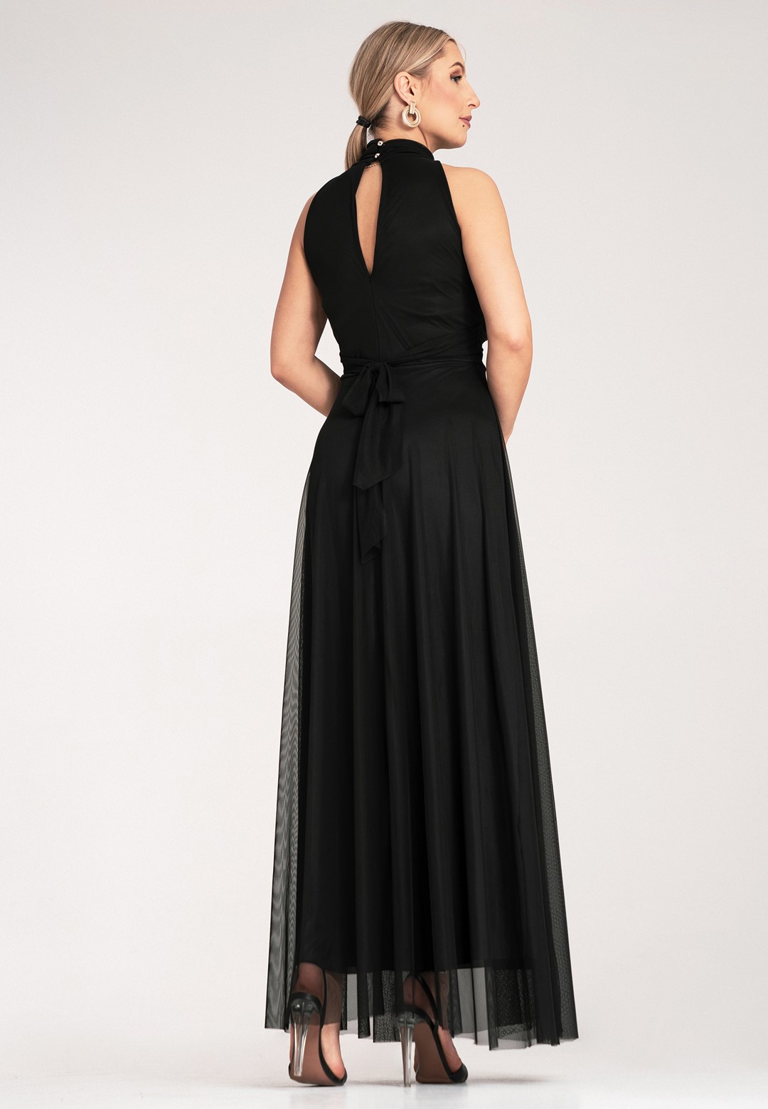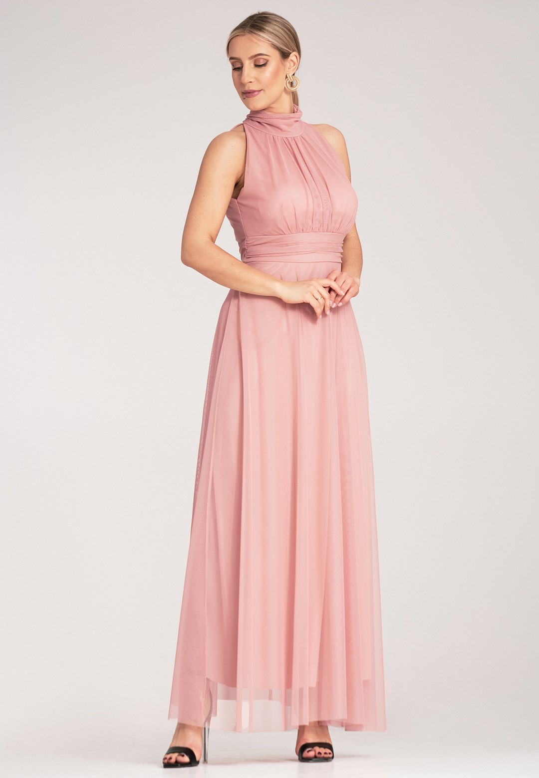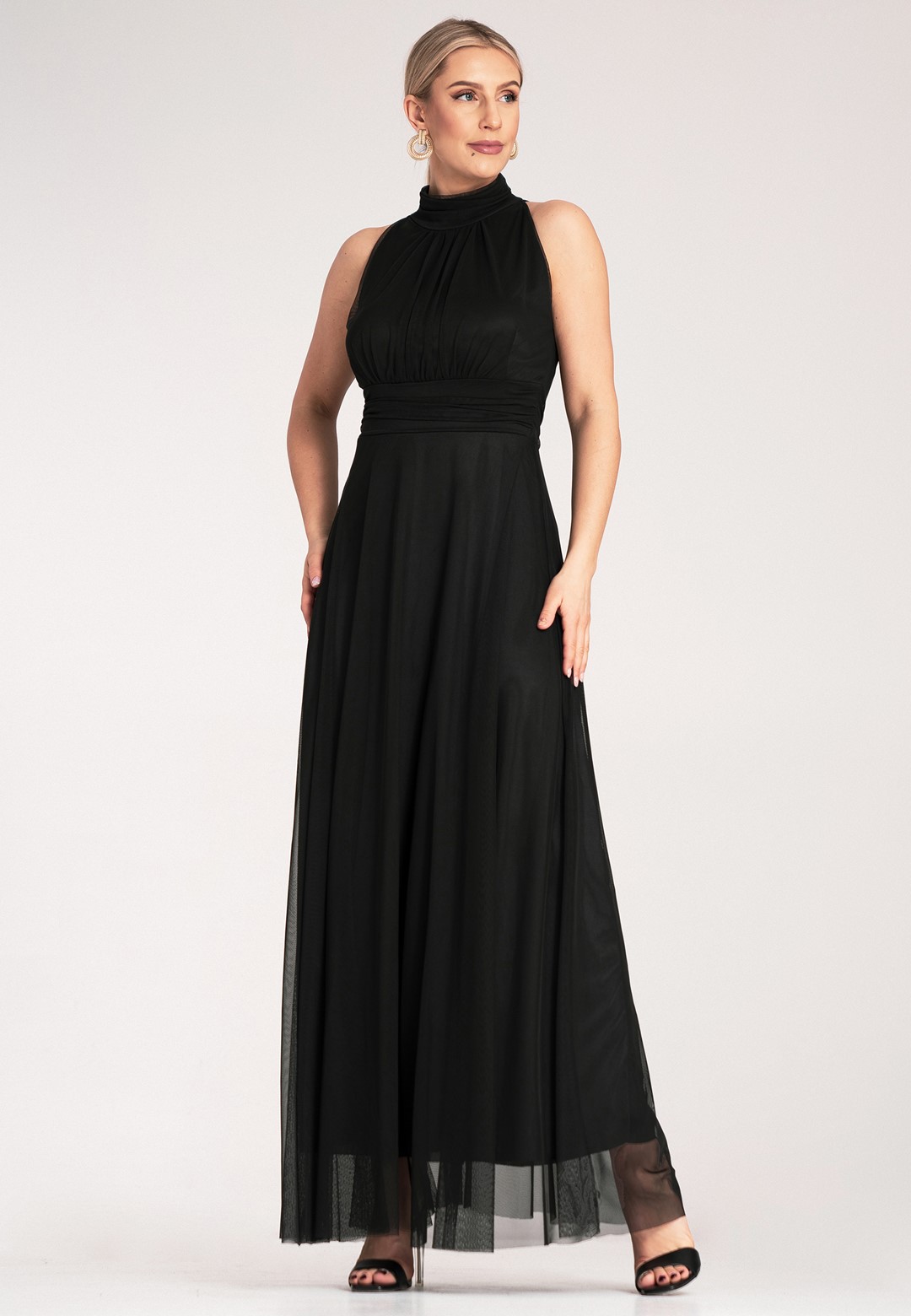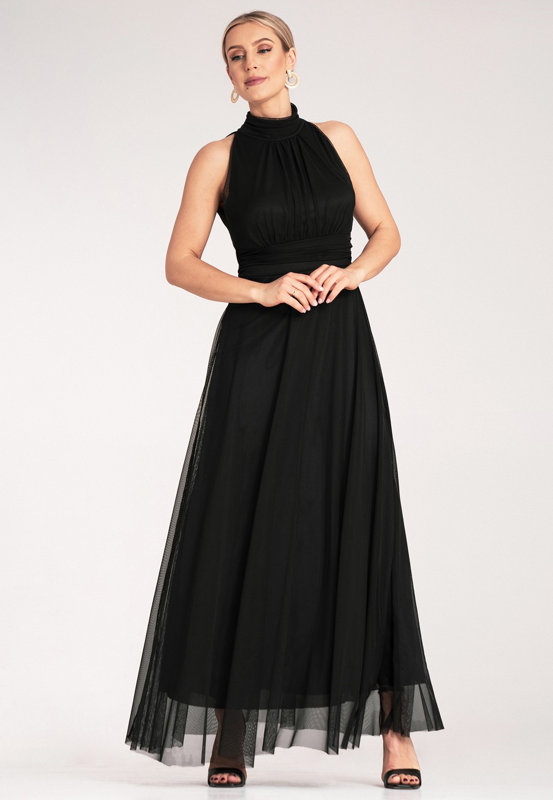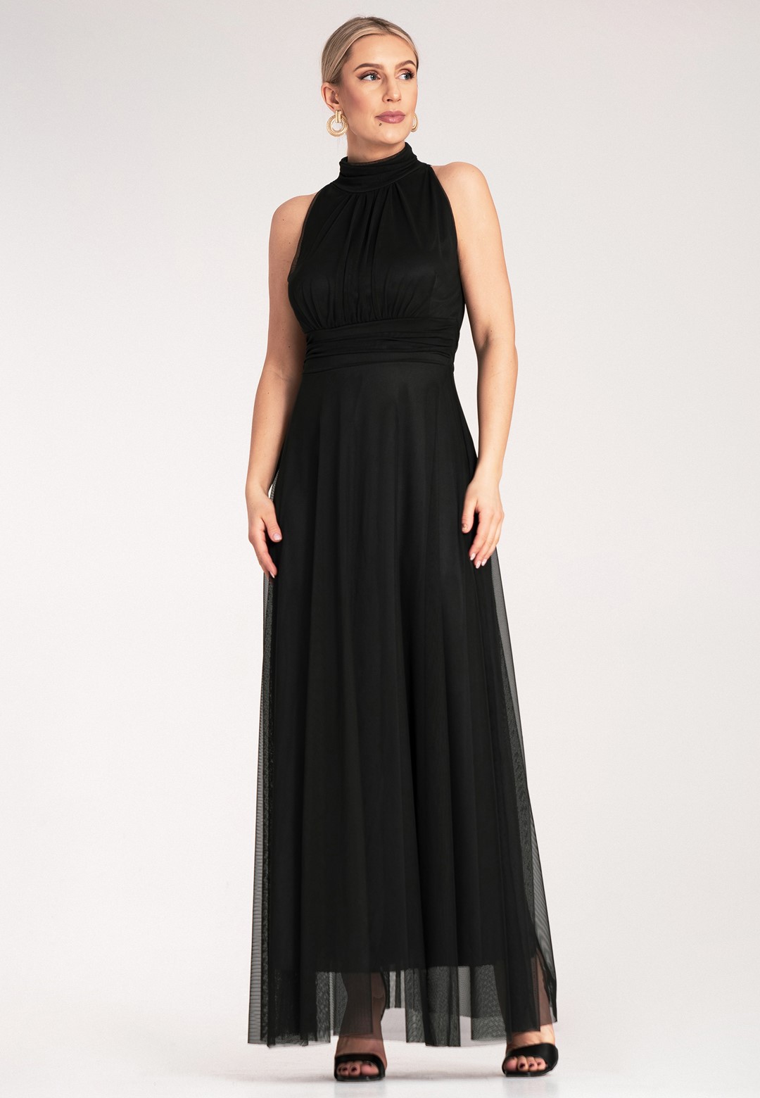 Sukienka z dekoltem halter elegancka i zjawiskowa. Ta długa sukienka typu halter łączy wyrafinowaną elegancję z lekkością i komfortem noszenia, gwarantując, że poczujesz się wyjątkowo. Dekolt typu halter elegancko odsłania ramiona i plecy. Jest on wygodnie zapinany z tyłu na dwa guziczki, co ułatwia zakładanie. Wycięcie na plecach w efektowną łezkę dodaje subtelności i zmysłowości. Delikatne marszczenia na dopasowanej górnej części pięknie modelują sylwetkę. Szeroki pas z materiału podkreśla talię, a ozdobne wiązanie z tyłu dodaje uroku. Dół wykonany z lekkiego, szyfonowego materiału zapewnia spektakularny ruch i swobodę. Długość maxi to klasyczna długość do ziemi, idealna na wieczorowe wyjścia. Wewnętrzna podszewka zapewnia komfort i krycie. Sukienka dekolt halter jest stworzona dla Ciebie, łączy klasyczną elegancję z najnowszymi trendami. Idealna na wesele, studniówkę, przyjęcie czy romantyczną kolację.